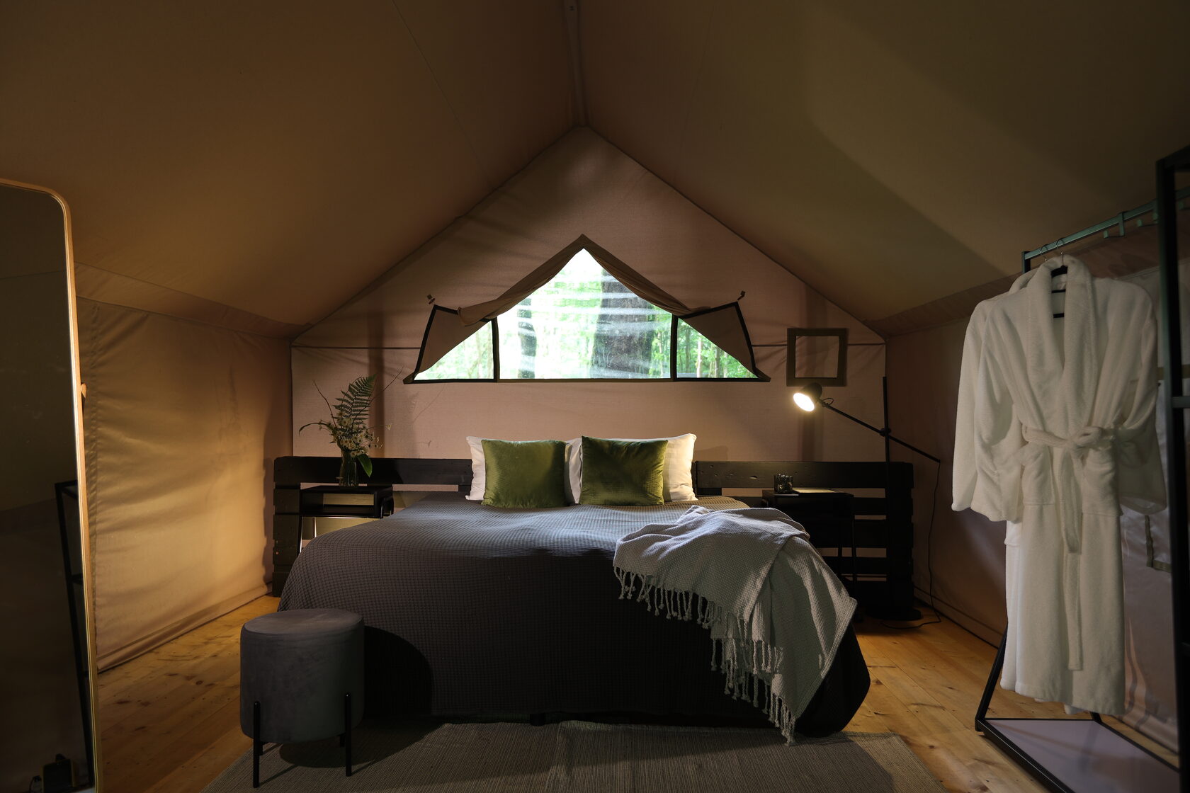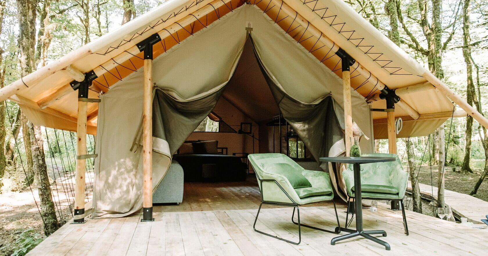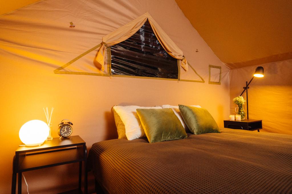 Гостям для размещения предлагаются комфортабельные палатки и шатры в стиле сафари. Палатки находятся в отдалении друг от друга, а значит, отдыхающим никто не будет мешать. Все шатры укомплектованы необходимой мебелью – есть двухспальная кровать, большое зеркало, стеллажи для хранения, также предусмотрен собственный санузел и душ, проведено электричество. На территории кемпинга работает ресторан, в распоряжении гостей русская баня с массажным кабинетом, для автовладельцев обустроена охраняемая парковка, а юные гости могут весело провести время на игровой площадке.