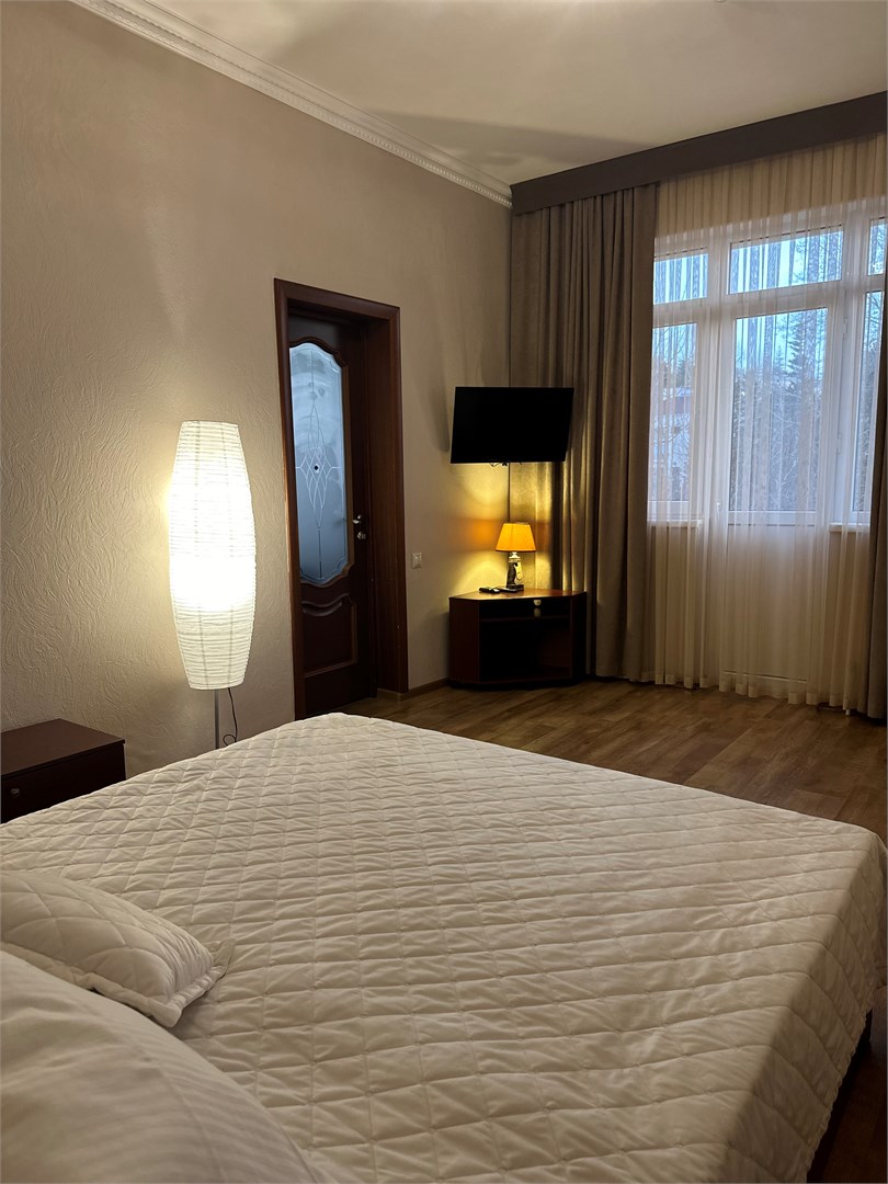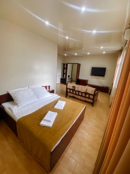 В номере: вешалка, диван раскладной, зеркало, кровать двуспальная, прикроватные тумбочки, стол, столик журнальный, стулья, шкаф-купе, кондиционер, мини-холодильник, набор посуды, телевизор ЖК, электрочайник