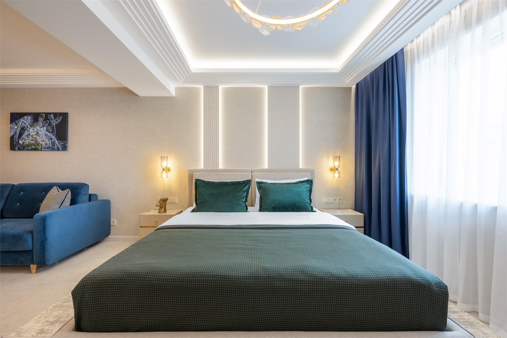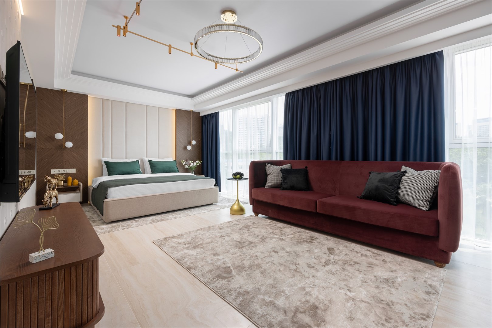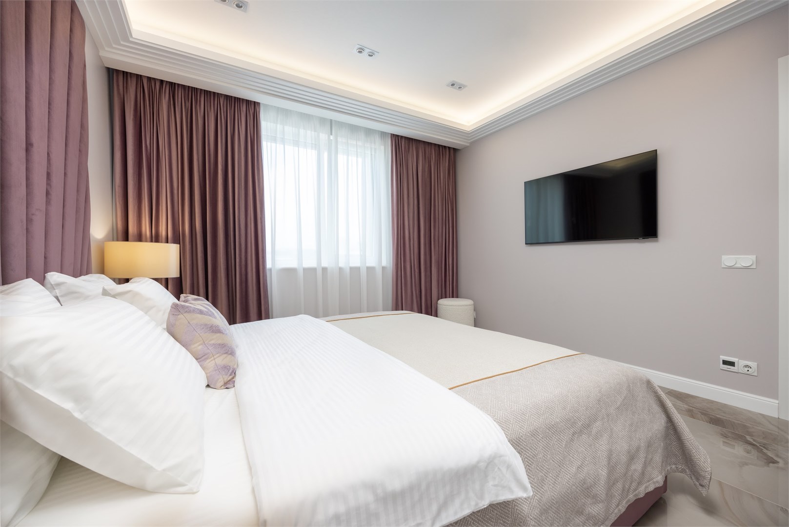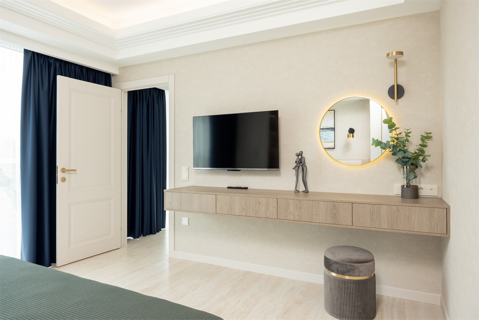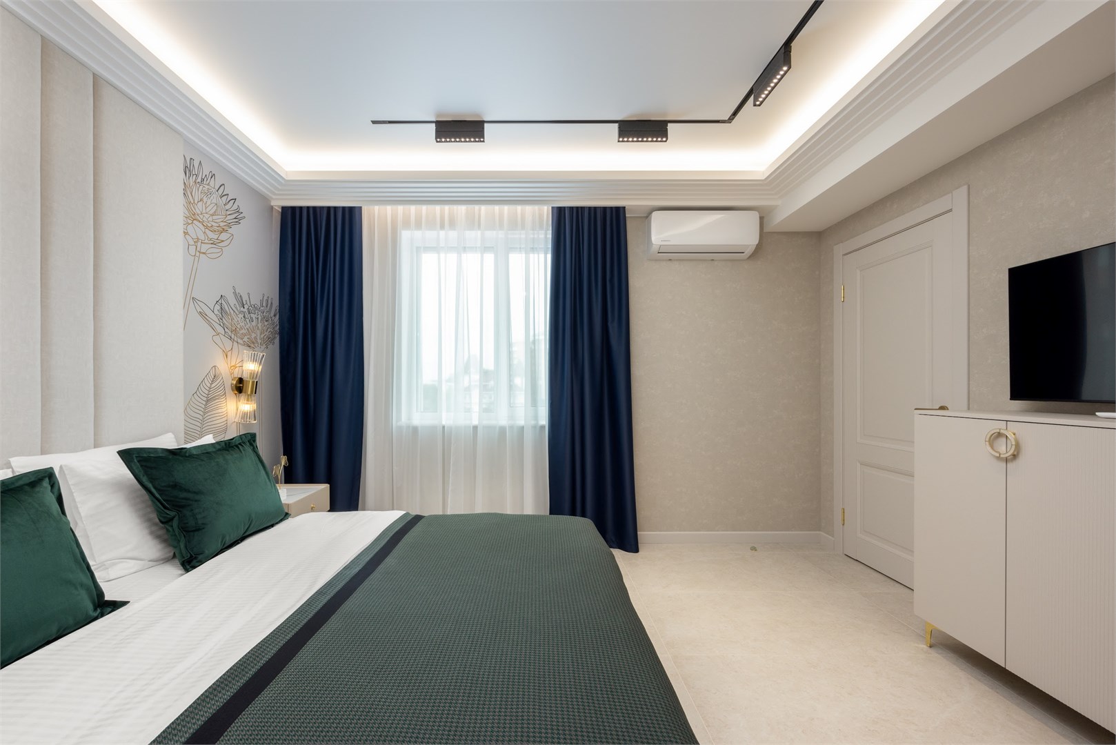 В номере: диван раскладной, зеркало, комод, кровать двуспальная, прикроватные тумбочки, стол, стулья, шкаф, гладильная доска, кондиционер, кофемашина, микроволновая печь, набор посуды, плита электрическая, стиральная машина, сушилка для белья, телевизор ЖК, утюг, электрочайник