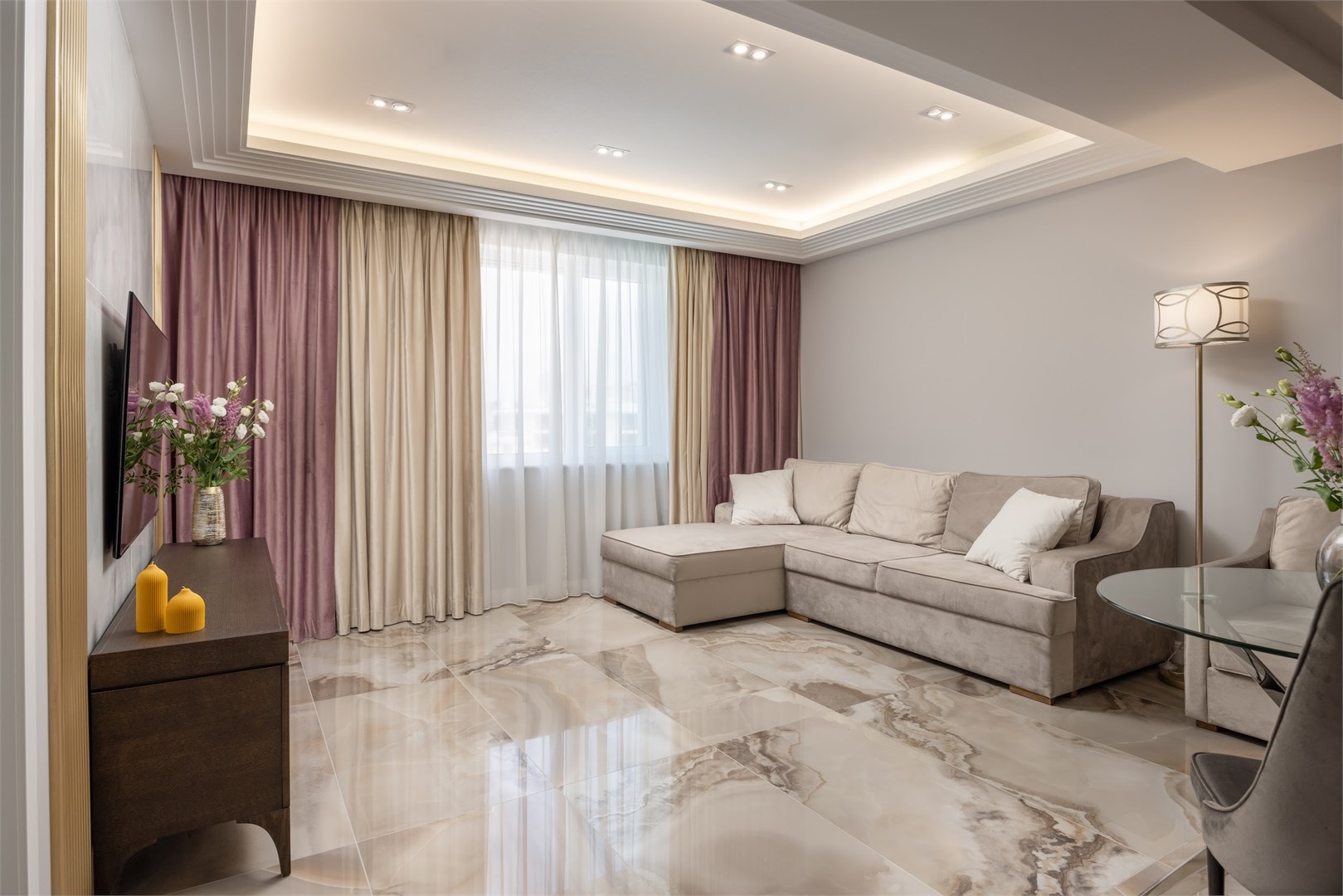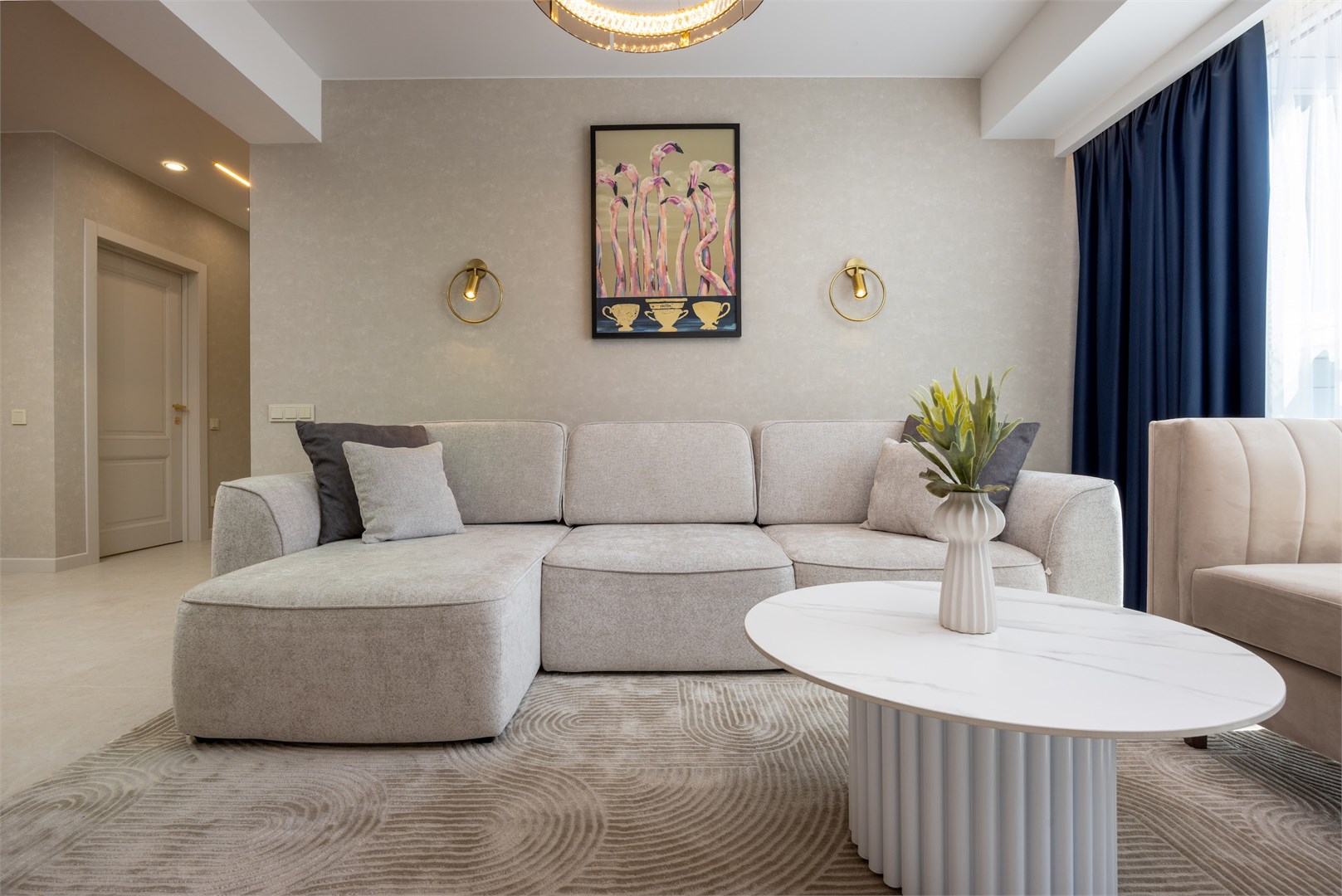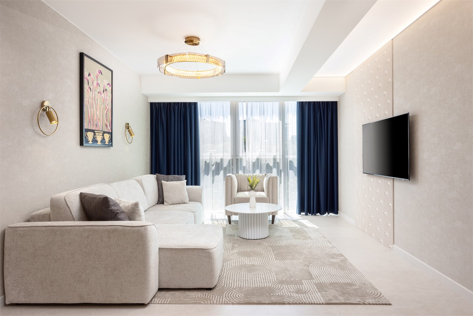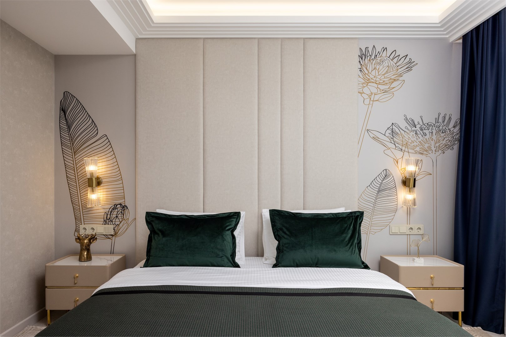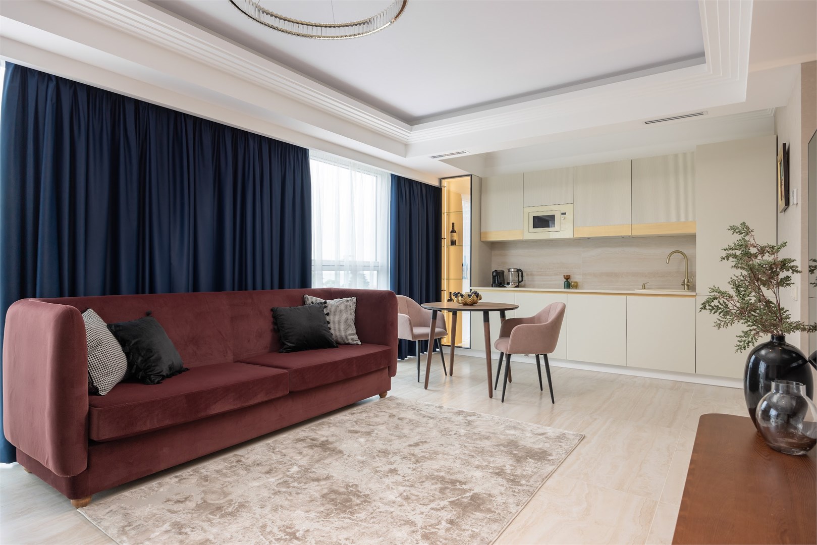 В номере: диван раскладной, зеркало, комод, кровать двуспальная, прикроватные тумбочки, стол, стулья, шкаф, гладильная доска, кондиционер, кофемашина, микроволновая печь, набор посуды, плита электрическая, стиральная машина, сушилка для белья, телевизор ЖК, утюг, электрочайник