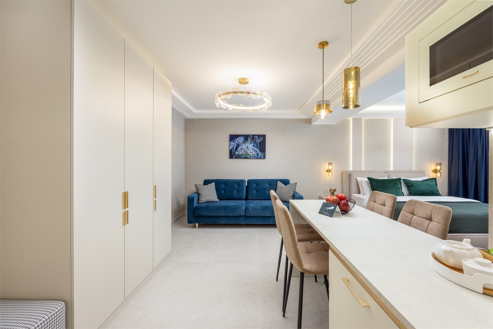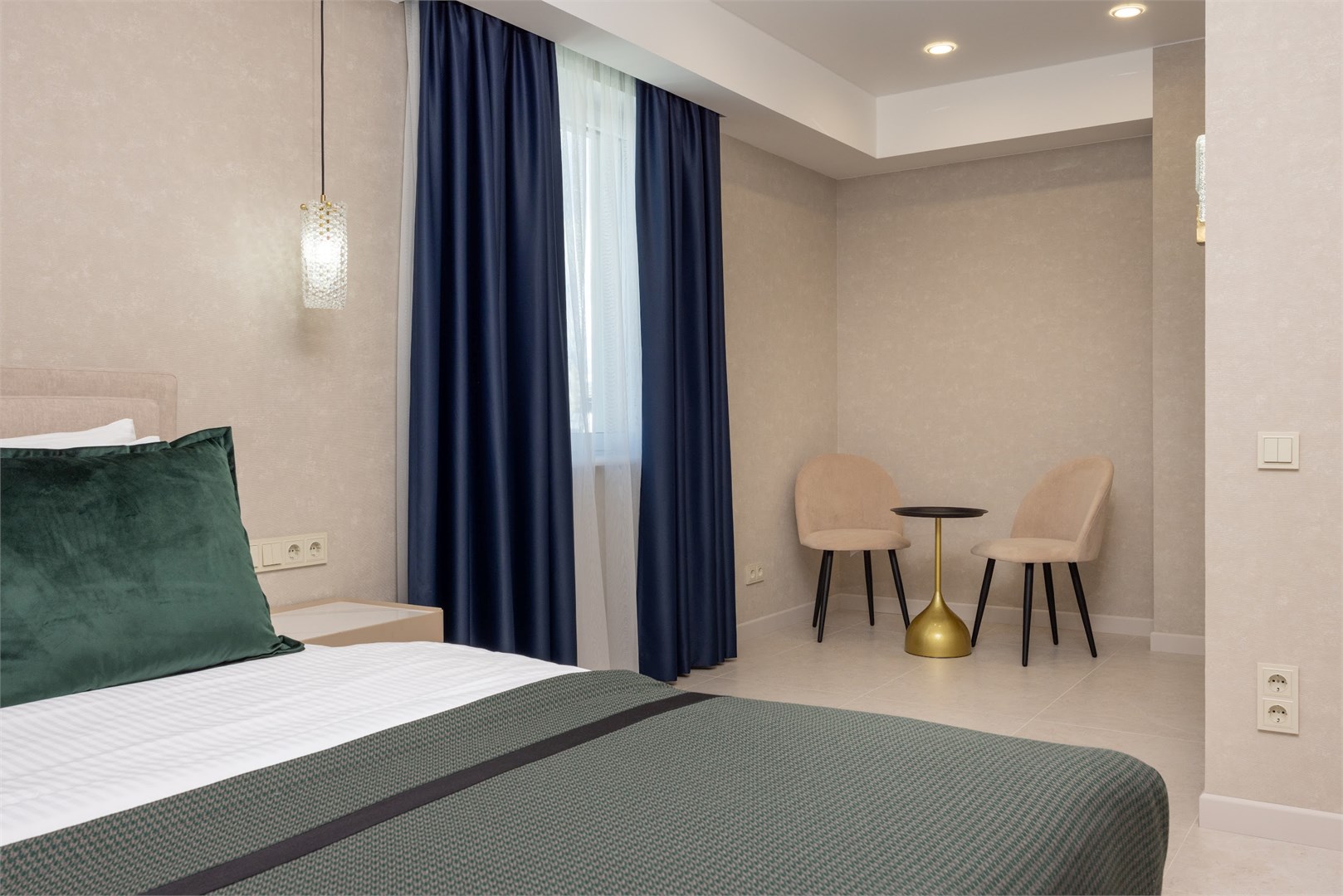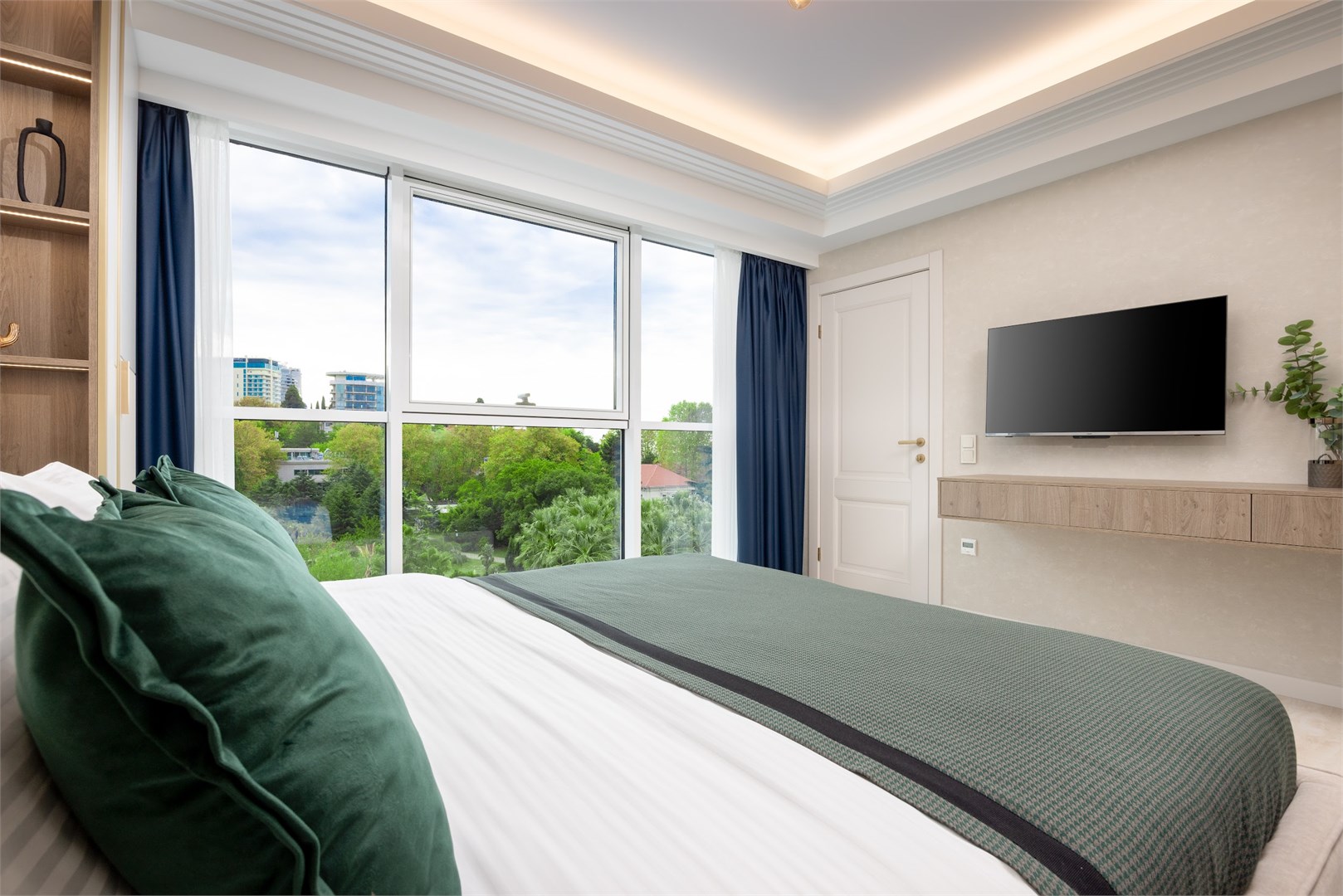 Море тут близко — до него всего чуть более 100 м. Рядом вся инфраструктура: кафе, рестораны, магазины, скверы, пляжи, банки, сувениры, остановки общественного транспорта, набережная.В элегантных апартаментах созданы все условия для комфортного пребывания — есть удобная, современная мебель, санузел с душевой кабиной, феном и косметическими средствами, кондиционер, мини-холодильник, телевизор, утюг, гладильная доска, чай/кофе, посуда, кофеварка, чайник, микроволновая печь, сейф, мини-бар. Уборка — в определённые дни. У каждого гостя персональный доступ в интернет по сети Wi-Fi.Для гостей на машине есть возможность оставить её на парковке около апарт-отеля. К услугам постояльцев: прачечная, камера хранения, ускоренная регистрация заезда/отъезда.Апарт-отель обеспечивает исключительный сервис и индивидуальный подход к каждому гостю.