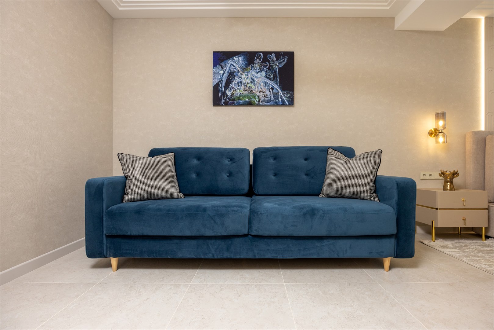 В номере: вешалка, диван раскладной, зеркало, кровать двуспальная, кухонная мебель, прикроватные тумбочки, стол, стулья, шкаф, гладильная доска, кондиционер, кофемашина, микроволновая печь, мини-холодильник, набор посуды, пляжные полотенца, сейф, стиральная машина, сушилка для белья, телевизор ЖК, утюг, электрочайник