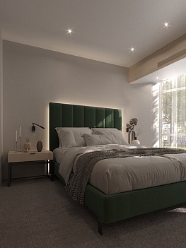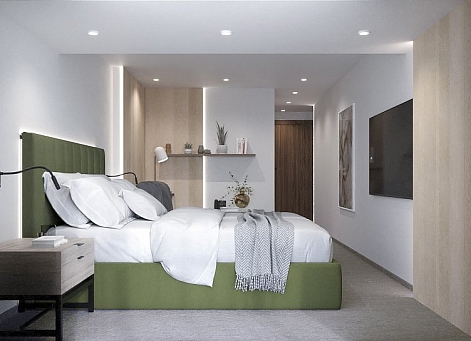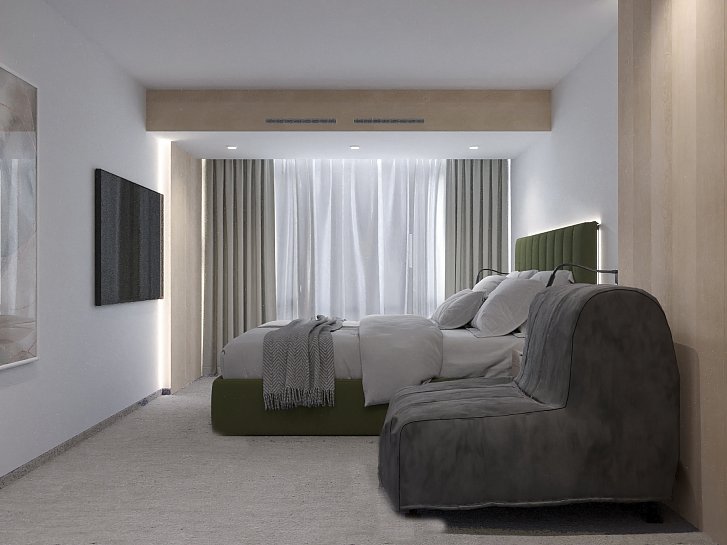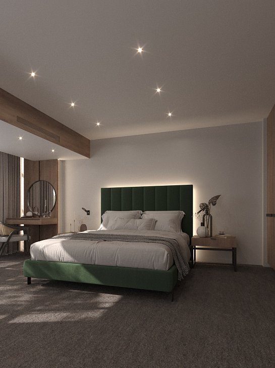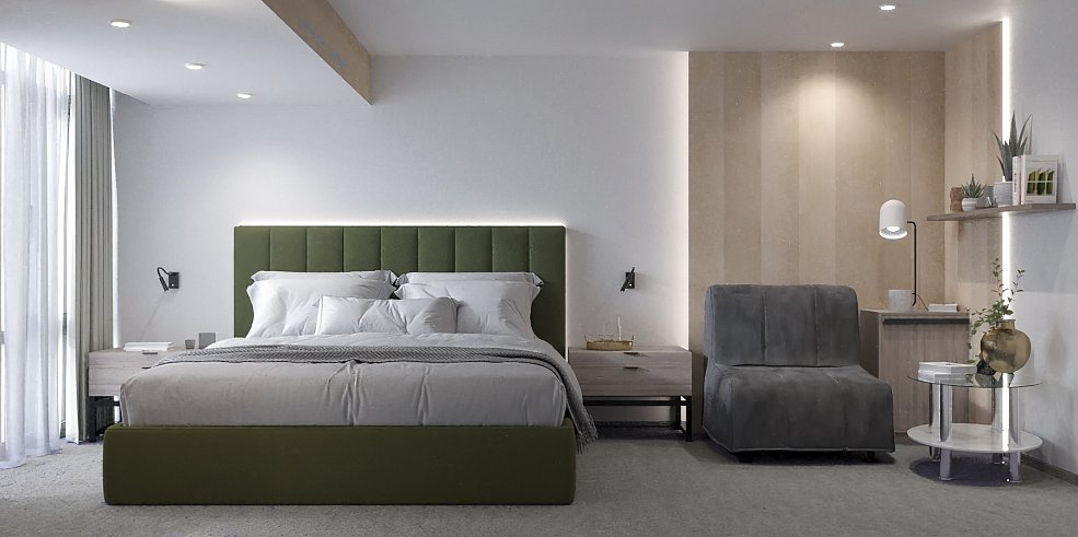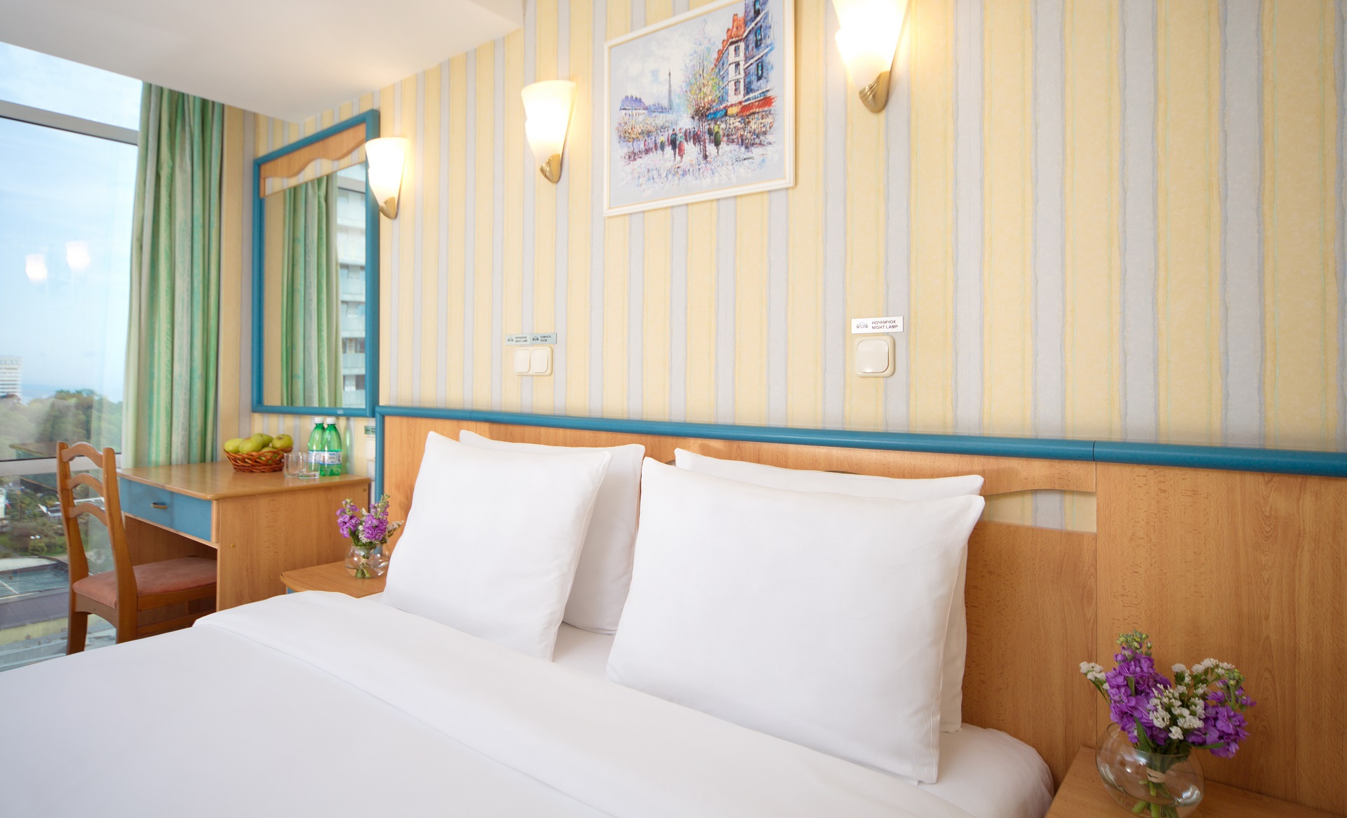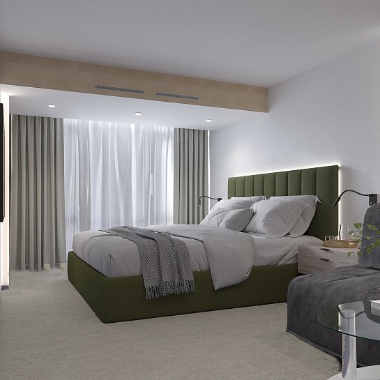 В номере: зеркало, кресло-кровать, кровать двуспальная, прикроватные тумбочки, столик журнальный, кондиционер, телевизор, телефон