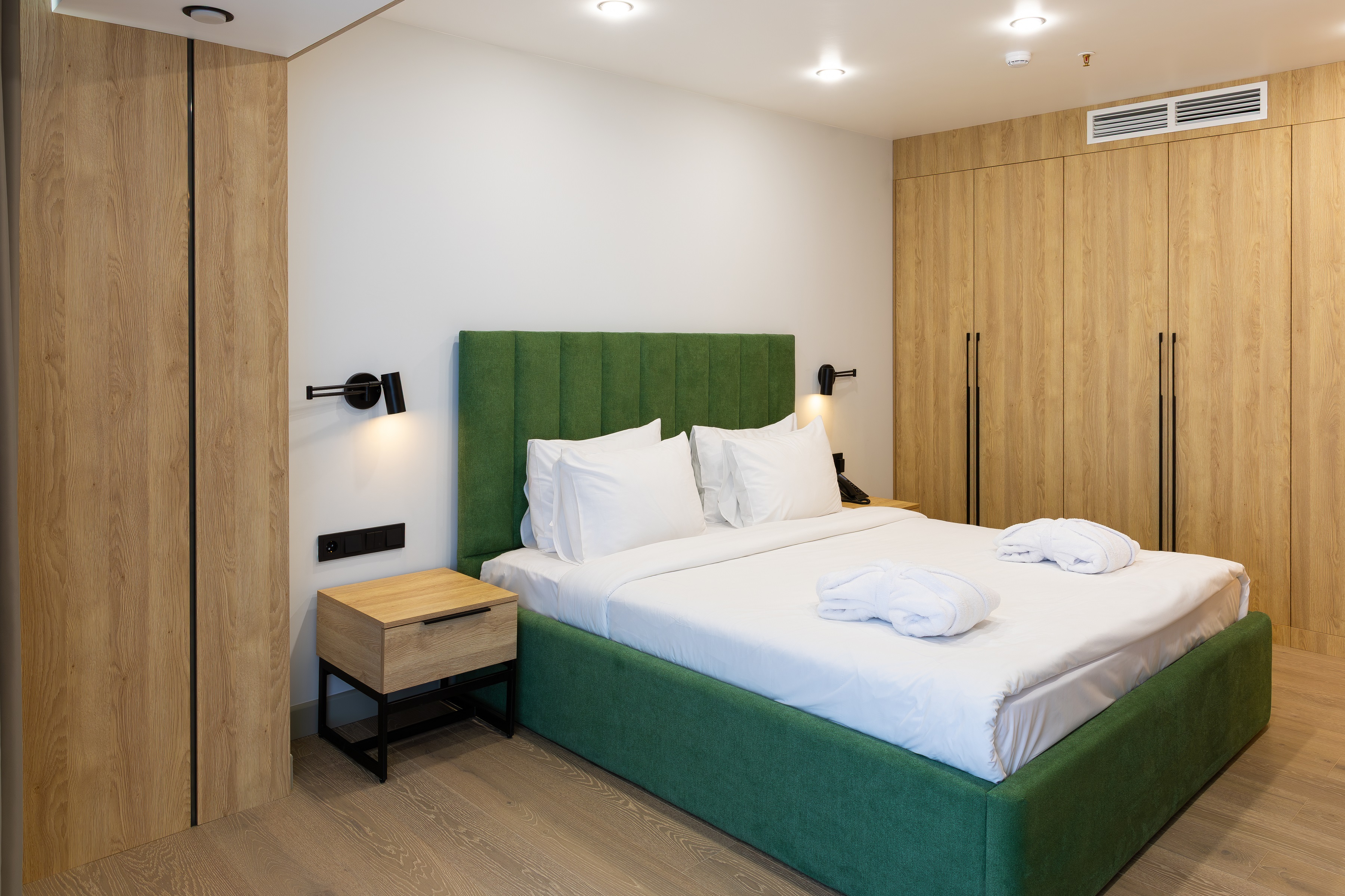 В номере: диван раскладной, кровать двуспальная, прикроватные тумбочки, стол, стул, шкаф, кофемашина, мини-холодильник, сейф, система общего кондиционирования, телевизор ЖК, чайная станция, чайный набор посуды