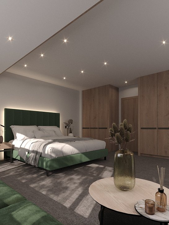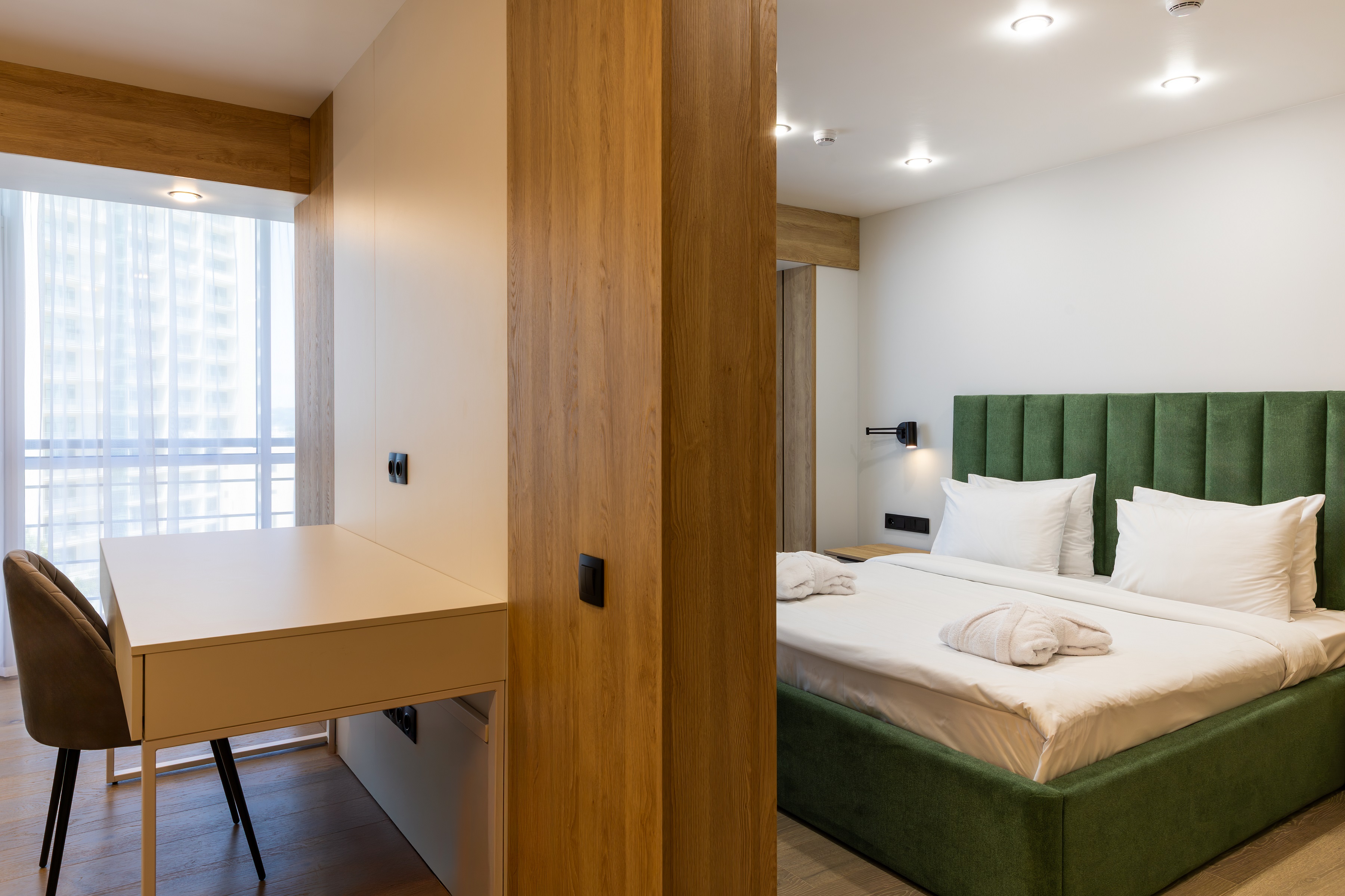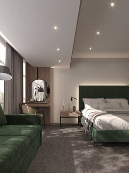 В номере: диван, кровать двуспальная, прикроватные тумбочки, стол, стол для компьютера, стулья, тумба багажная, шкаф, телевизор ЖК, телефон