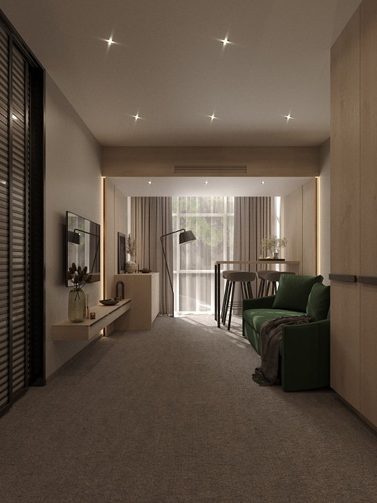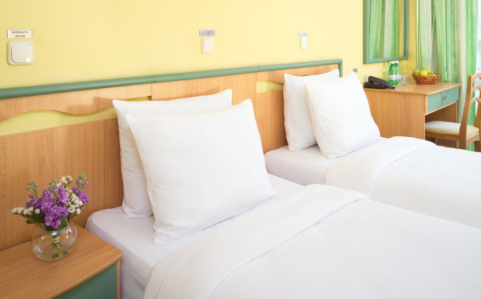 В номере: зеркало, кровати односпальные, стол, стулья, шкаф, мини-холодильник, сейф, система общего кондиционирования, телевизор ЖК, телефон