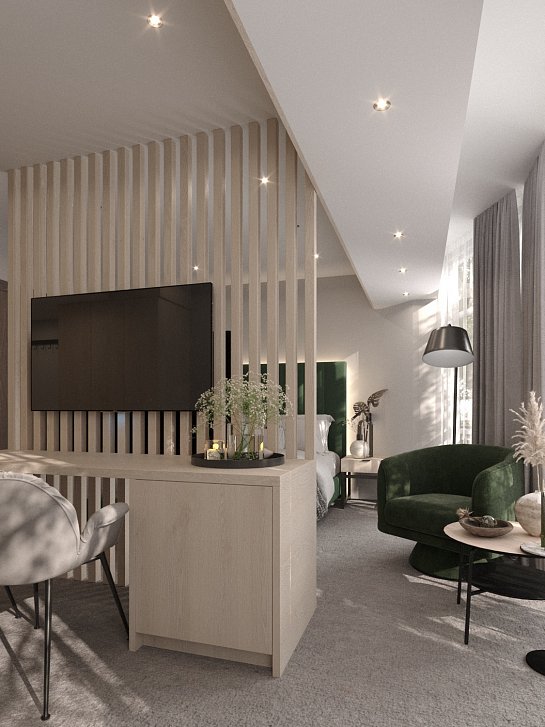 В номере: кровать двуспальная, кровать раскладная, прикроватные тумбочки, стол, стулья, шкаф, кофемашина, мини-холодильник, сейф, сплит-система, телевизор ЖК, телефон, чайная станция, чайный набор посуды