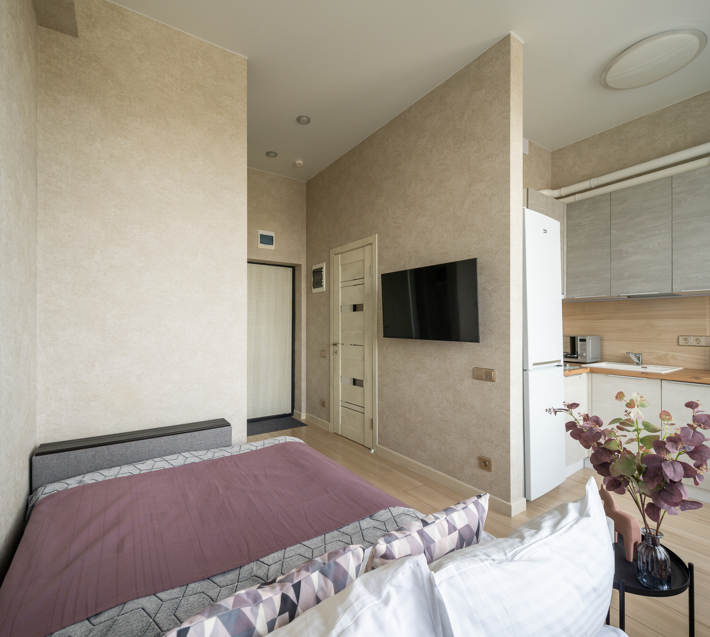В номере: вешалка, диван, зеркало, кровать односпальная, стол, стулья, шкаф, микроволновая печь, набор посуды, плита газовая, сплит-система, стиральная машина, телевизор, холодильник, электрочайник