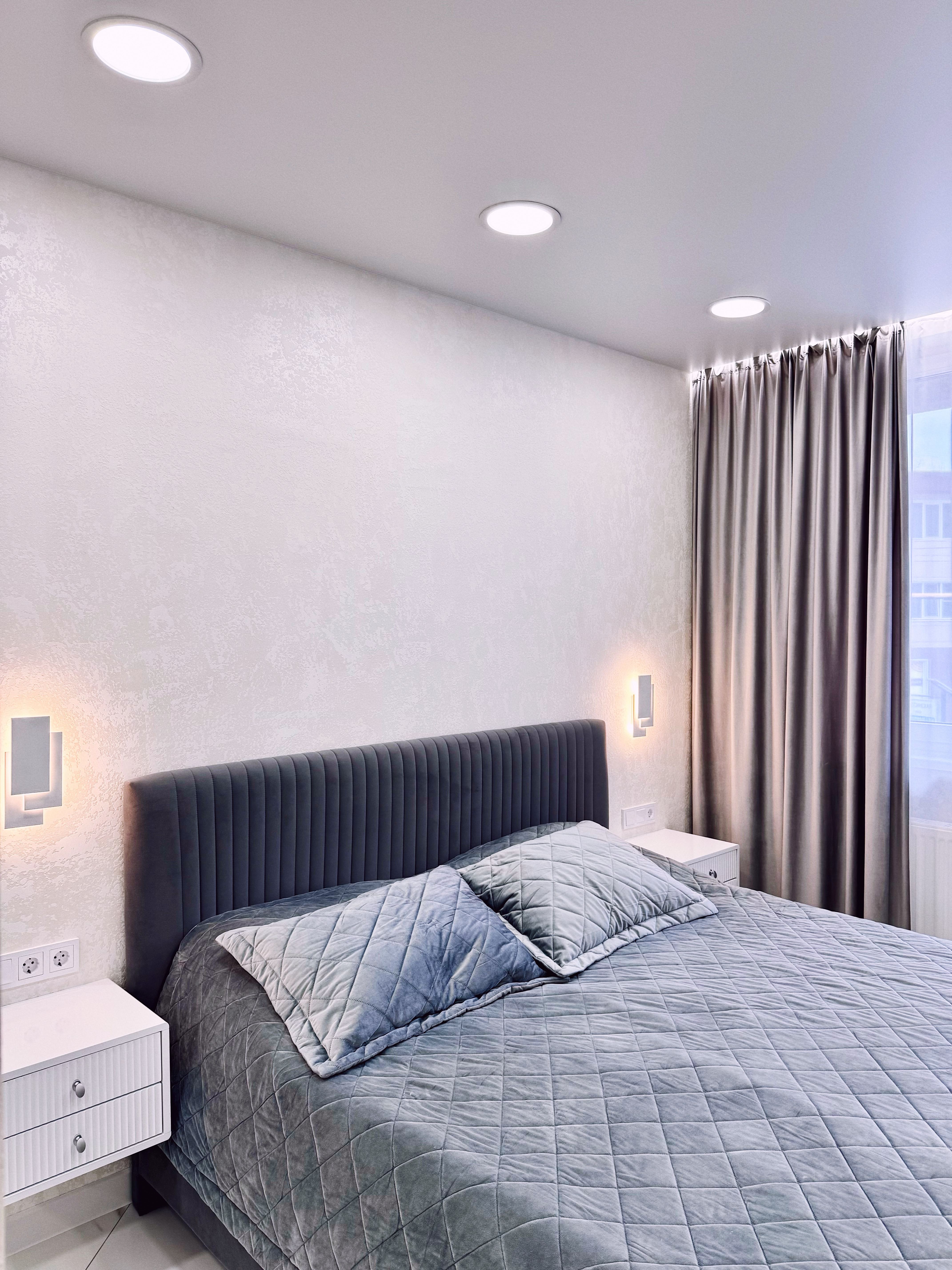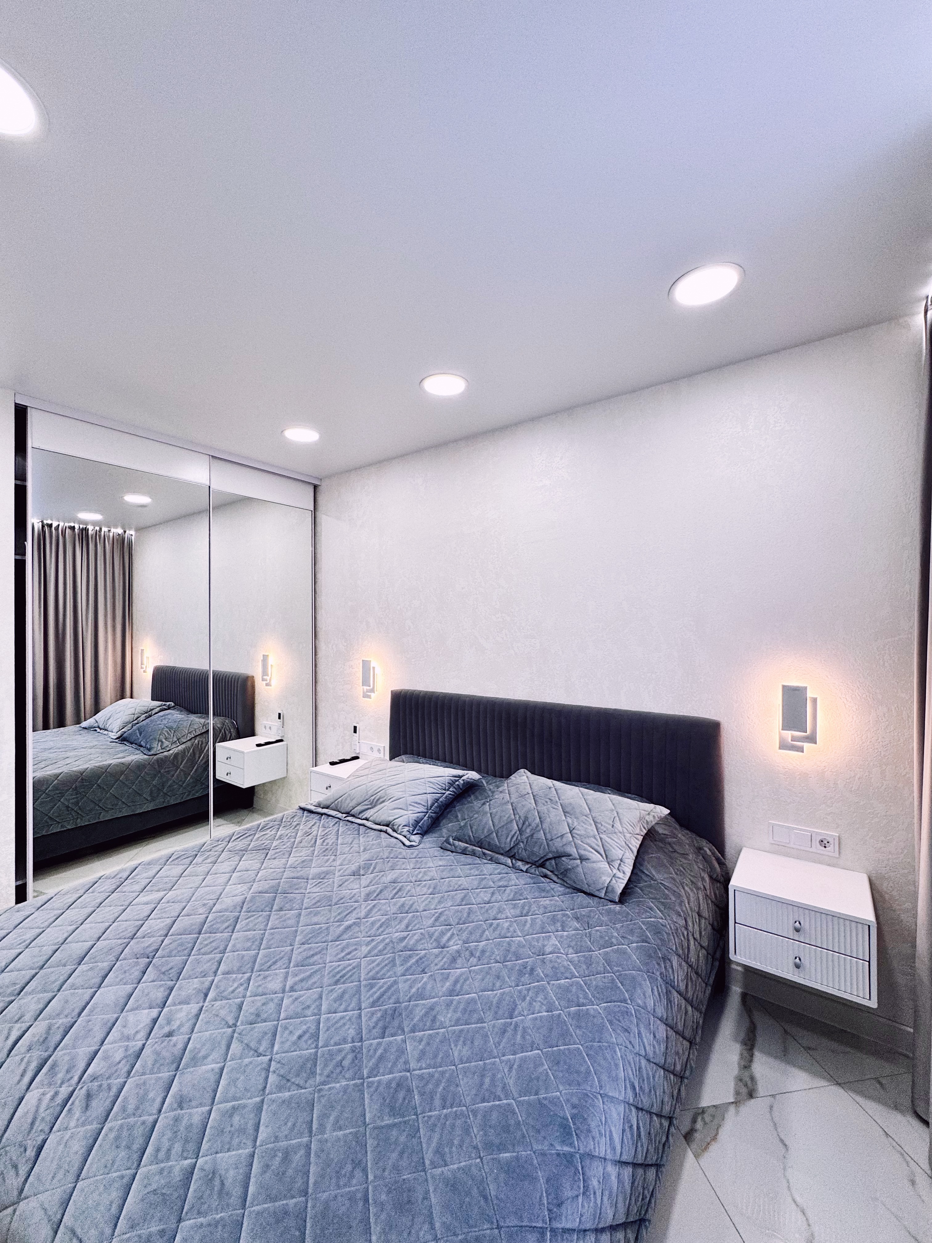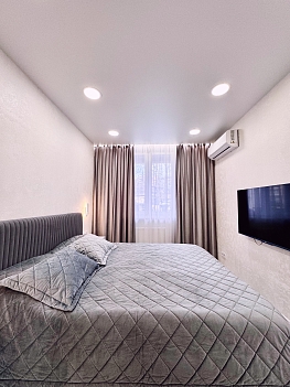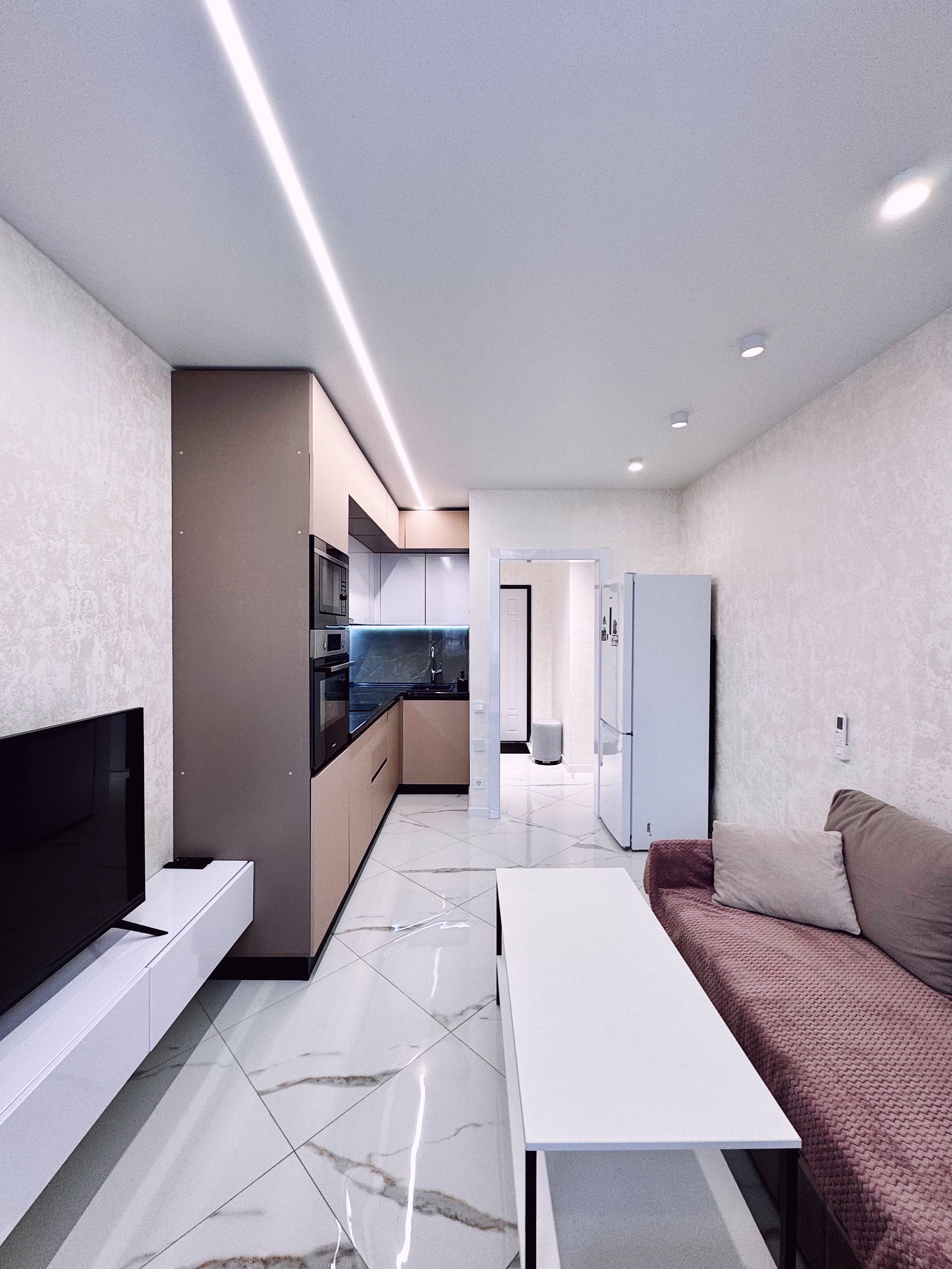 ️Для удобства гостей оснащение апартаментов продумано до мельчайших деталей: есть стильная кухня с варочной поверхностью, вместительным холодильником, микроволновой печью, духовкой и всей необходимой кухонной утварью; в спальне удобная кровать king-size с белоснежным бельем, а в гостиной диван-кровать, который превращается в полноценное двуспальное место; есть множество сценариев освещения. Так же ест кондиционер, быстрый Wi-fi, телевизор со смарт-ТВ, просторная система хранения для одежды, чемоданов и всего необходимого. В ванной комнате есть душевая система, свежие полотенца, гигиенические средства, фен. Так же гости могут воспользоваться гладильной доской, сушилкой, стиральной машиной и средствами для стирки.Богатая инфраструктура жилого комплекса включает охрану и видеонаблюдение, ландшафтное озеленение. А также просторную зону отдыха без машин, с уютными беседками, детскими и спортивными площадками.