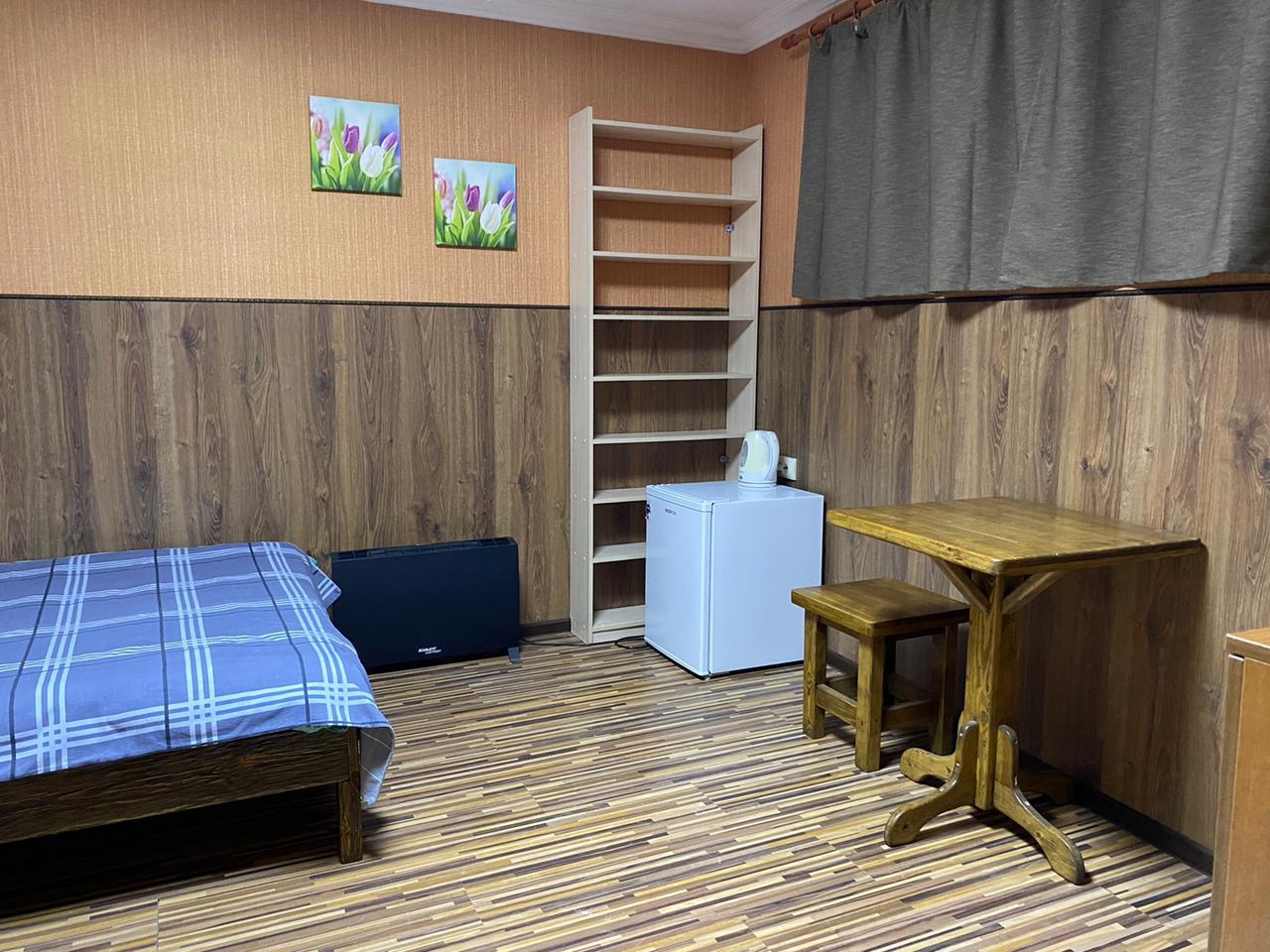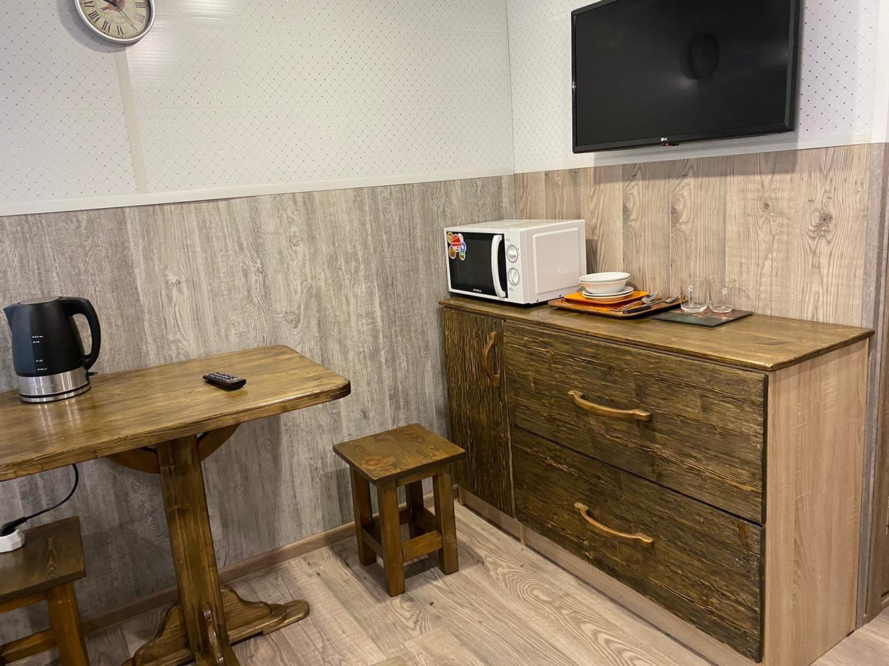 В номере: вешалка, кровать двуспальная, прикроватная тумбочка, стол, стулья, кондиционер, микроволновая печь, набор посуды, обогреватель, телевизор ЖК, холодильник, электрочайник