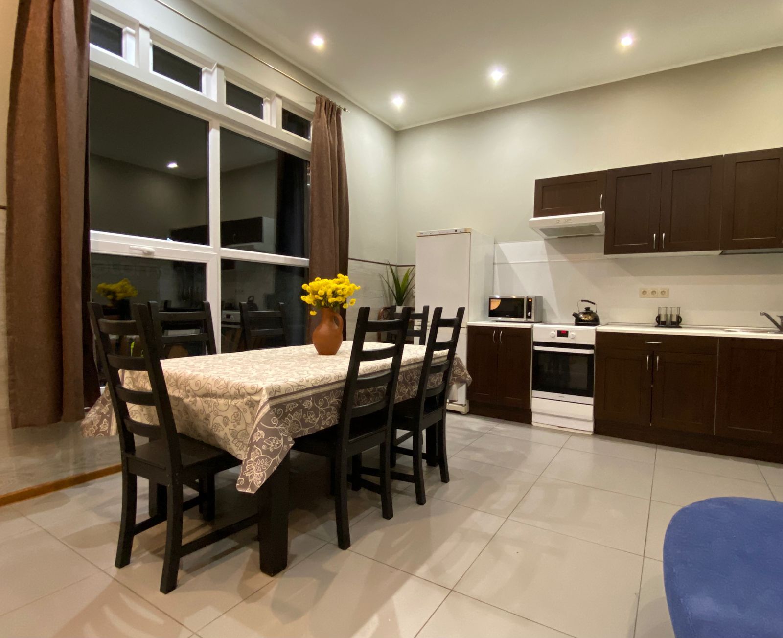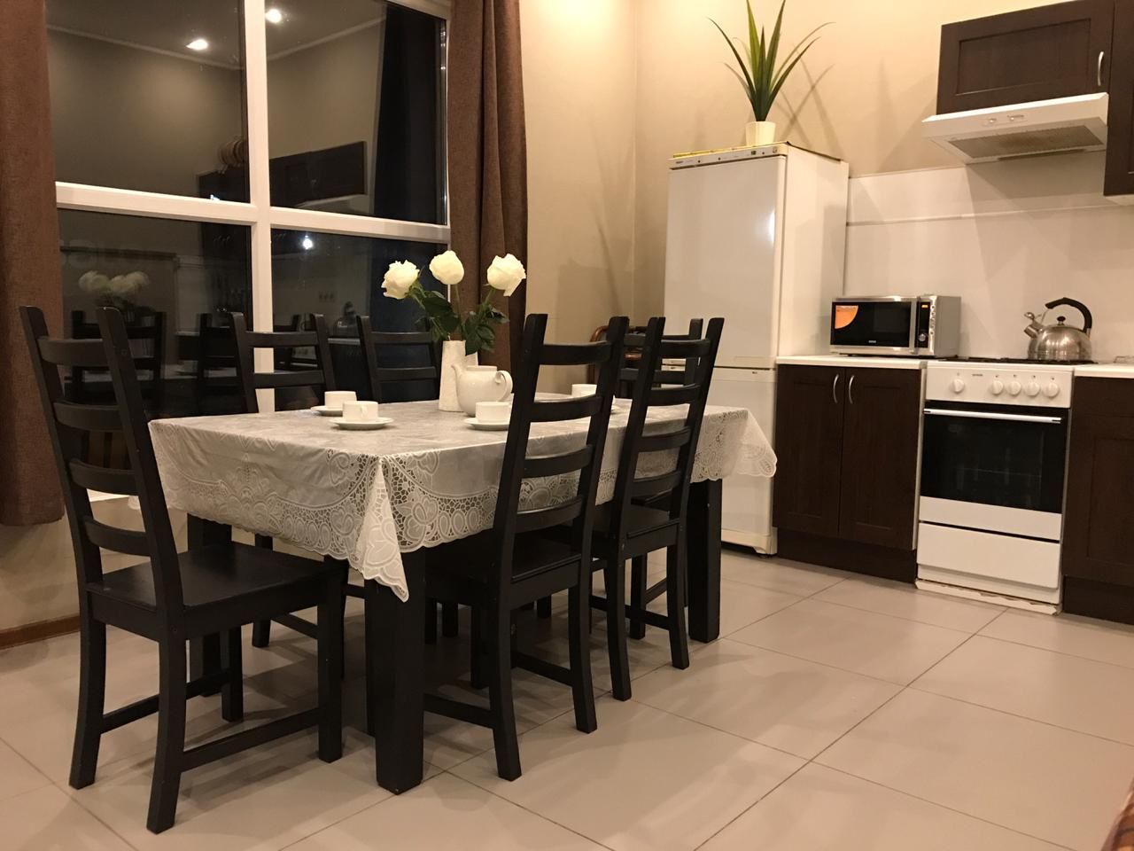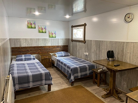 В номере: вешалка, кровати односпальные, кровать двуспальная, прикроватные тумбочки, стол, стулья, кондиционер, микроволновая печь, набор посуды, обогреватель, телевизор ЖК, холодильник, чайник