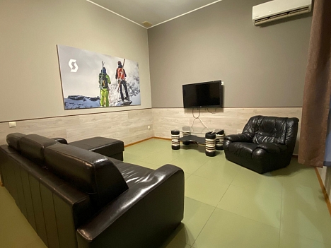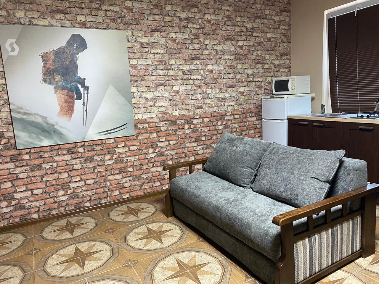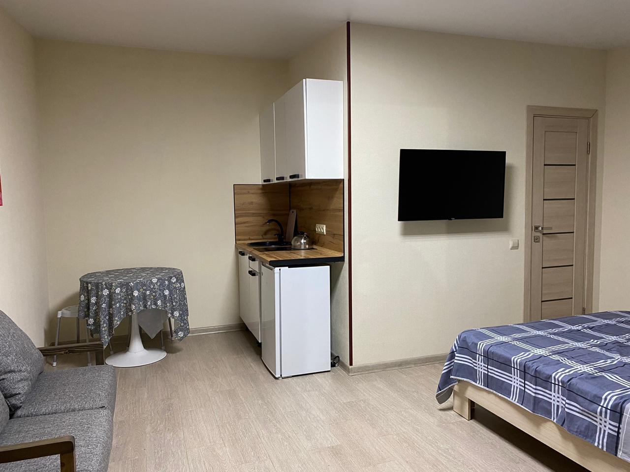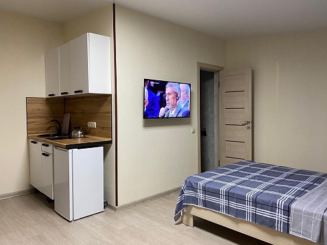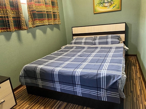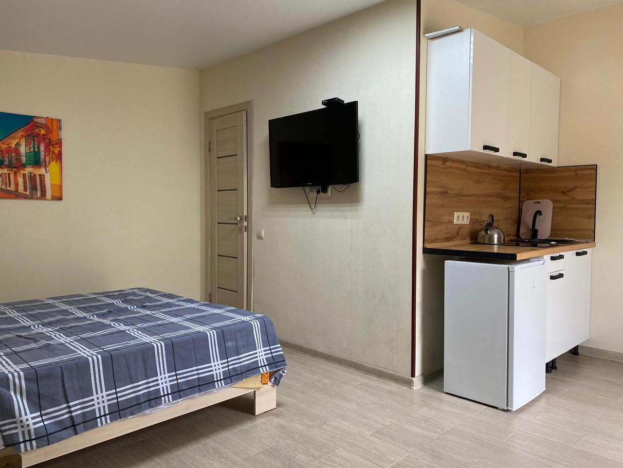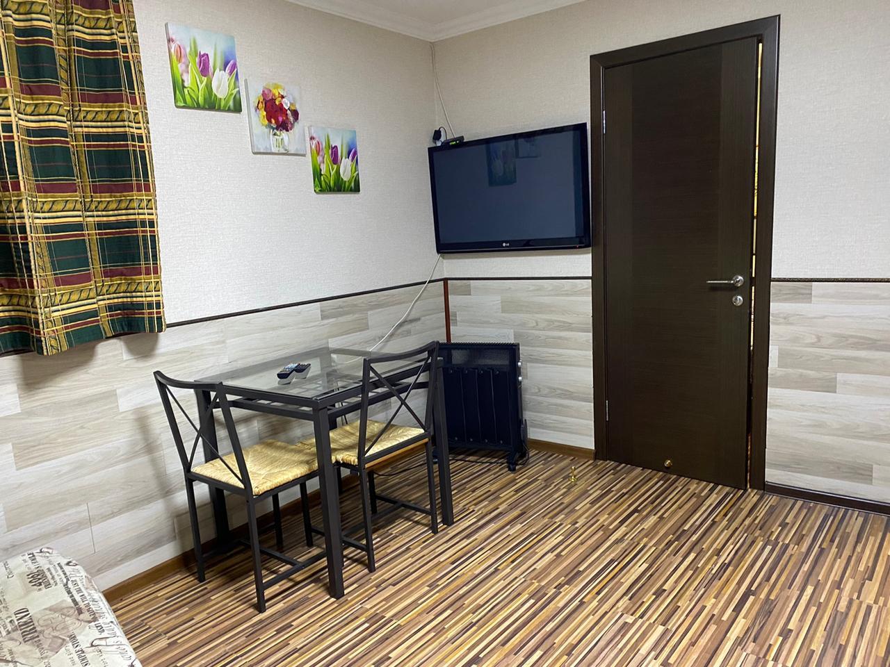 В номере: вешалка, диван раскладной, зеркало, комод, кровать двуспальная, стол, стулья, кондиционер, микроволновая печь, набор посуды, телевизор ЖК, холодильник, чайник