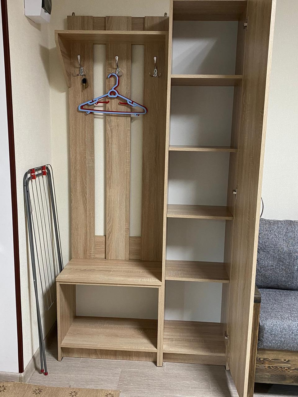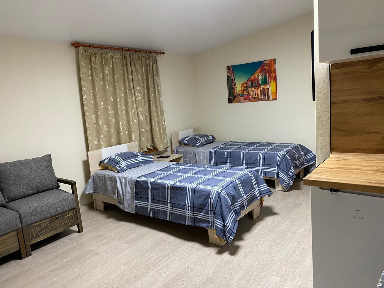 В номере: вешалка, диван, кровати односпальные, прикроватная тумбочка, стол, стулья, шкаф, кондиционер, набор посуды, плита электрическая, телевизор ЖК, холодильник, чайник