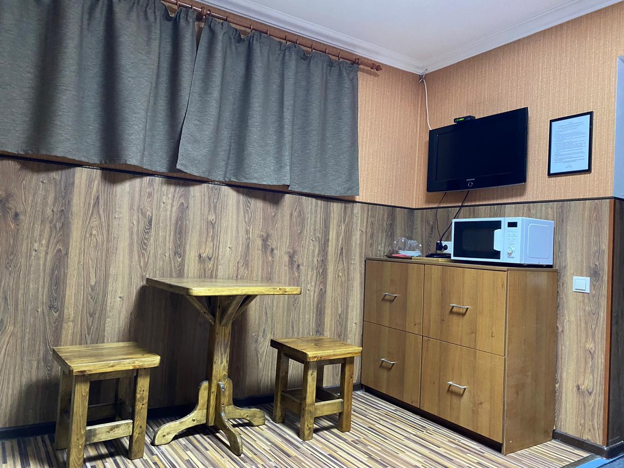 В номере: вешалка, кровати односпальные, прикроватная тумбочка, стол, стулья, кондиционер, микроволновая печь, набор посуды, обогреватель, телевизор ЖК, холодильник, электрочайник