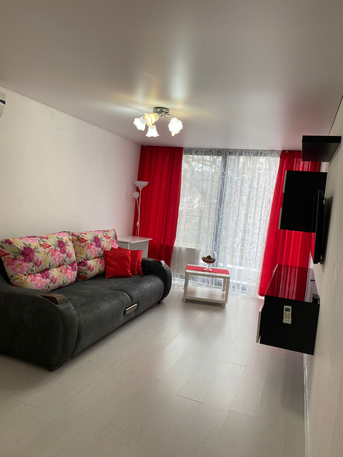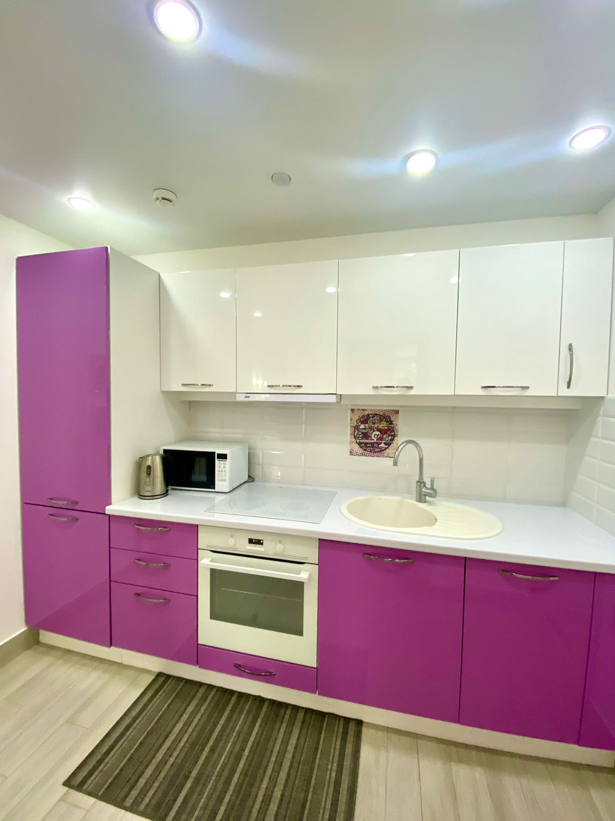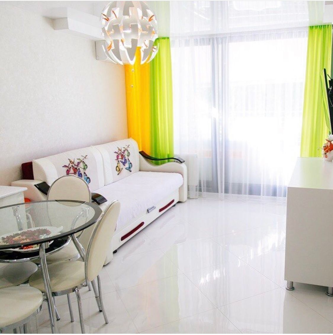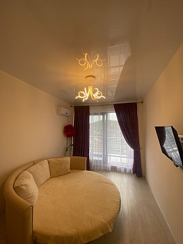 В номере: диван раскладной, комод, кровать двуспальная, кухонная мебель, прикроватная тумбочка, стол обеденный, стулья, шкаф, шкаф для посуды, кондиционер, микроволновая печь, набор посуды, плита электрическая, стиральная машина, телевизор ЖК, холодильник