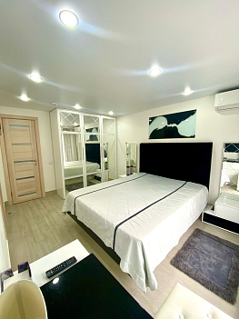 В номере: вешалка, диван раскладной, зеркало, кровать двуспальная, прикроватные тумбочки, стол, стулья, шкаф, гладильная доска, духовой шкаф, кондиционер, микроволновая печь, набор посуды, плита электрическая, посудомоечная машина, пылесос, стиральная машина, телевизор, теплый пол, утюг, холодильник, электрочайник
