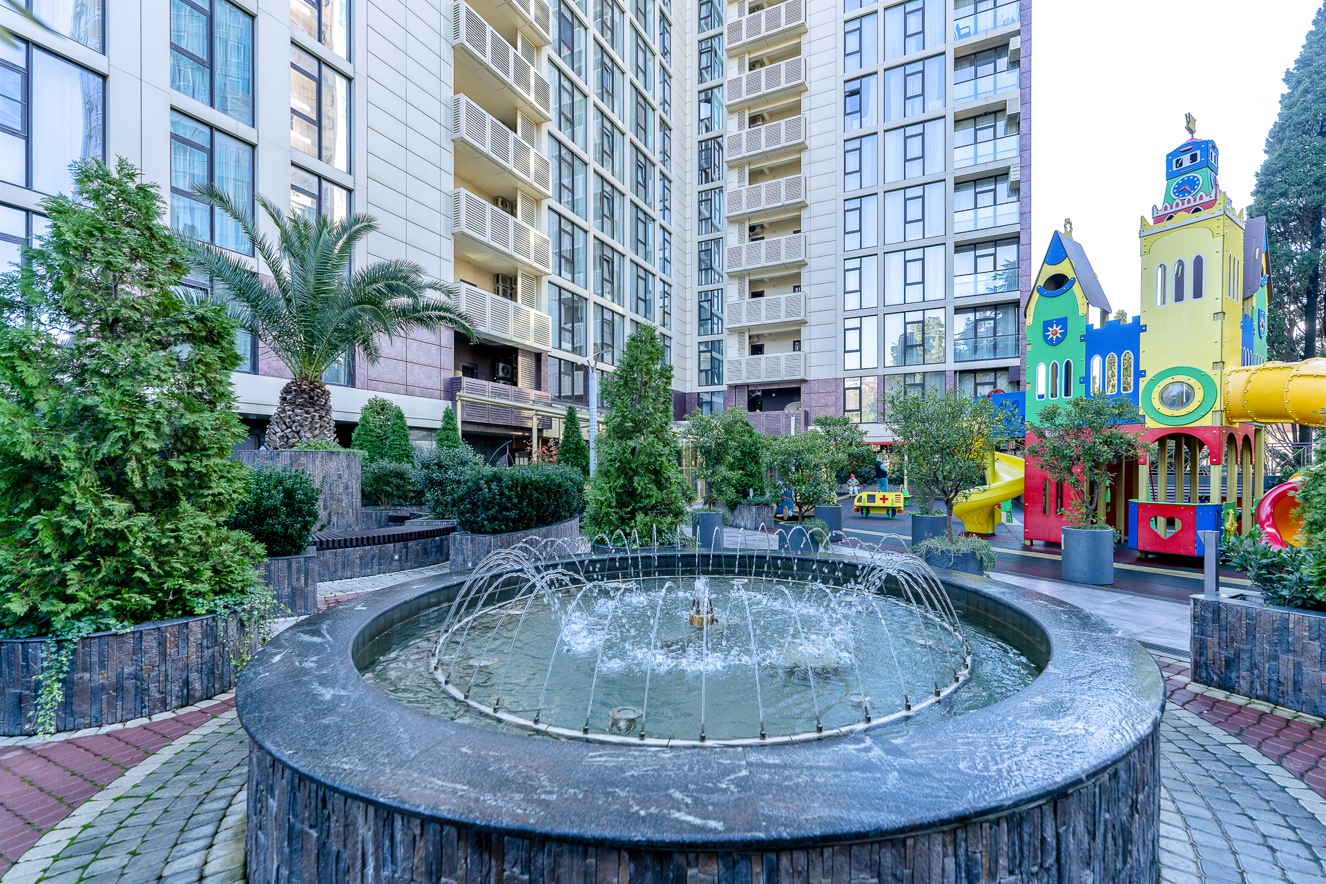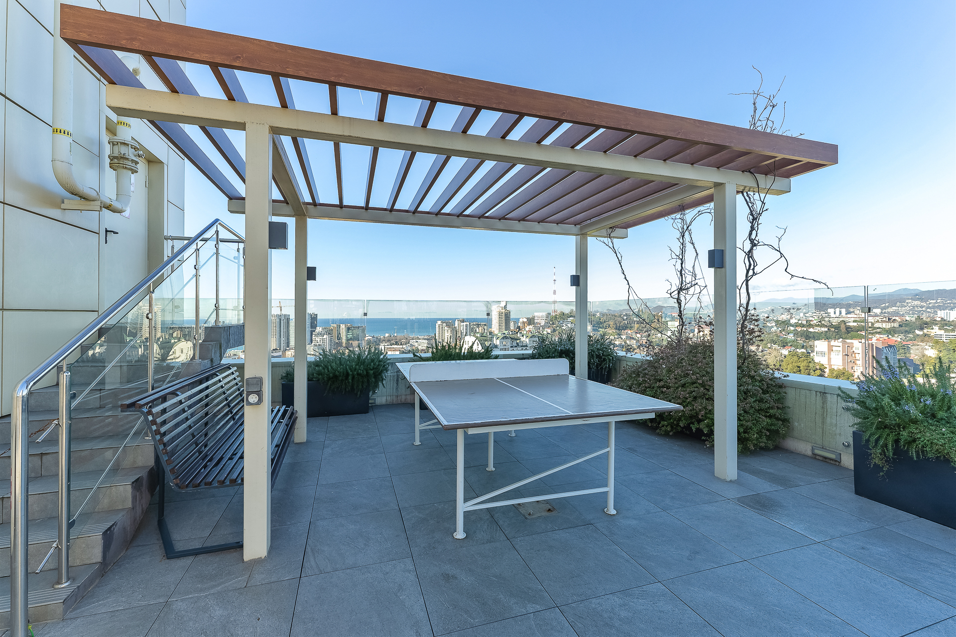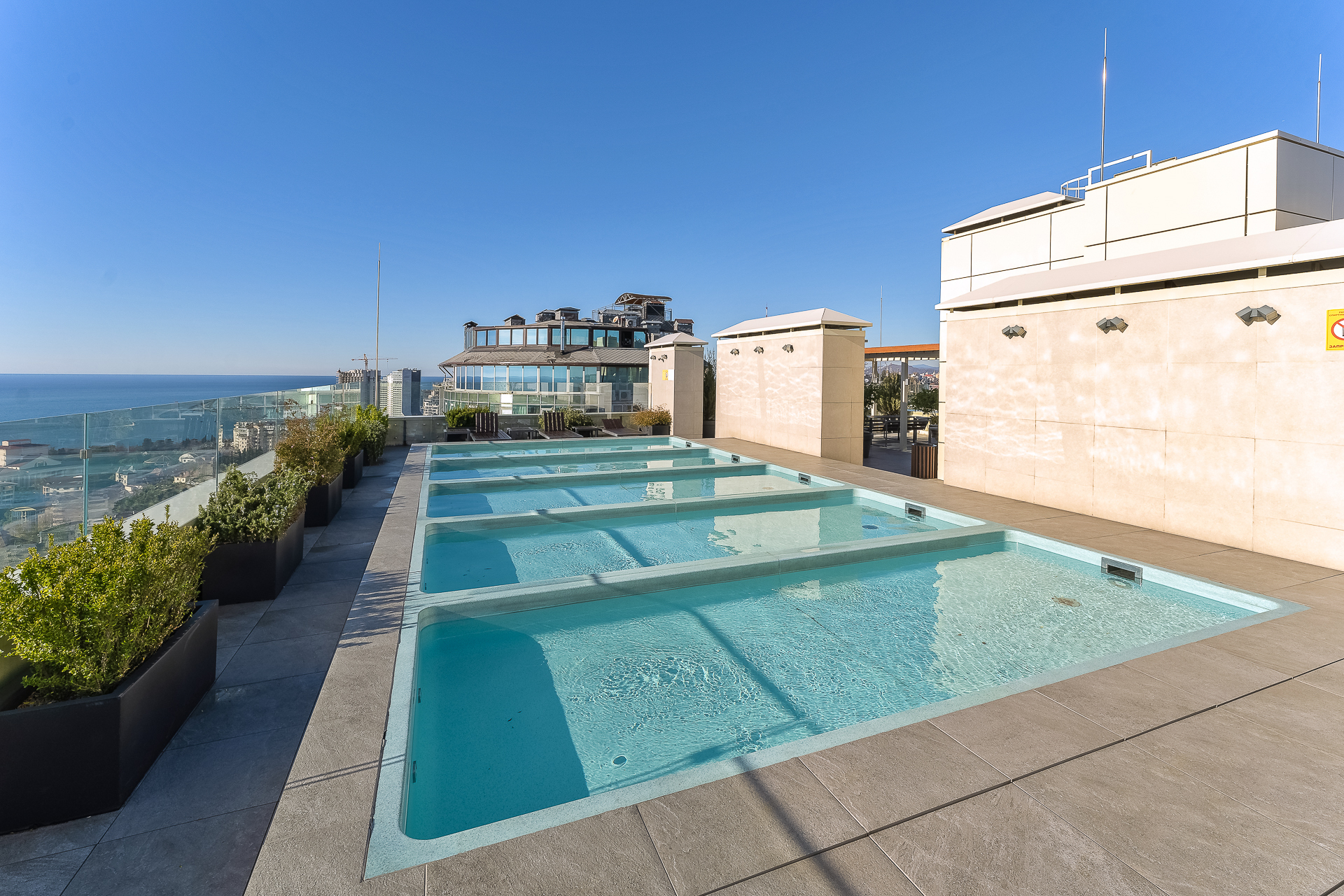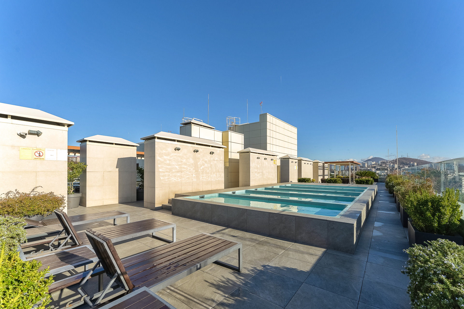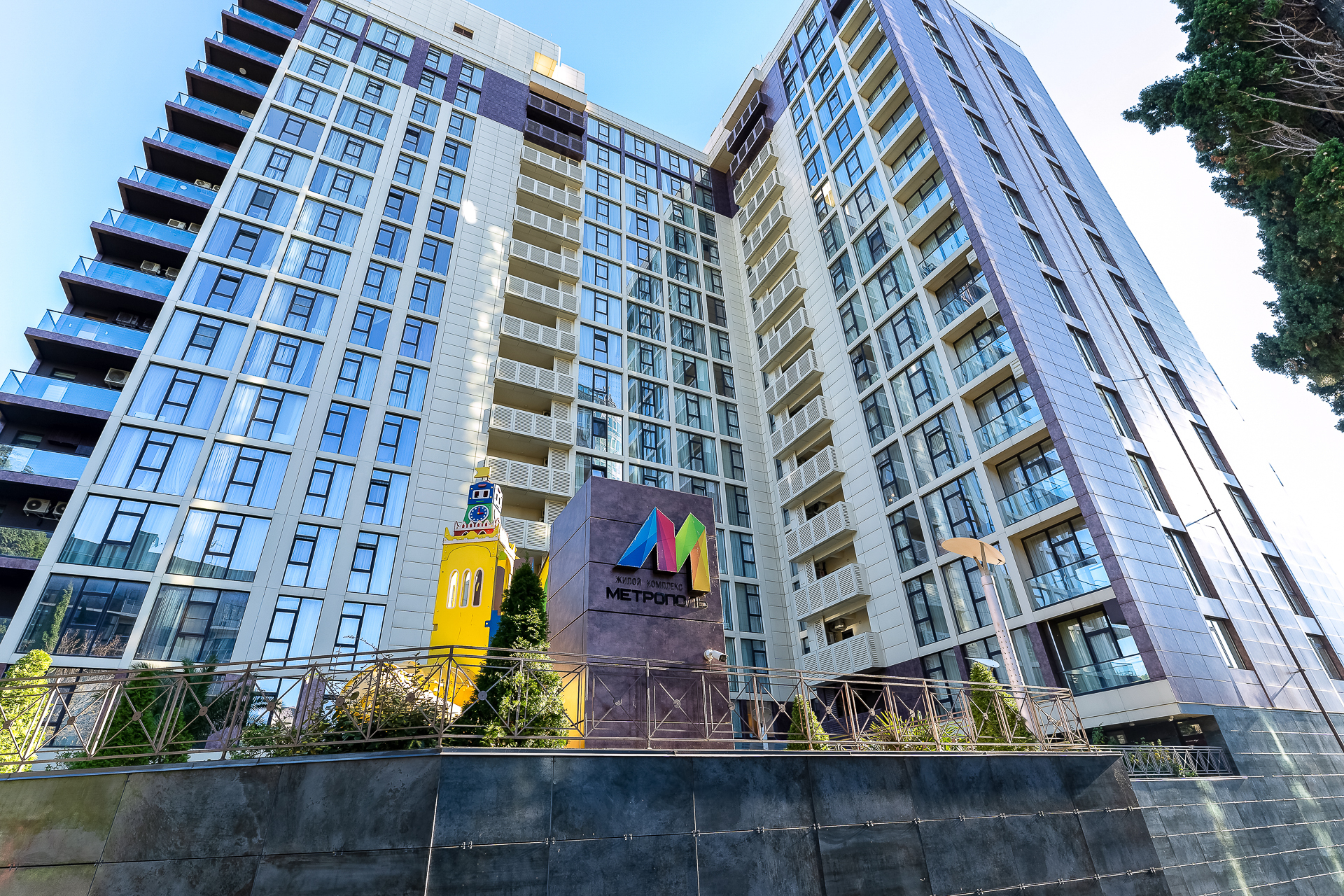 До Морского вокзала можно дойти за четверть часа. Прямо напротив комплекса — рестораны и кафе на любой вкус, а также гипермаркет «Перекрёсток», «Красное&Белое» и пункты выдачи Ozon и Wildberries, что делает отдых максимально автономным. Транспортная доступность также безупречна. Остановка «Светлана» находится в трёх минутах ходьбы, откуда можно быстро добраться до Платановой аллеи, парка «Ривьера» и Железнодорожного вокзала.Для гостей подготовлен номер Студия, который продуман до мелочей. В ней предусмотрено абсолютно всё для беззаботного проживания: от белоснежного постельного белья, пушистых полотенец и уютных халатов до комплектов для персональной гигиены. Безопасность гостей стоит на первом месте: круглосуточная охрана и система видеонаблюдения в комплексе следят за спокойствием всех гостей.Входная группа комплекса встречает гостей гостеприимством, а уже внутри открывается целый мир продуманной инфраструктуры. Поднимаясь на верхнюю платформу, попадаешь на смотровую площадку с панорамой 360 градусов — отсюда открываются захватывающие дух виды на морскую гавань с яхтами, сверкающий Олимпийский парк, зелёный массив парка «Дендрарий» и величественные вершины Главного Кавказского хребта. Здесь же, под открытым небом, расположилась купальная зона с подогреваемыми ваннами и удобными шезлонгами, где можно расслабиться после долгих прогулок. Для тех, кто не мыслит отдыха без движения, работают спортивные площадки для баскетбола, большого и настольного тенниса, а также современные тренажёры. Открытая терраса зовёт поработать с ноутбуком на свежем воздухе или провести вечер за настольными играми, пока дети резвятся на отдельной игровой площадке.Нижняя платформа комплекса — это оазис для неспешного общения и уединения. Здесь, в тени зелёных насаждений, покачиваются подвесные качели, а свежий фонтан наполняет воздух прохладой. Основная детская площадка и зона ожидания на открытом воздухе, а также внутри зоны ресепшен, созданы для того, чтобы каждая минута пребывания в «Метрополе» была комфортной.