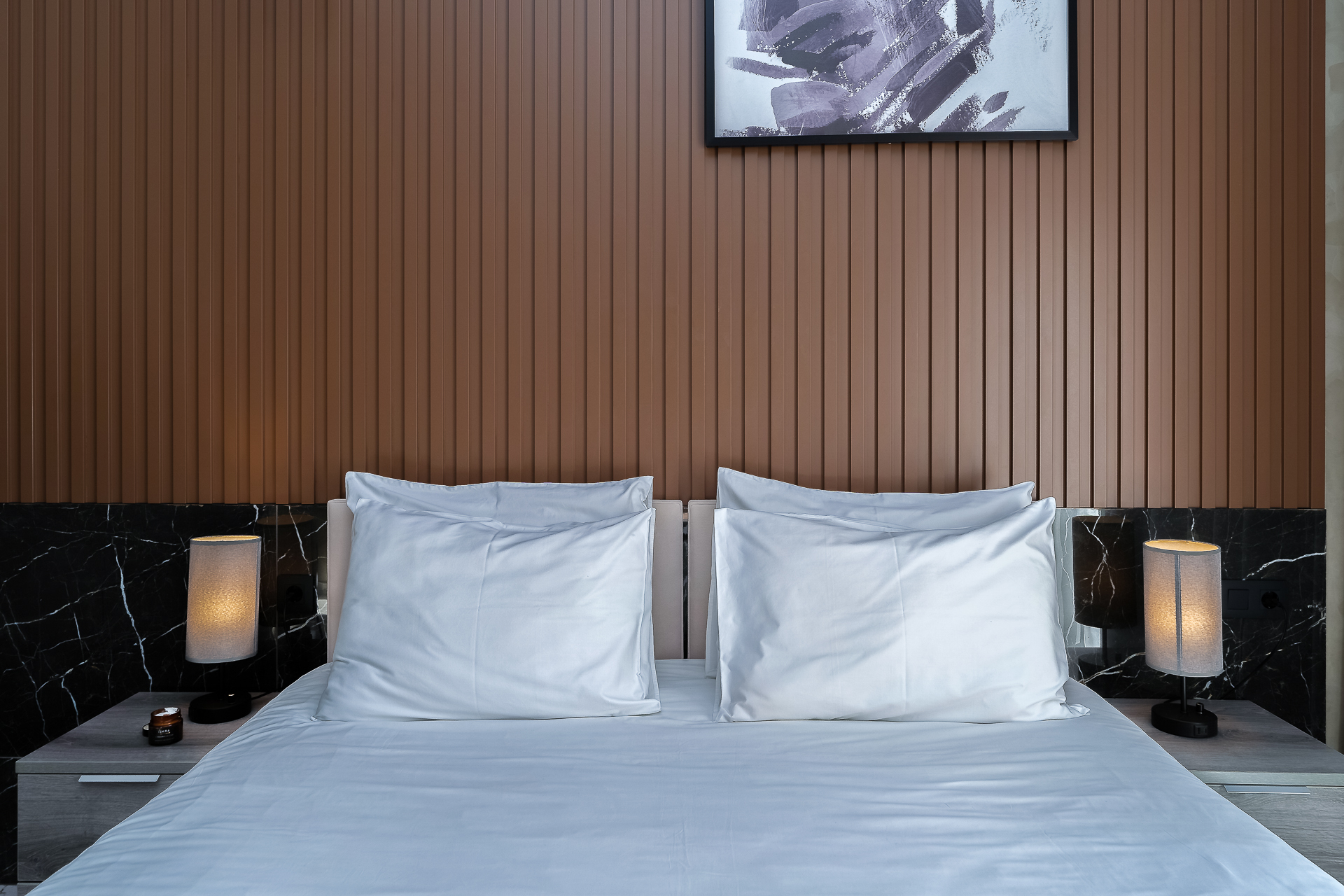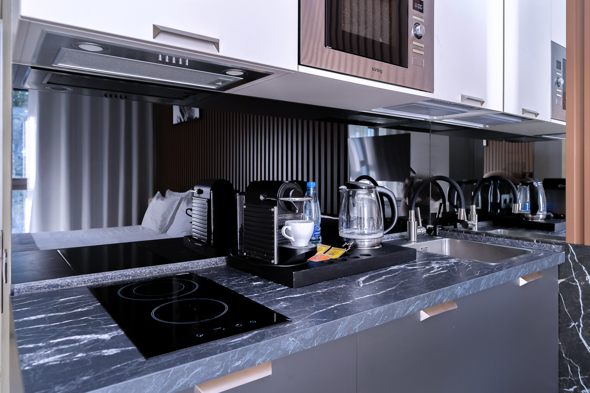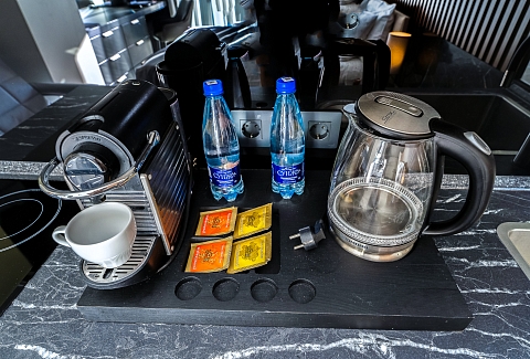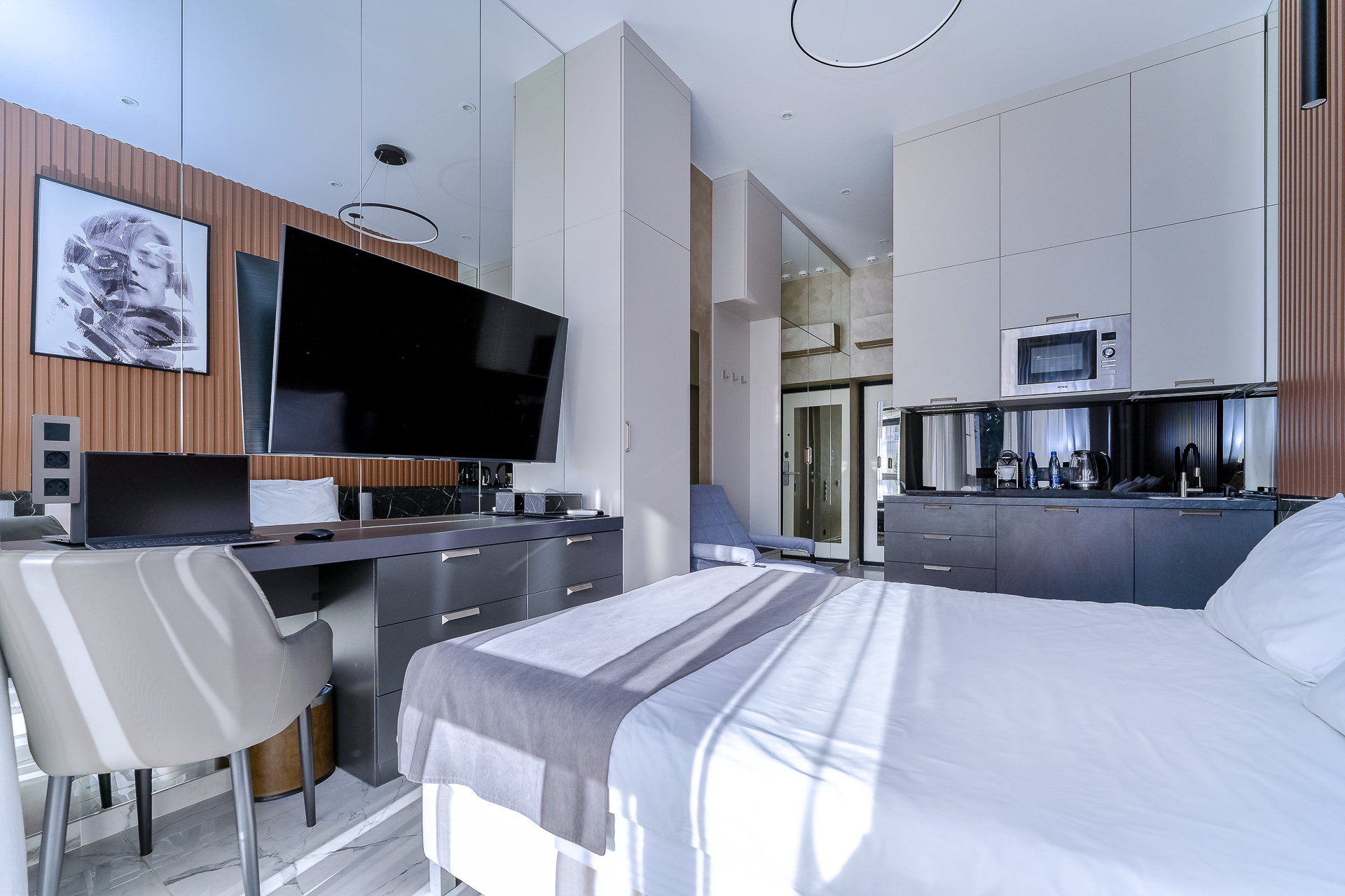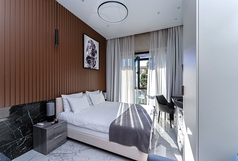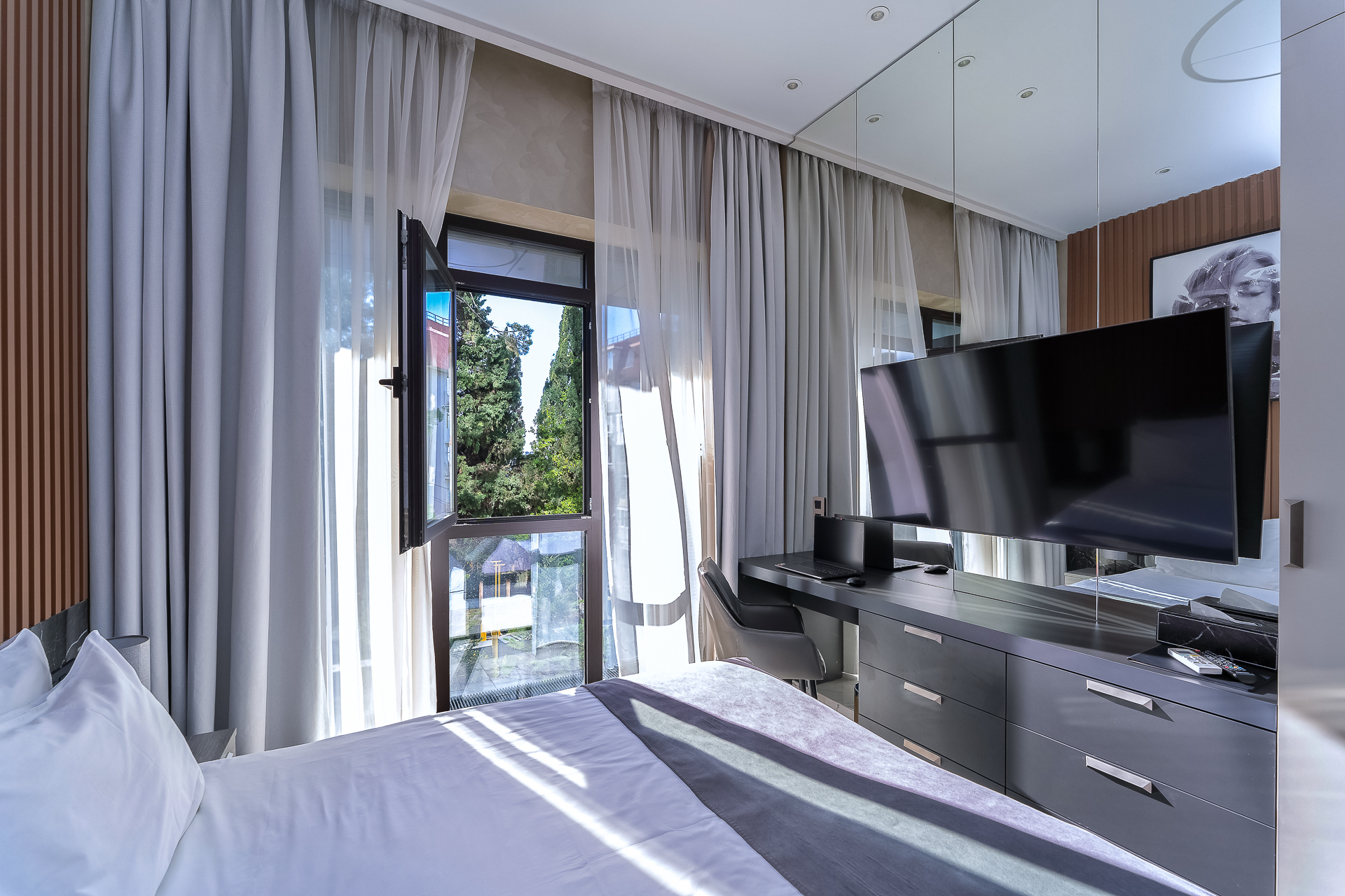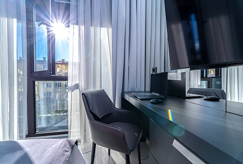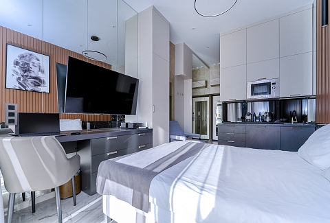 В номере: вешалка, зеркало, кресло-кровать, кровать двуспальная, прикроватные тумбочки, стол, столик туалетный, стул, шкаф, кондиционер, микроволновая печь, набор посуды, сейф, стиральная машина, телевизор, утюг, холодильник, чайник