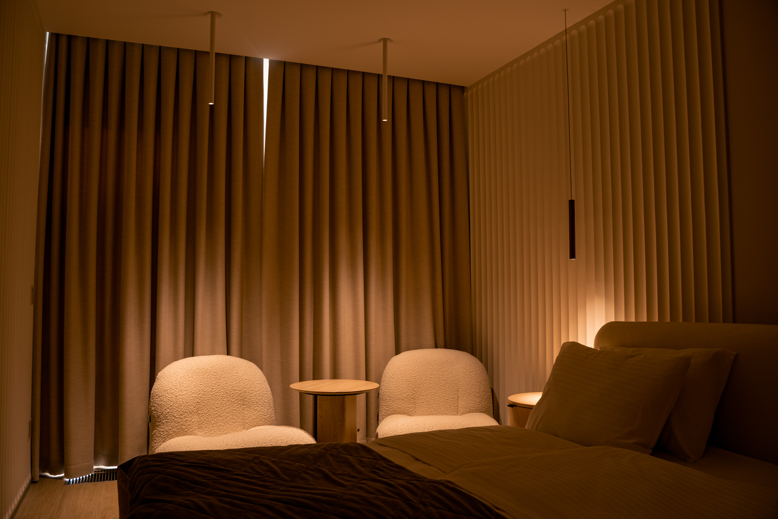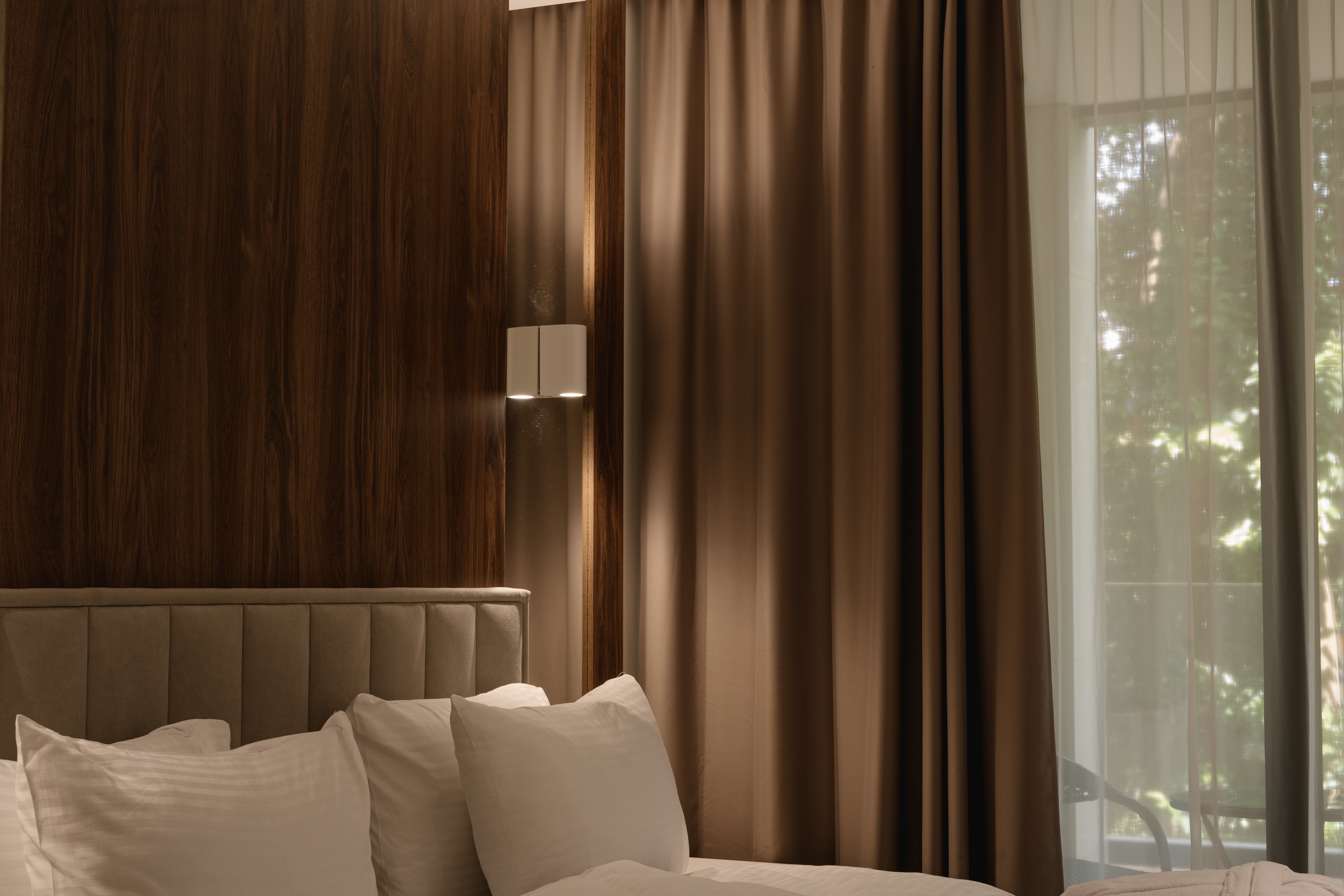 В номере: диван раскладной, зеркало, кровать двуспальная, стол, стулья, шкаф, набор посуды, плита электрическая, сейф, сплит-система, телевизор ЖК, утюг, холодильник, чайный набор посуды, электрочайник
