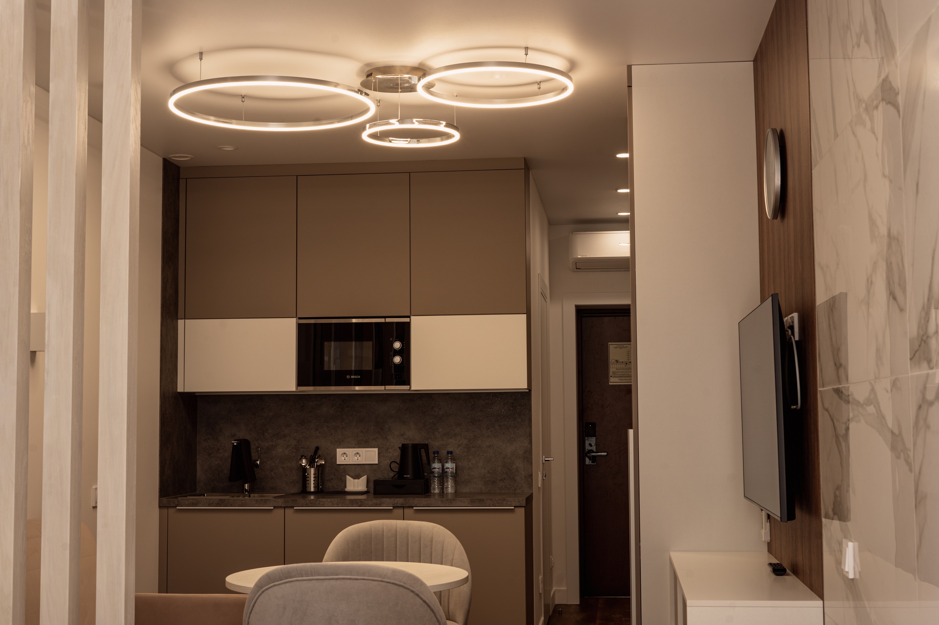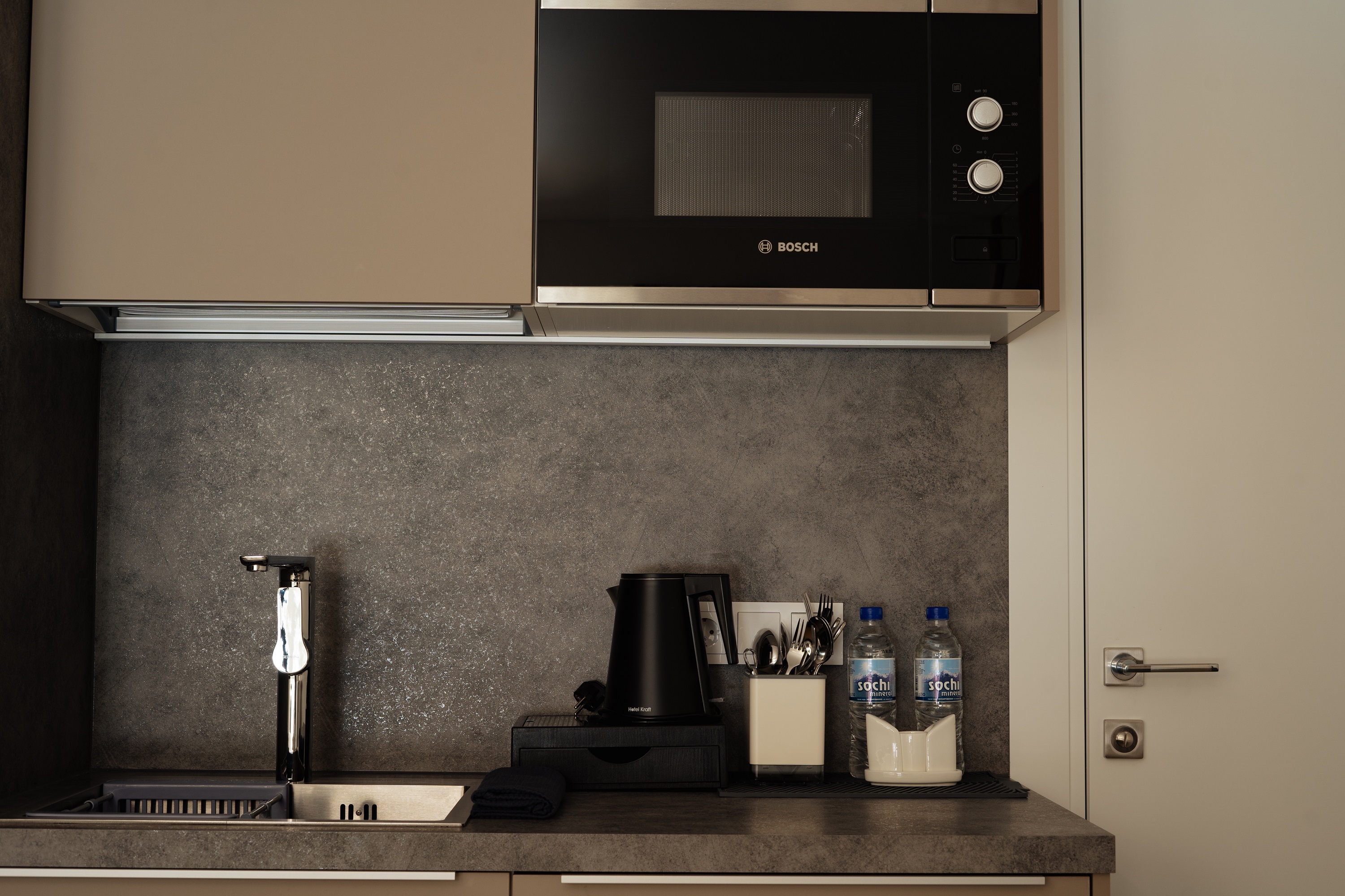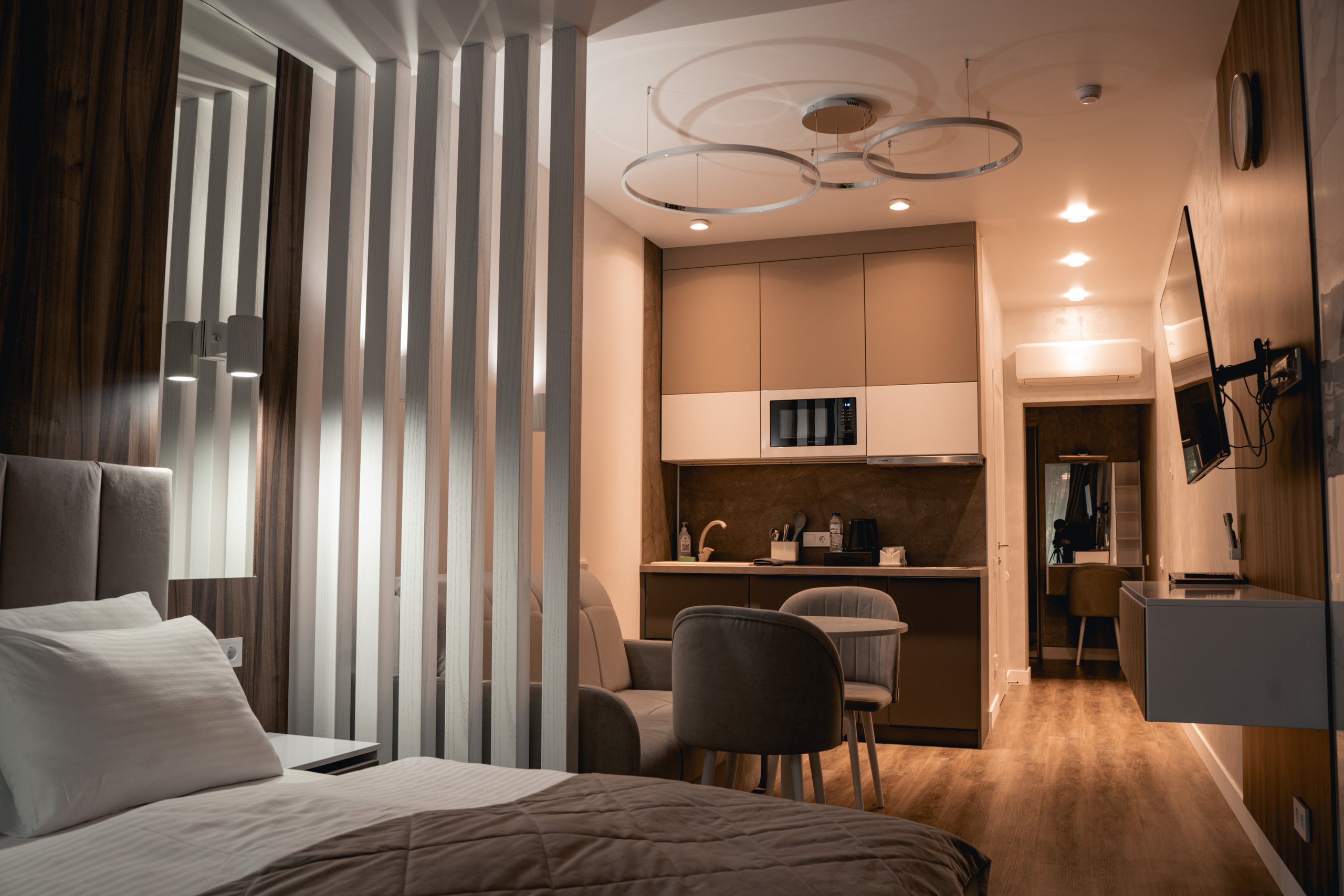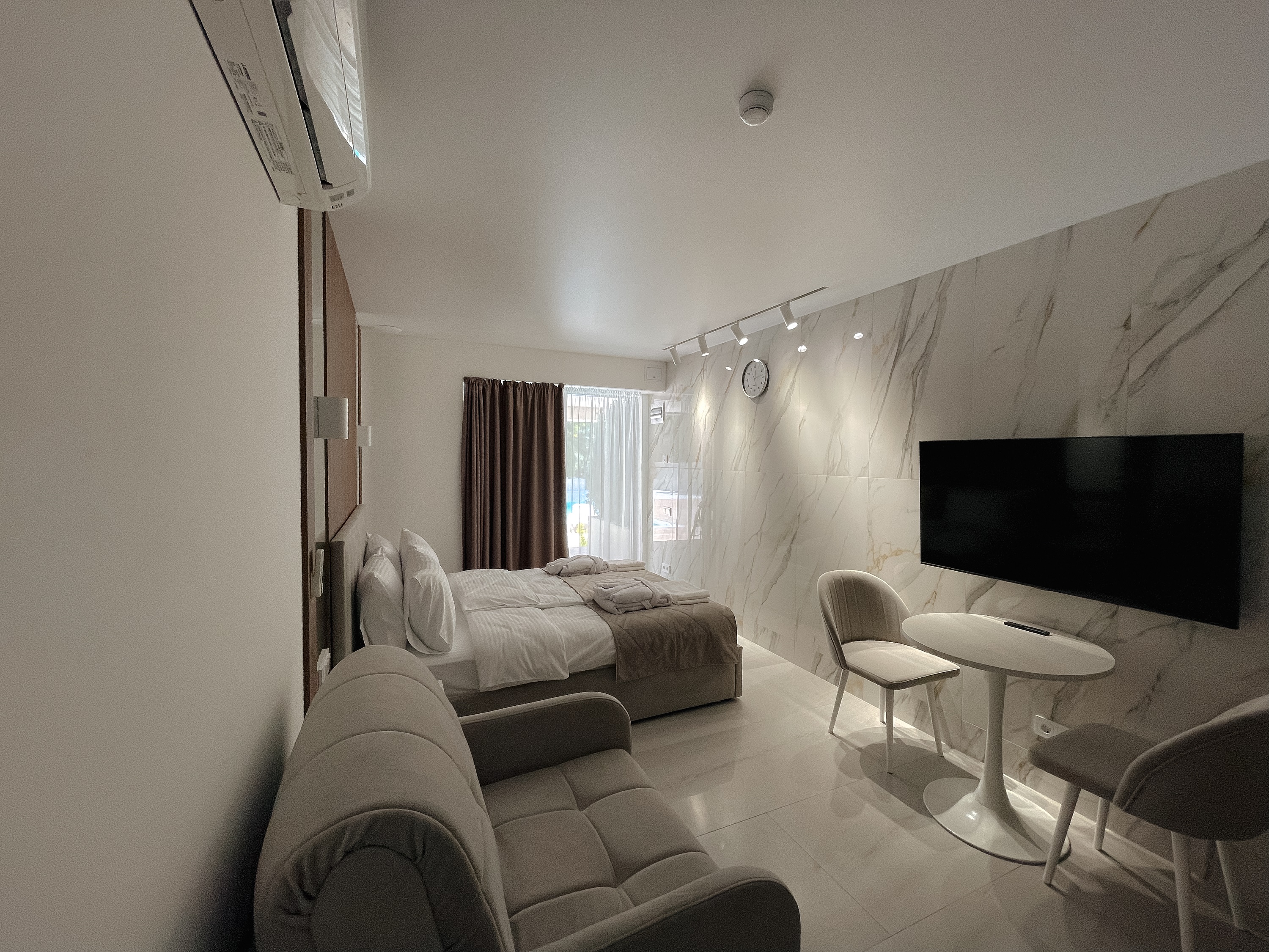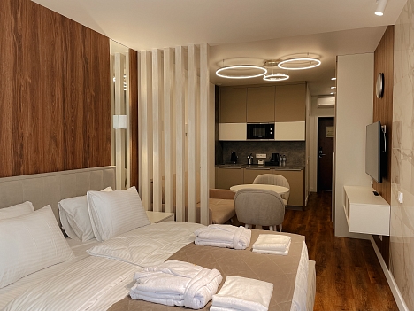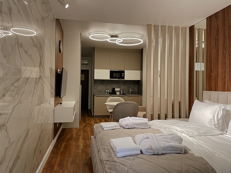 До железнодорожного вокзала чуть меньше 8 километров, а до аэропорта Адлера дорога займет около получаса.Трехэтажный корпус отеля разместился на закрытой территории в парковой зоне. Жилой фонд, способный единовременно принять 160 человек, предлагает гостям комфортабельные апартаменты, оснащенные мини-кухней и ванной. В комнатах стильный интерьер, выдержанный в благородных серых оттенках, в каждой есть кондиционер, телевизор с плоским экраном, фен.На территории работает уличный бассейн с подогревом, доступный в любое время года. Предоставляется интернет Wi-Fi. За 15 минут можно дойти до галечного пляжа. На побережье установлены шезлонги, раздевалки, зонтики, лежаки.