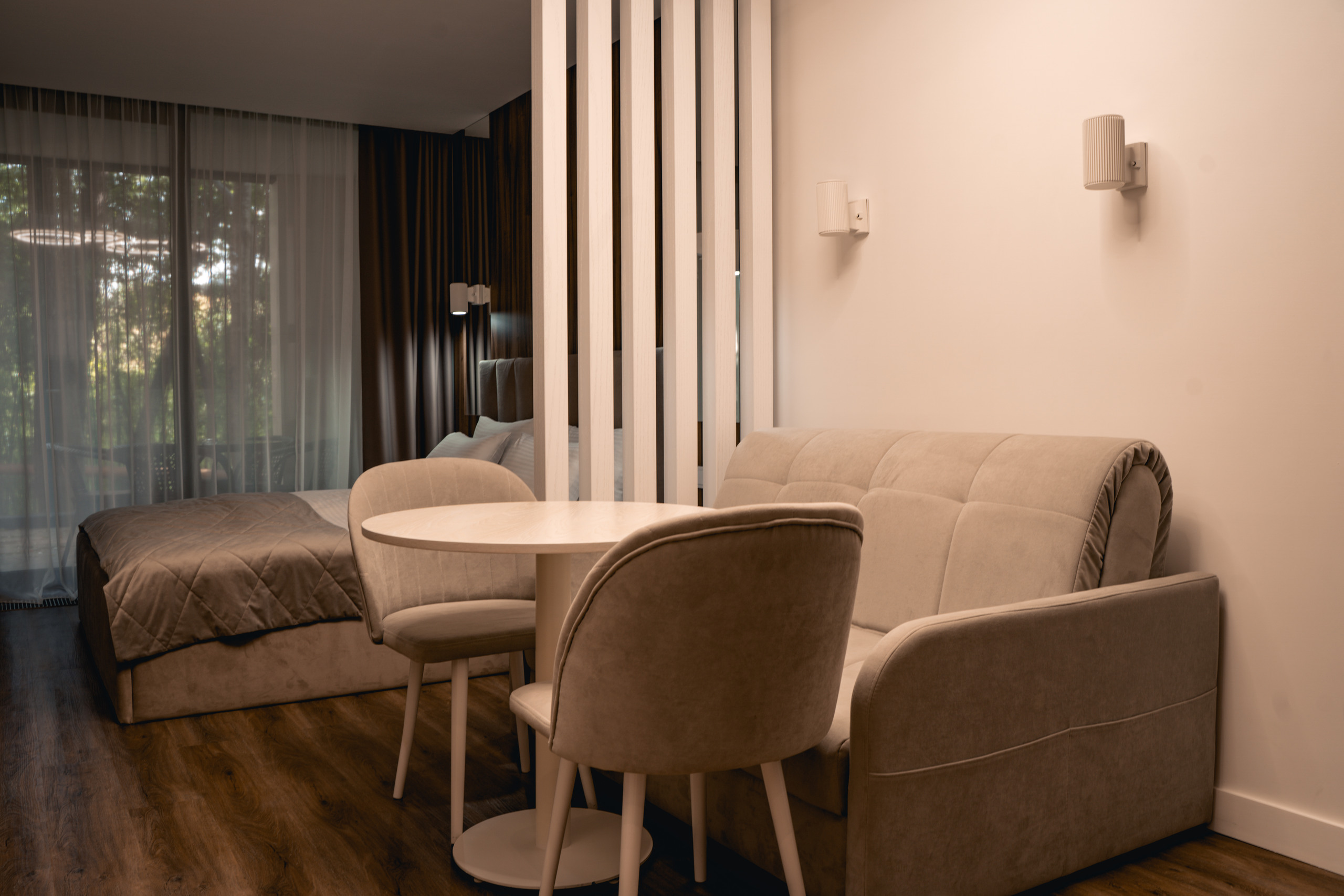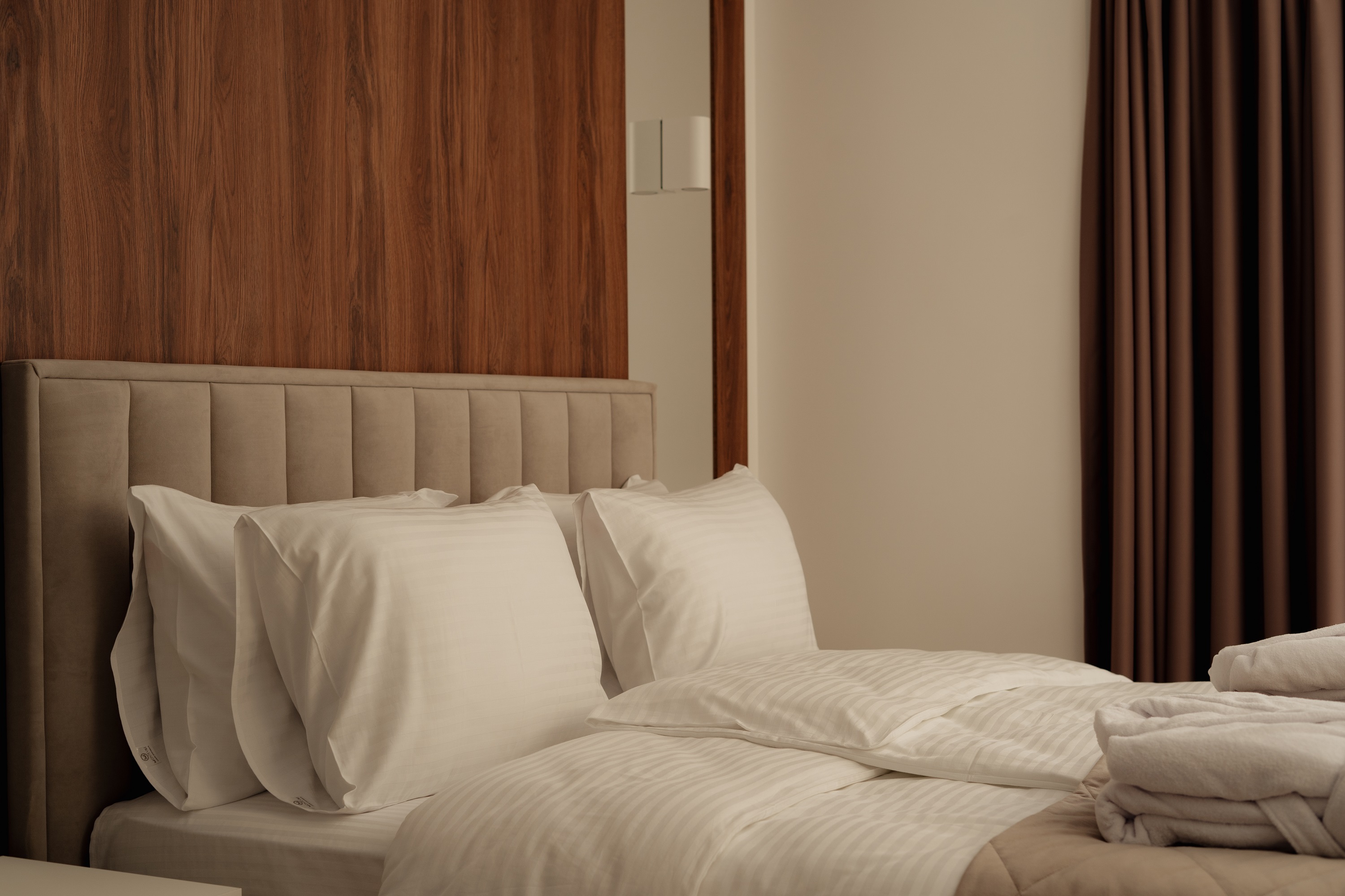 В номере: кровать двуспальная, набор мягкой мебели, прикроватные тумбочки, стол, шкаф, мини-холодильник, набор посуды, пляжные полотенца, сейф, сплит-система, телевизор ЖК, утюг, чайный набор посуды, электрочайник