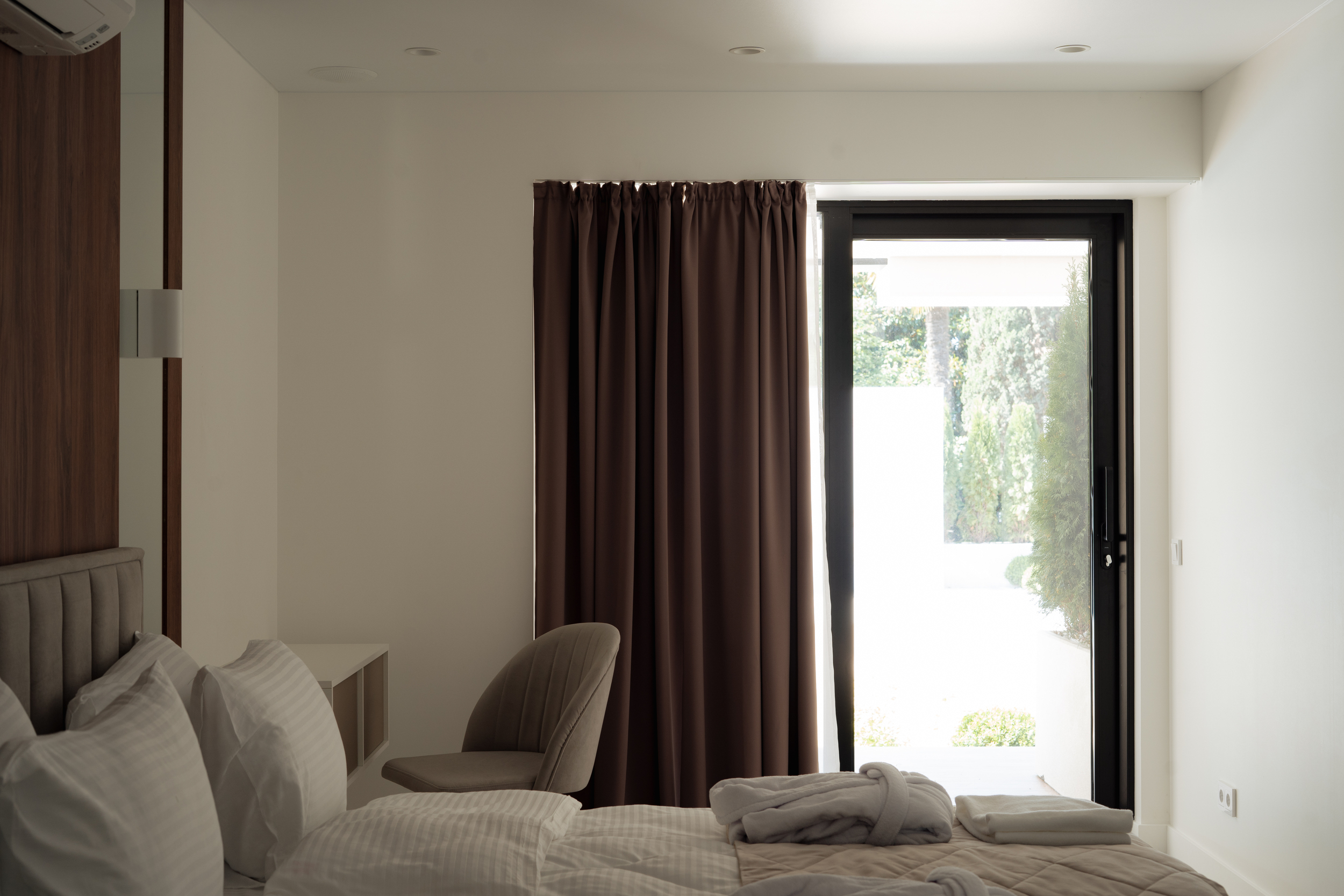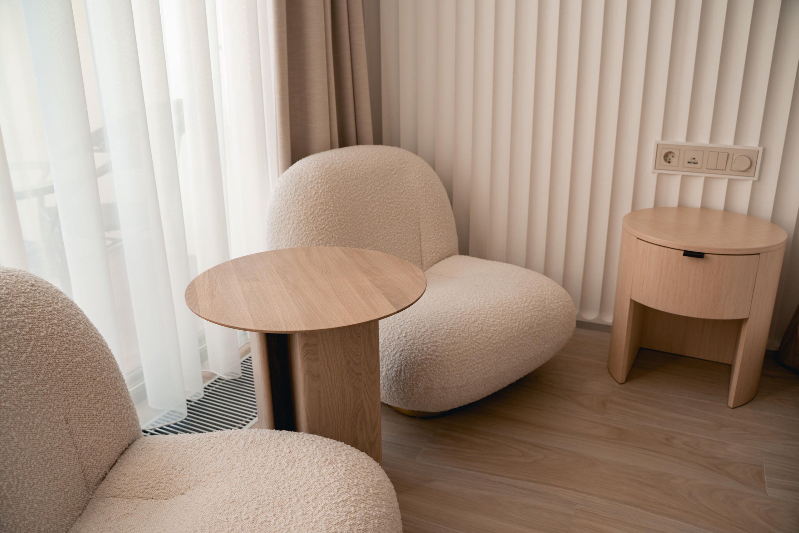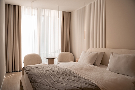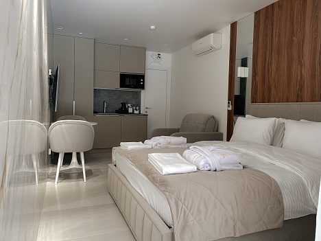 В номере: вешалка, зеркало, кресло-кровать, кровать двуспальная, прикроватные тумбочки, стулья, шкаф, кондиционер, микроволновая печь, набор посуды, пляжные полотенца, сейф, телевизор, холодильник, чайный набор посуды, электрочайник
