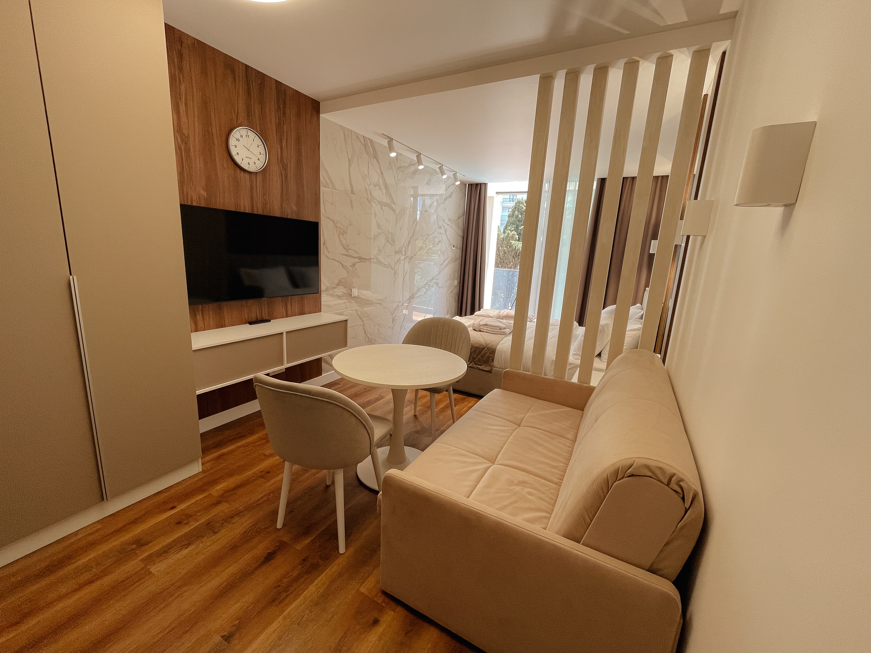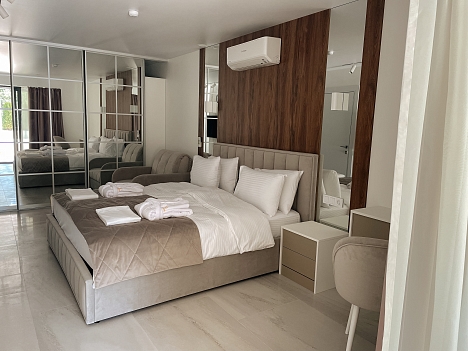 В номере: вешалка, диван раскладной, зеркало, кровать двуспальная, прикроватные тумбочки, стулья, шкаф, кондиционер, набор посуды, пляжные полотенца, сейф, телевизор, холодильник, чайный набор посуды, электрочайник