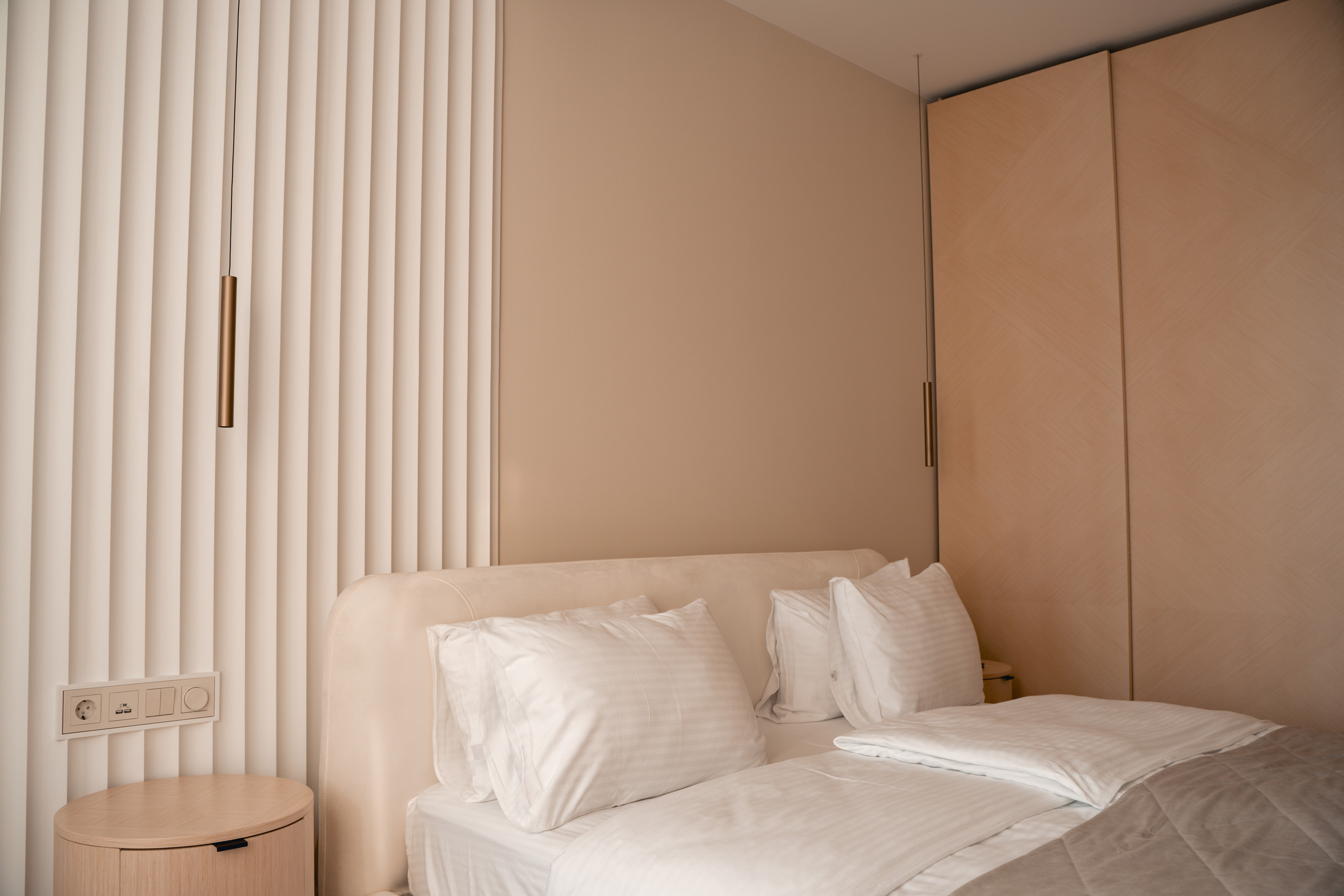 В номере: вешалка, зеркало, кресло-кровать, кровать двуспальная, прикроватные тумбочки, стулья, шкаф, кондиционер, микроволновая печь, набор посуды, плита электрическая, пляжные полотенца, сейф, телевизор, холодильник, чайный набор посуды, электрочайник