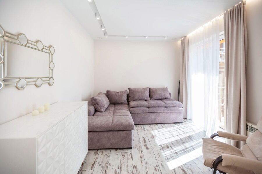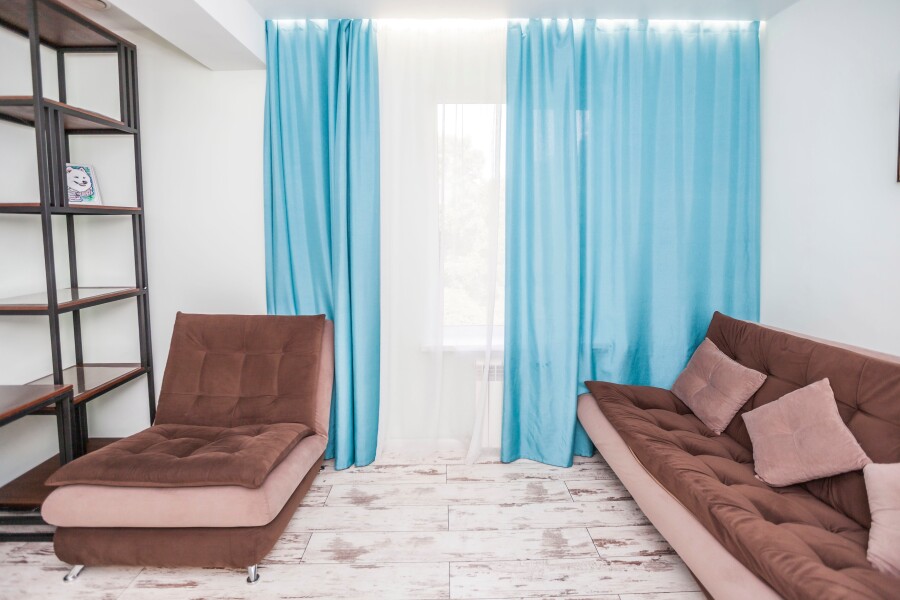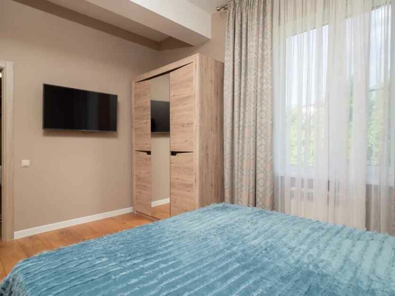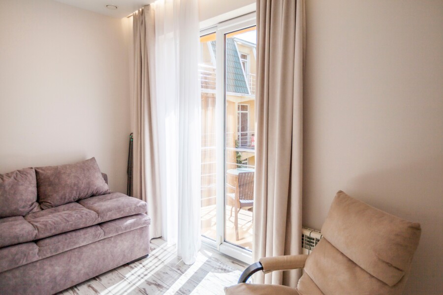 В номере: вешалка, диван раскладной, зеркало, комод, кресло, кровать двуспальная, стеллаж, стол, стулья, шкаф, гладильная доска, духовой шкаф, кондиционер, микроволновая печь, набор посуды, плита электрическая, стиральная машина, сушилка для белья, телевизор ЖК, утюг, холодильник, электрочайник