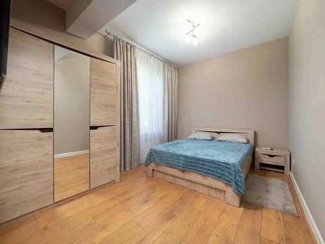В номере: вешалка, диван раскладной, зеркало, кровать двуспальная, прикроватные тумбочки, стол, стулья, шкаф, гладильная доска, духовой шкаф, кондиционер, микроволновая печь, набор посуды, плита электрическая, стиральная машина, сушилка для белья, телевизор ЖК, утюг, холодильник, электрочайник