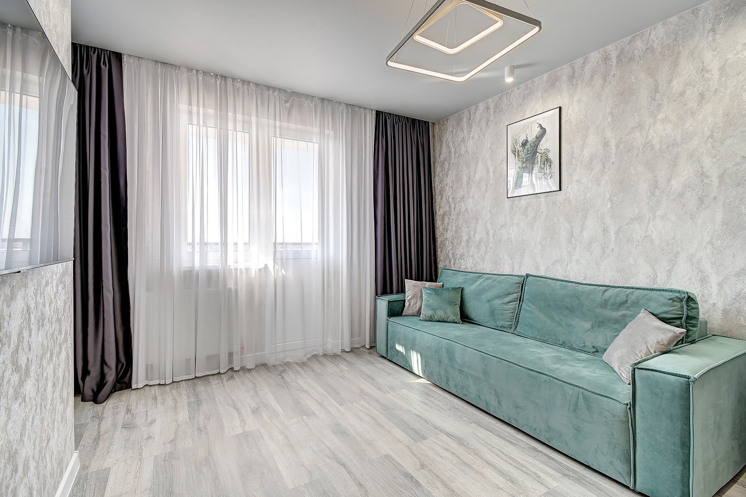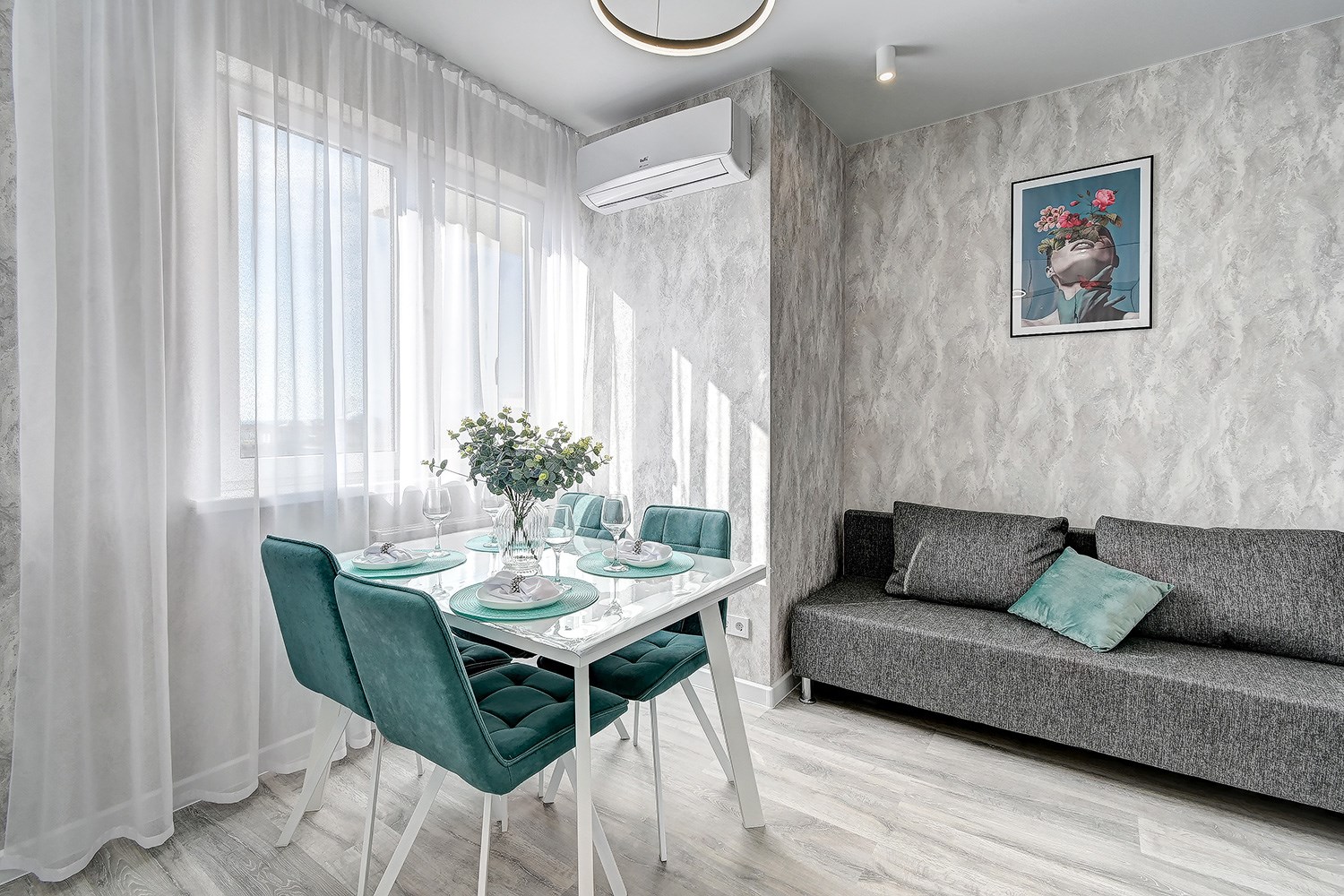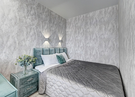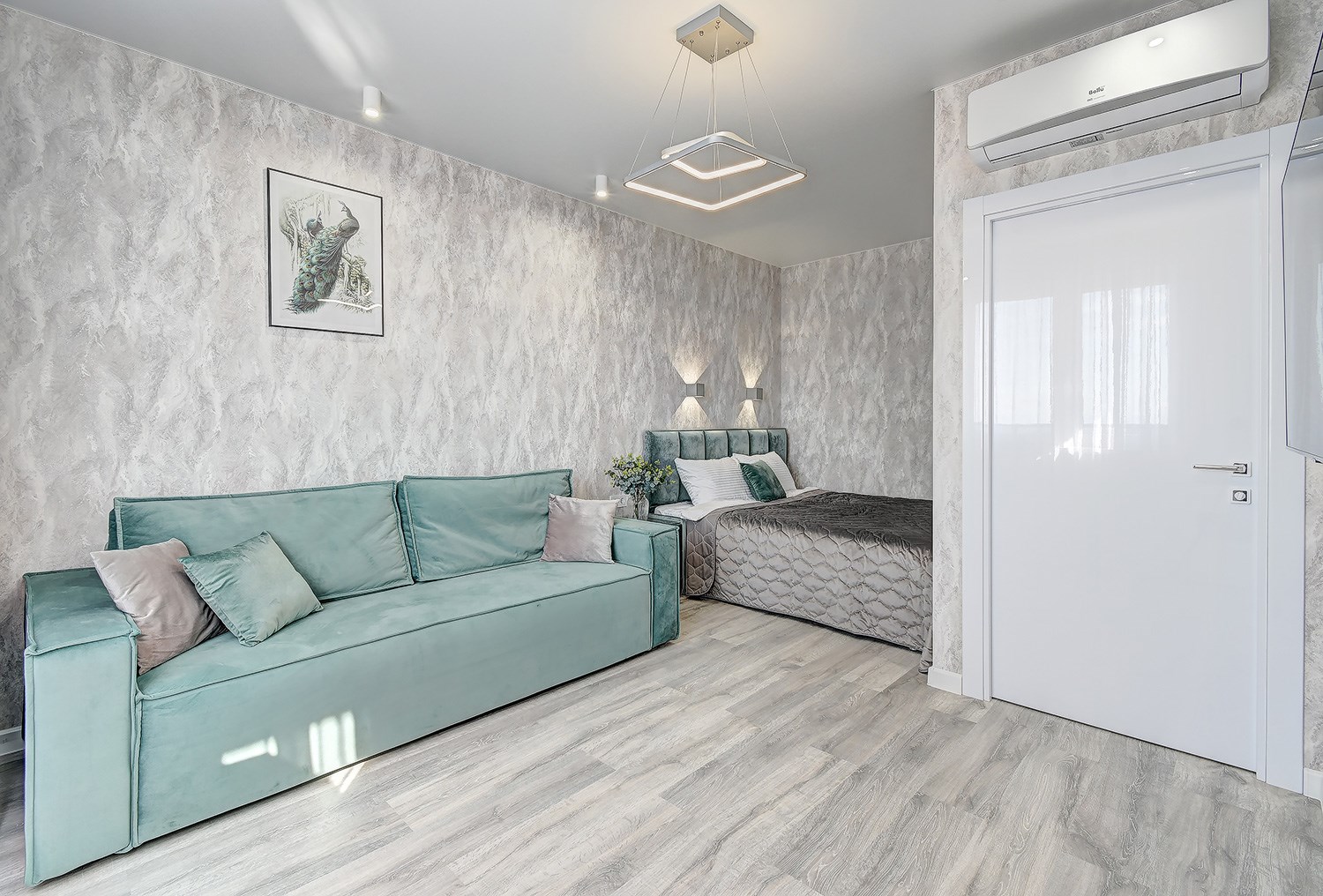 В номере: вешалка, диван, зеркало, кровать двуспальная, прикроватные тумбочки, стол, стулья, шкаф, микроволновая печь, набор посуды, плита электрическая, сплит-система, стиральная машина, телевизор, холодильник, электрочайник