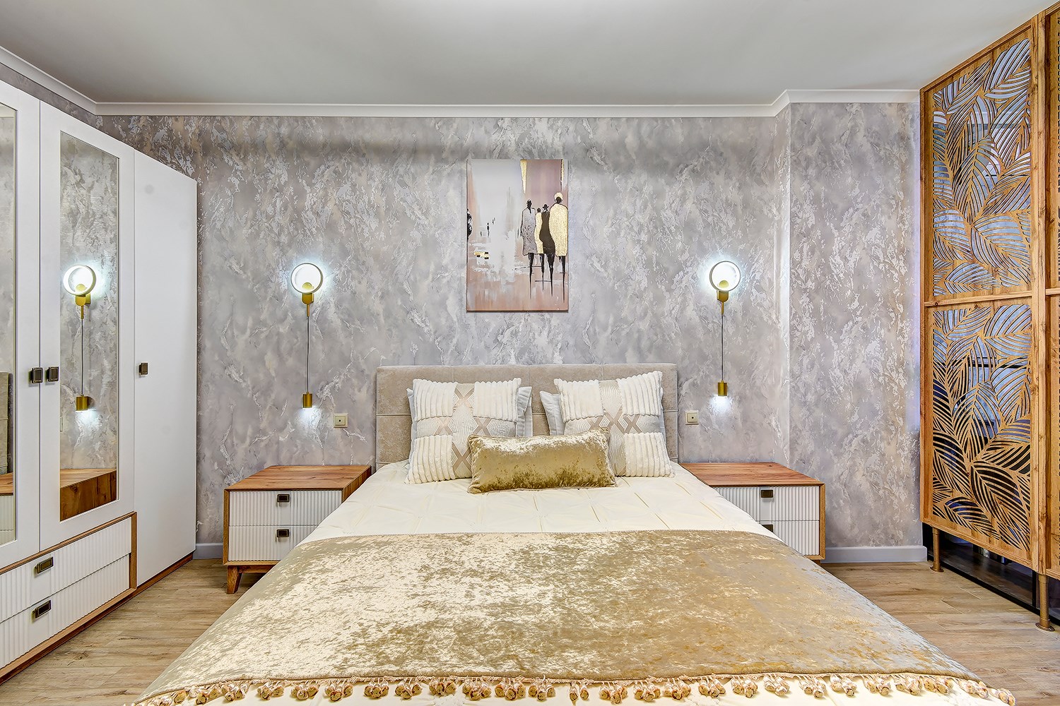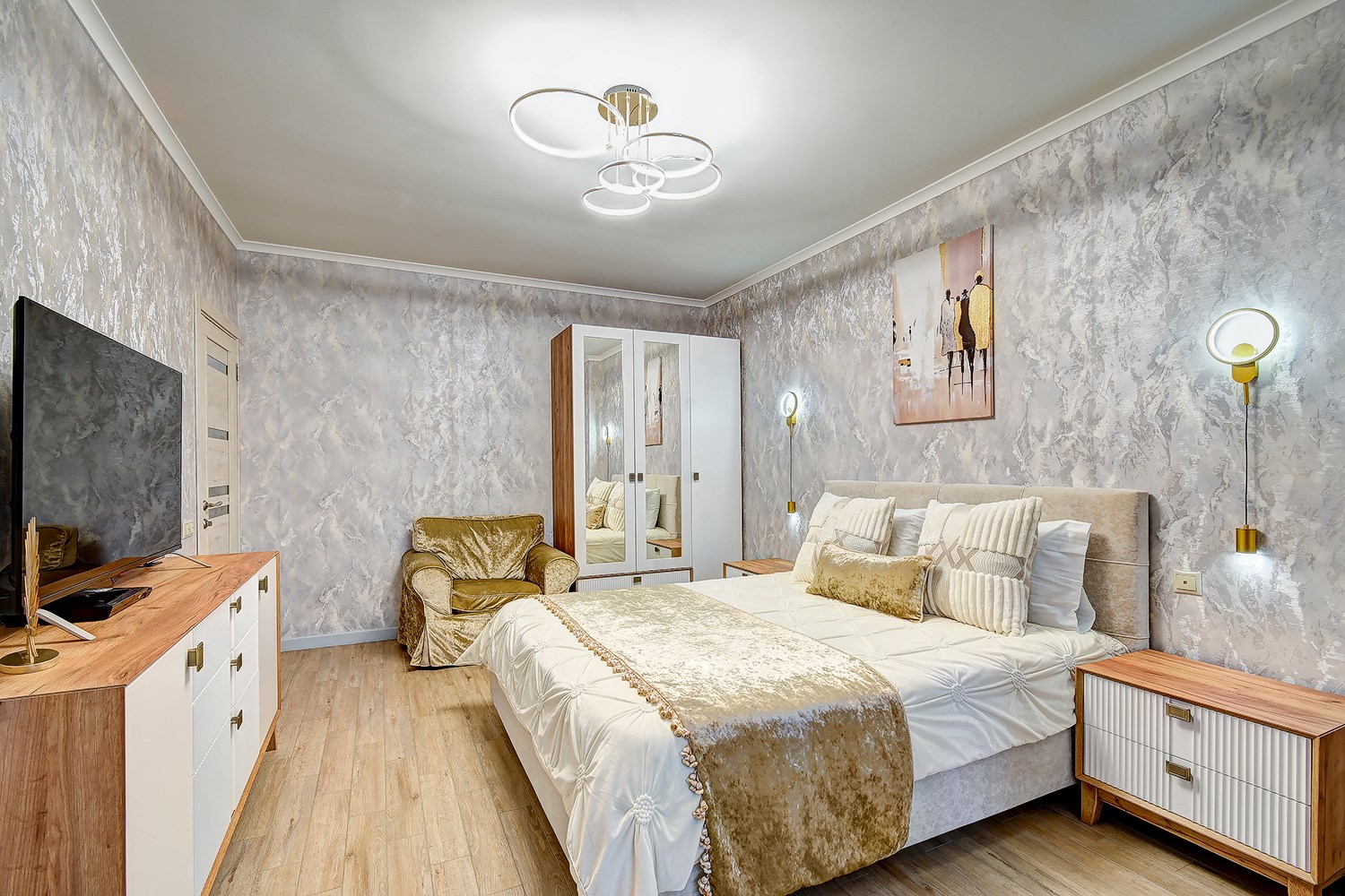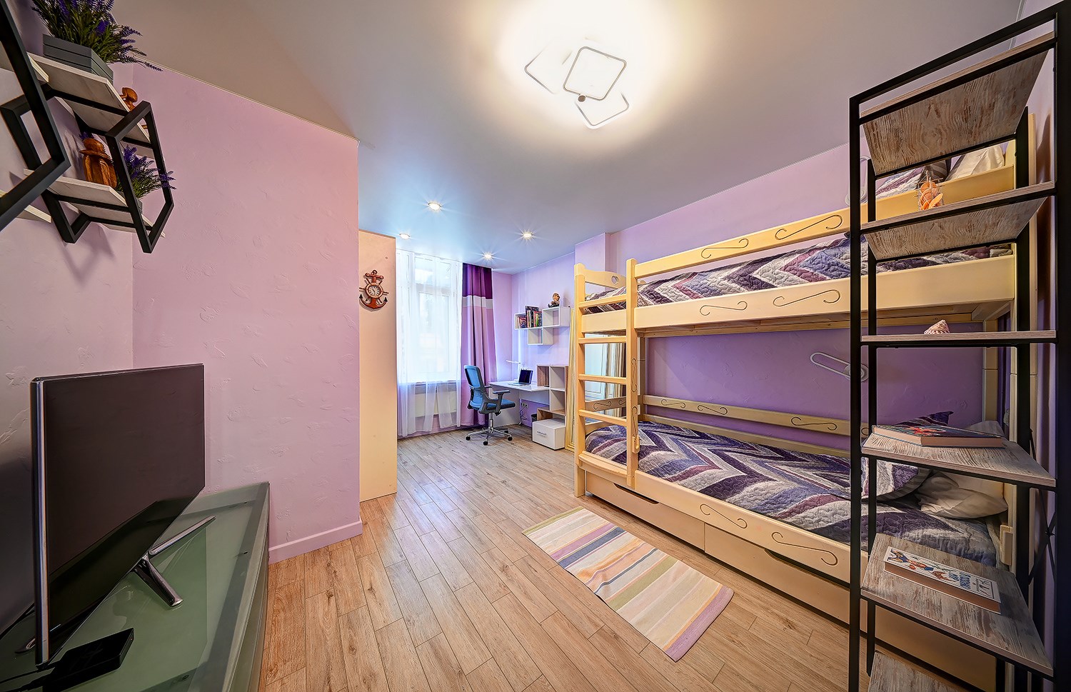 В номере: диван раскладной, зеркало, кресло, кровать двуспальная, кровать двухъярусная, стол, столик журнальный, стол обеденный, стулья, тумба под телевизор, шкаф, весы, духовой шкаф, камин, кондиционер, микроволновая печь, мультиварка, набор посуды, плита газовая, посудомоечная машина, пылесос, стиральная машина, телевизор ЖК, утюг, холодильник, электрочайник