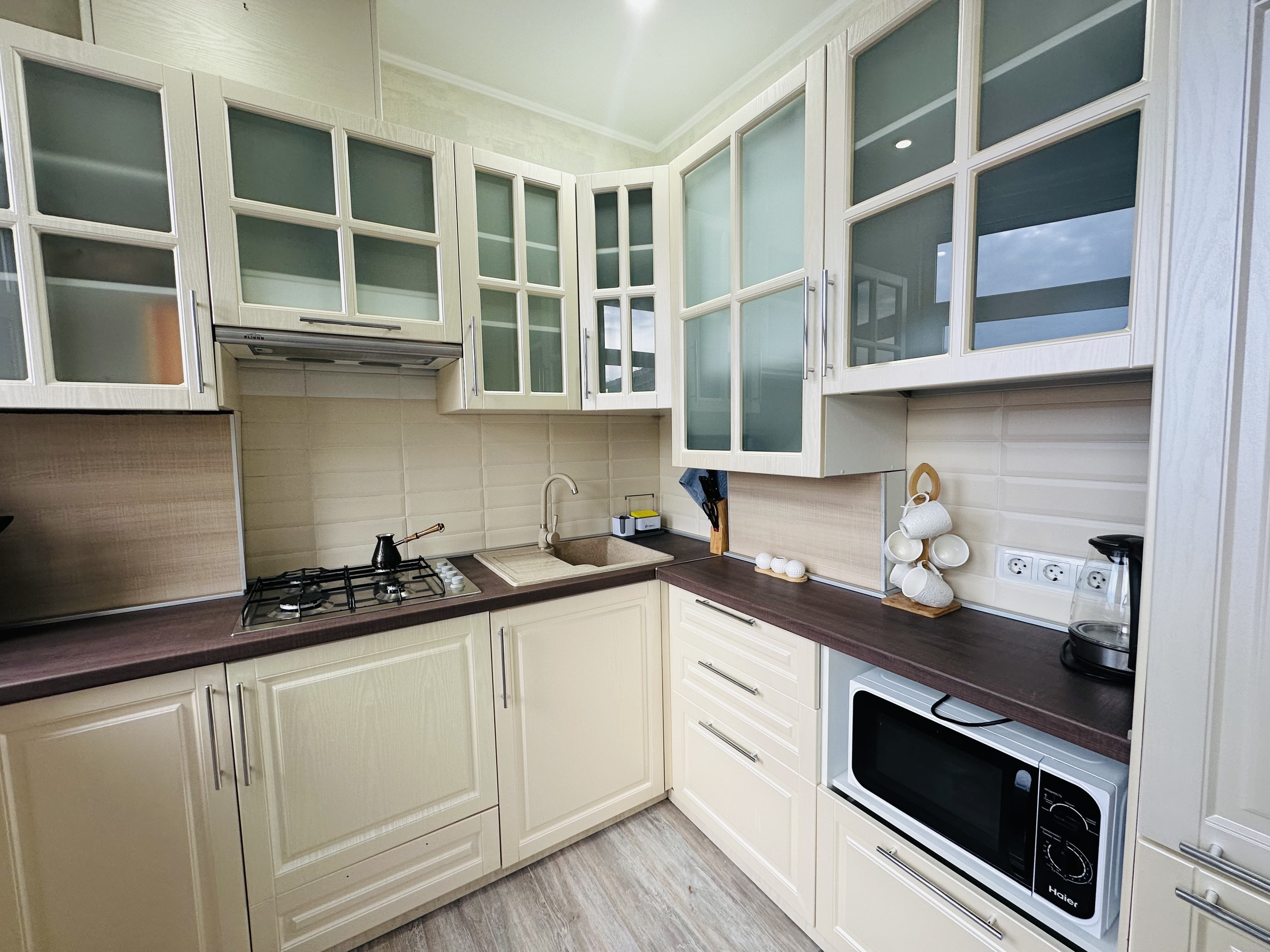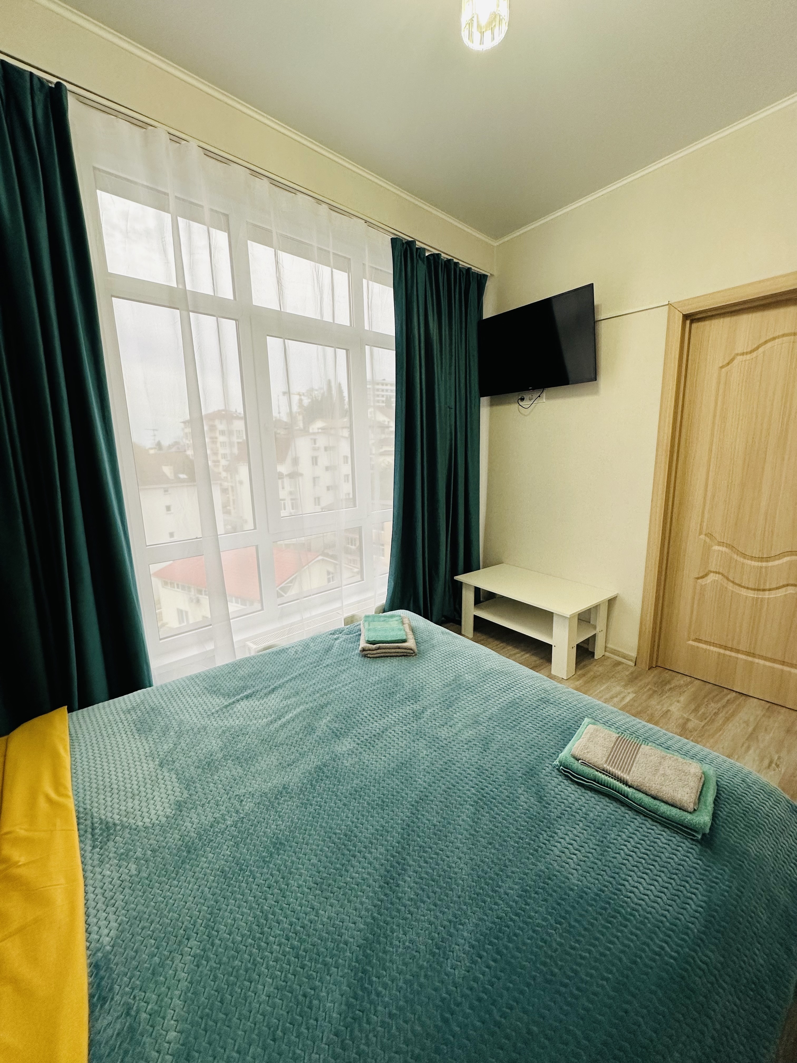 В номере: вешалка, диван, зеркало, кровать двуспальная, прикроватная тумбочка, стол, столик журнальный, стулья, шкаф, кондиционер, микроволновая печь, набор посуды, плита газовая, стиральная машина, телевизор, холодильник, электрочайник