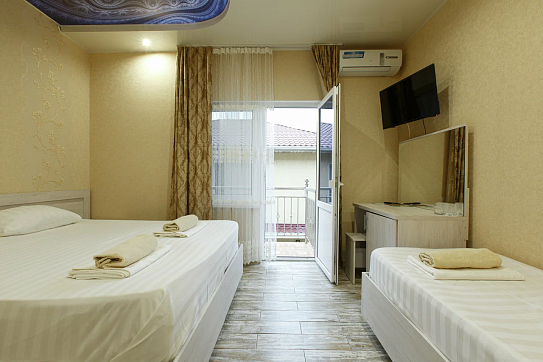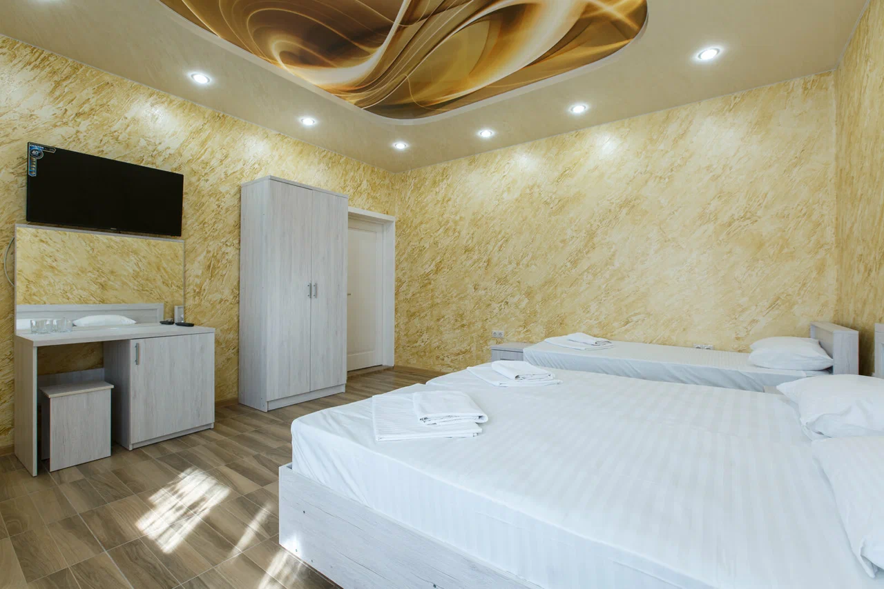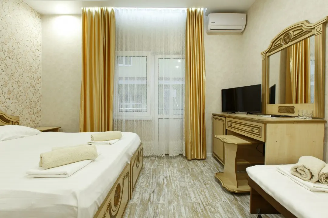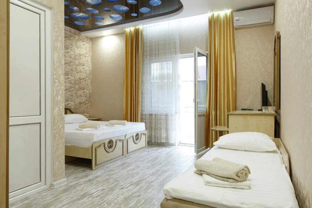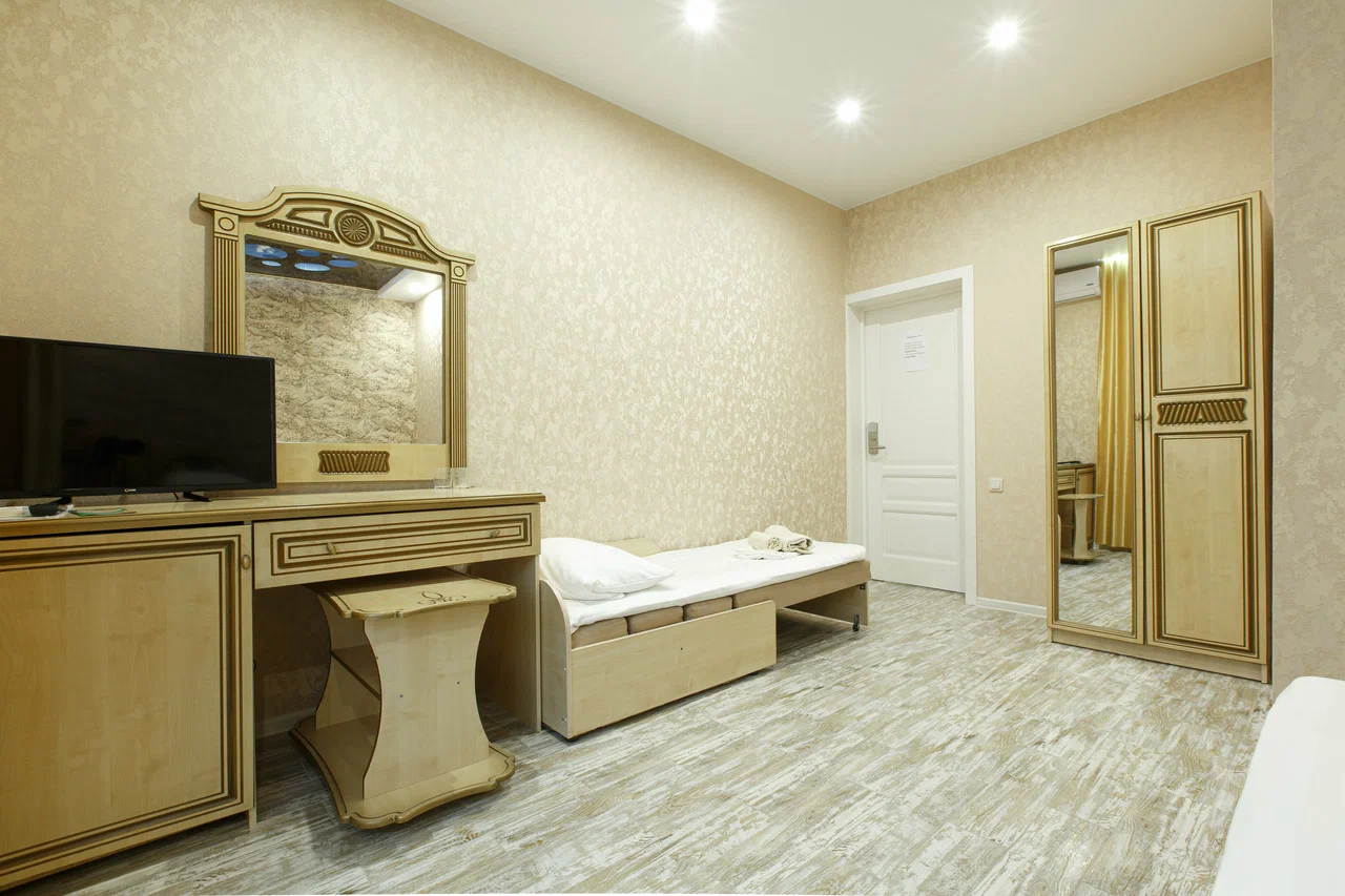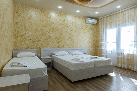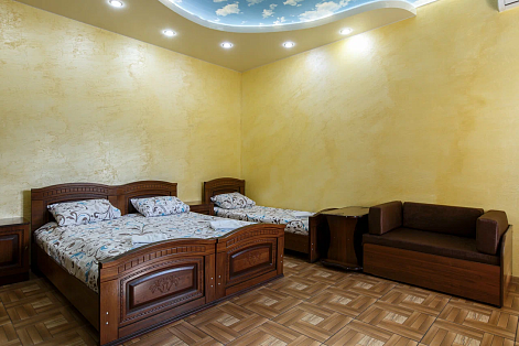 В номере: диван раскладной, зеркало, кровати односпальные /одна двуспальная кровать, стол, стул, шкаф, кондиционер, телевизор ЖК, холодильник