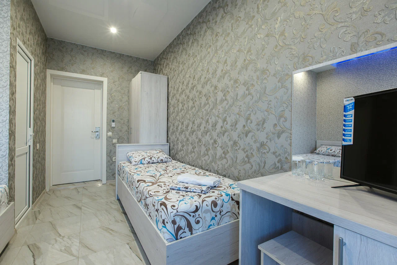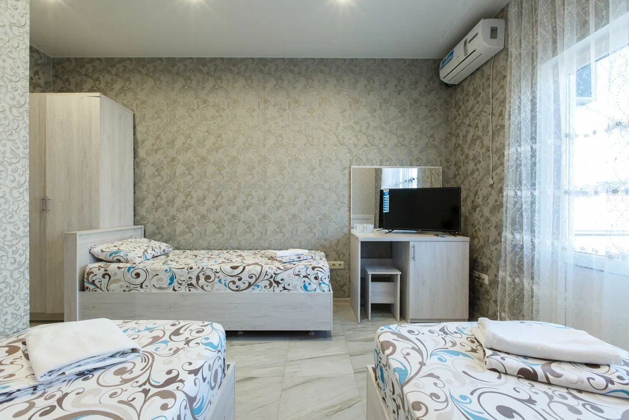 В номере: зеркало, кровати односпальные, прикроватные тумбочки, стол, стул, шкаф, кондиционер, телевизор ЖК, холодильник