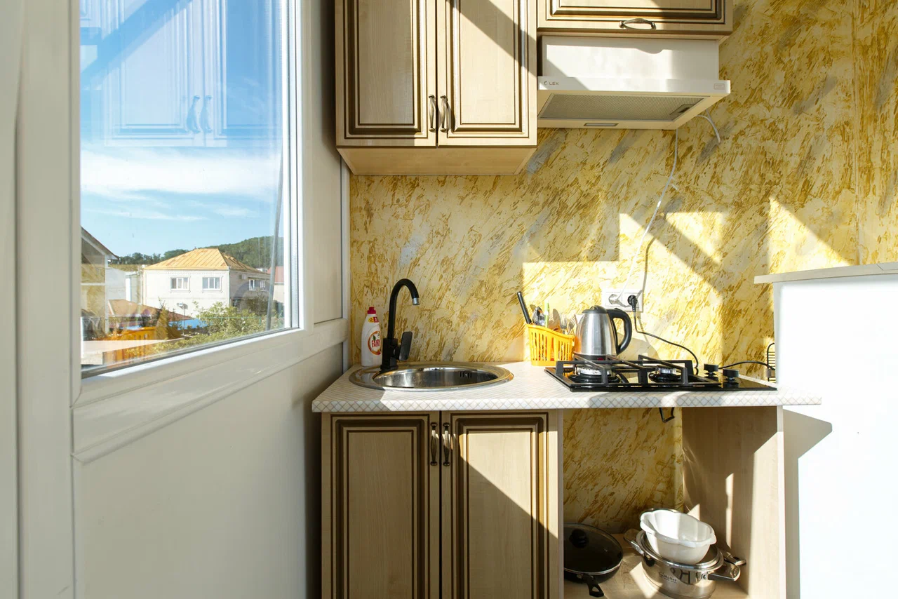 В номере: зеркало, кресло-кровать, кровати односпальные, прикроватные тумбочки, стол, стулья, шкаф, кондиционер, набор посуды, плита газовая, телевизор ЖК, холодильник, электрочайник