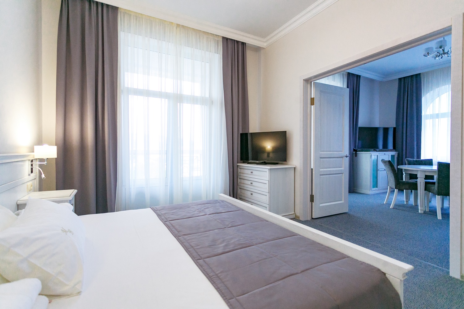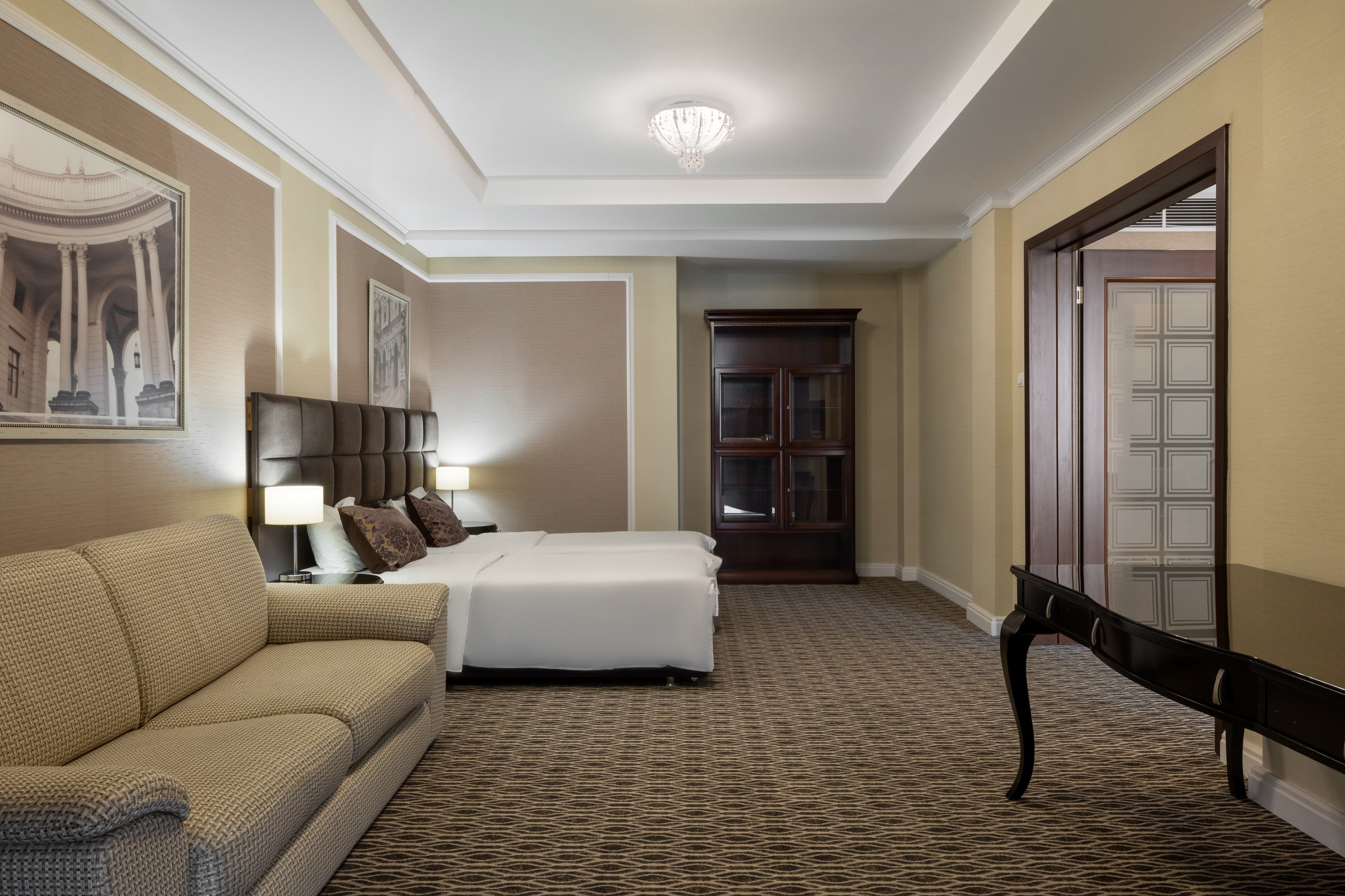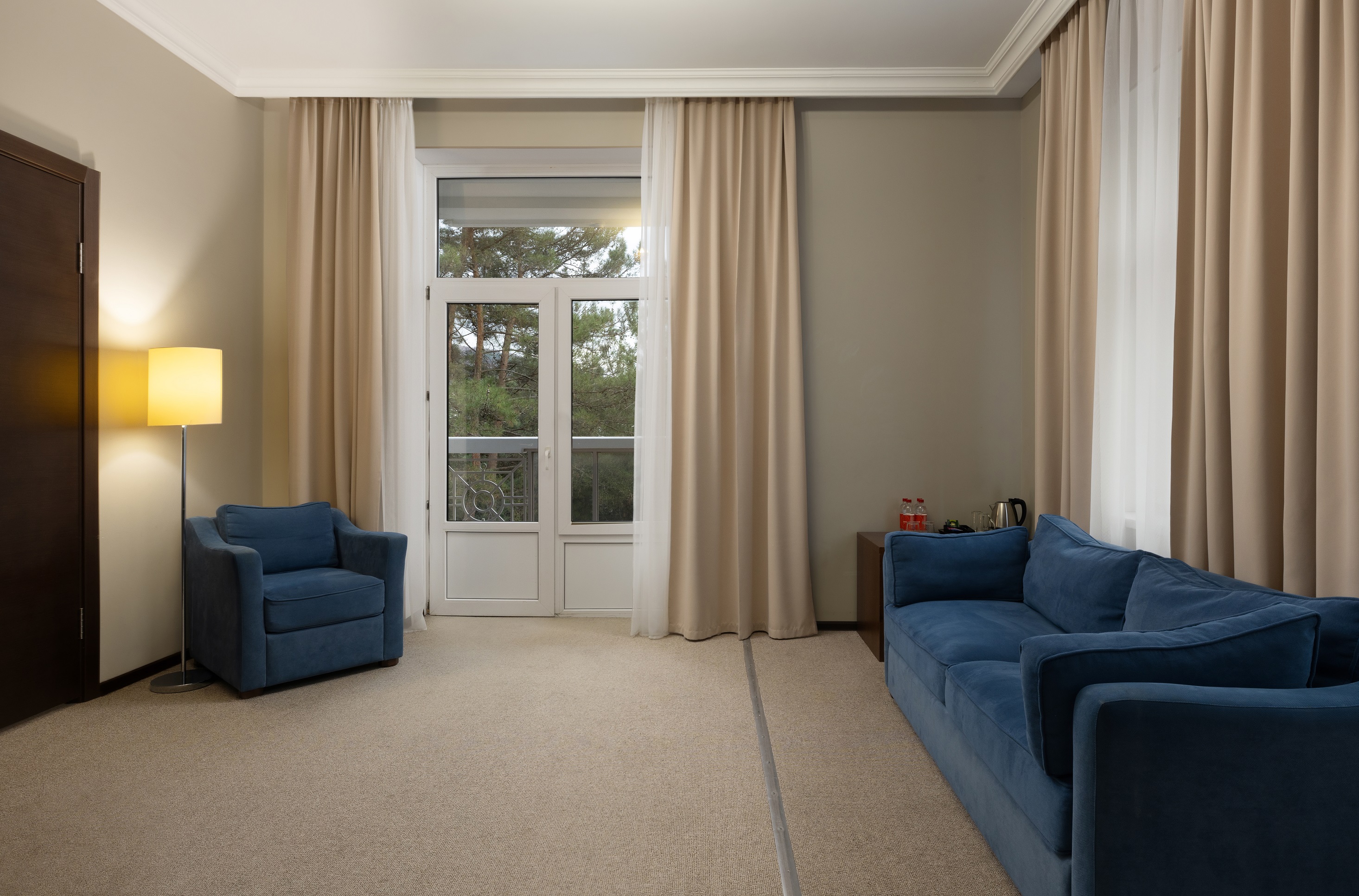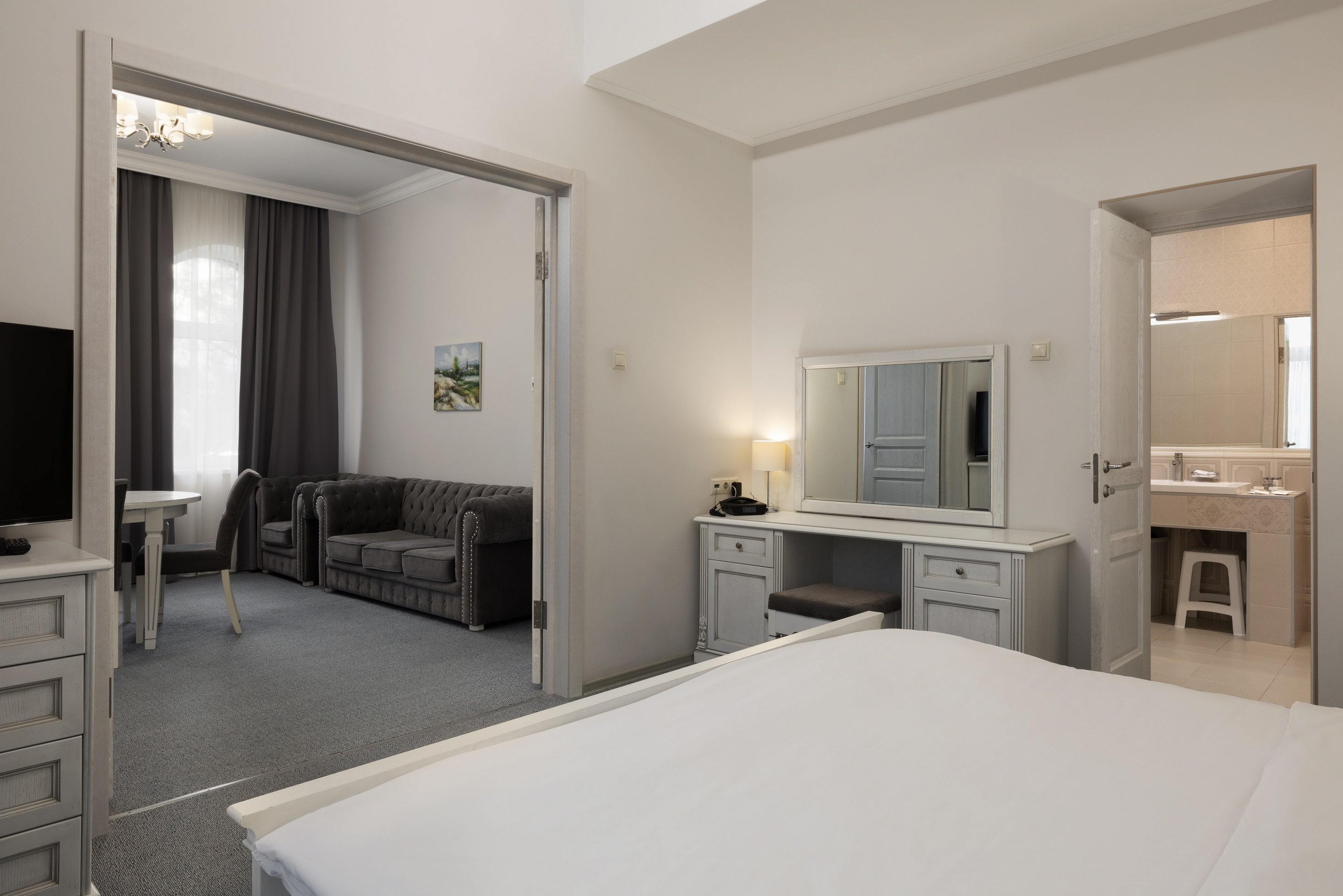 В номере: вешалка, диван, зеркало, комод, кровать двуспальная, прикроватные тумбочки, стол, столик журнальный, стулья, шкаф-купе, сейф, система общего кондиционирования, телевизор ЖК, телефон, холодильник, чайная станция, чайный набор посуды