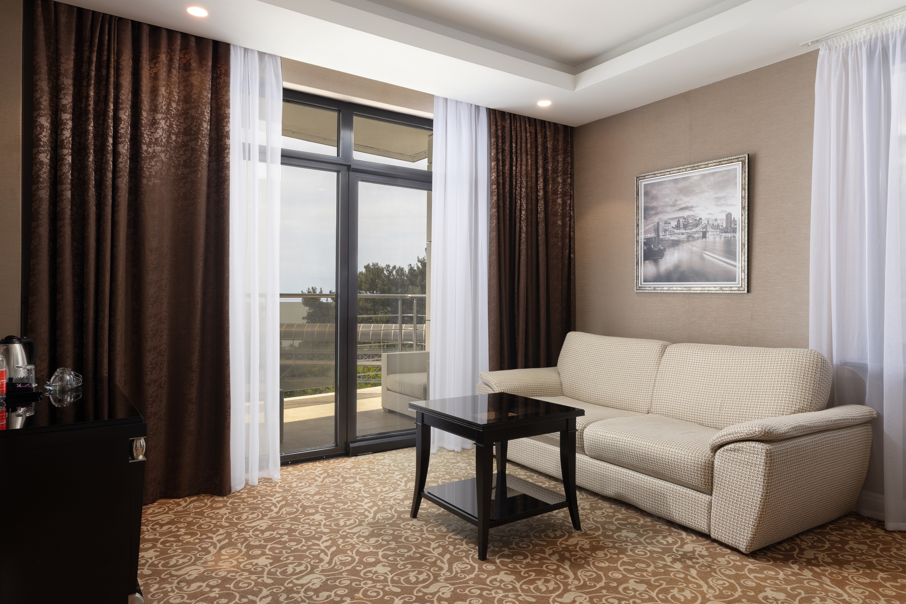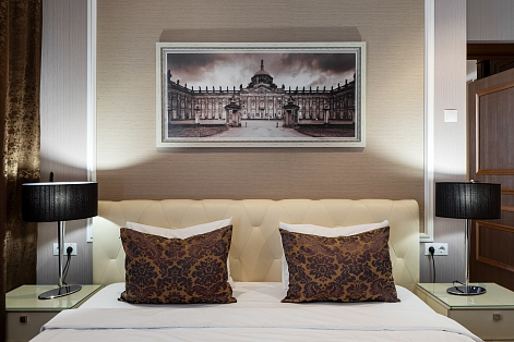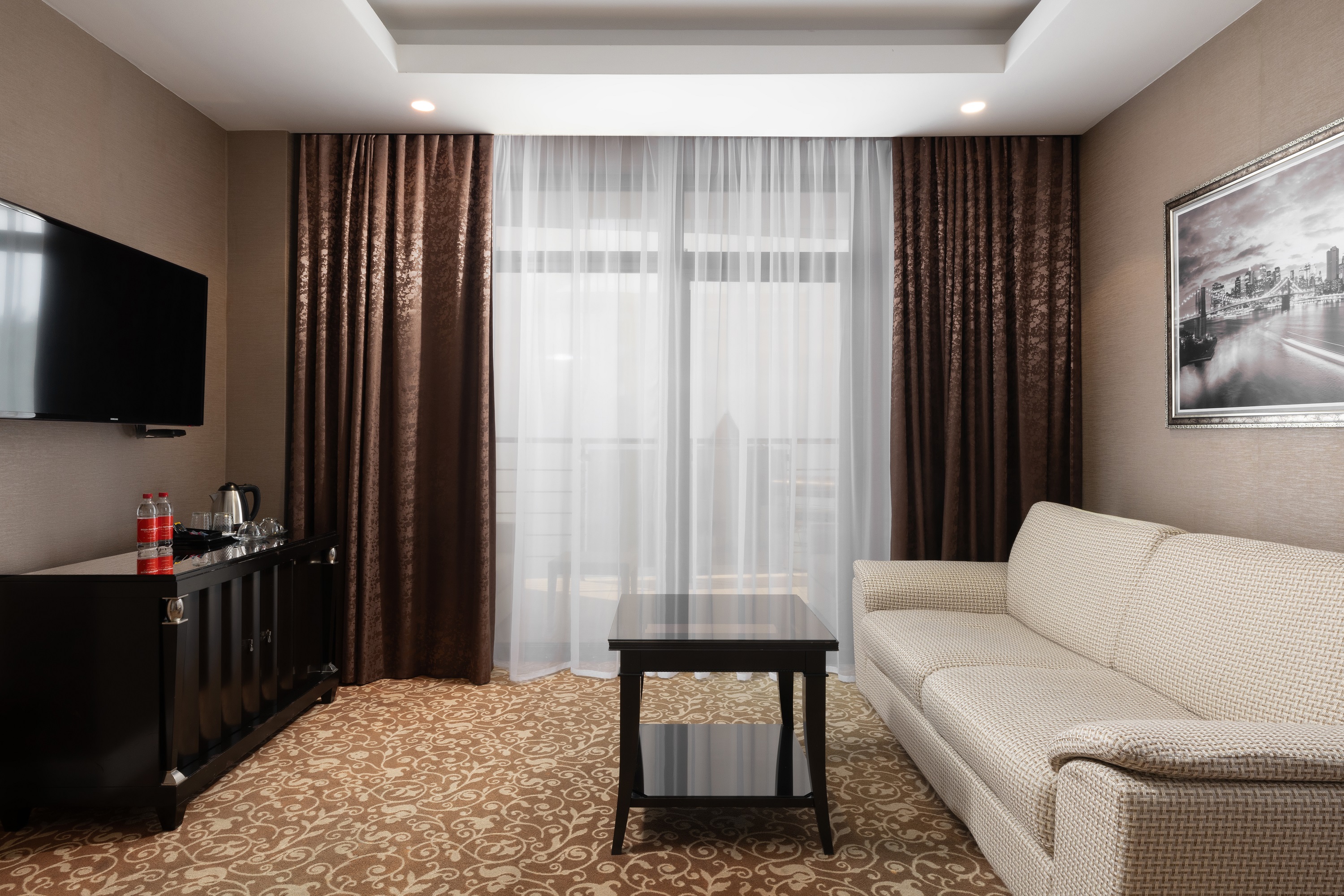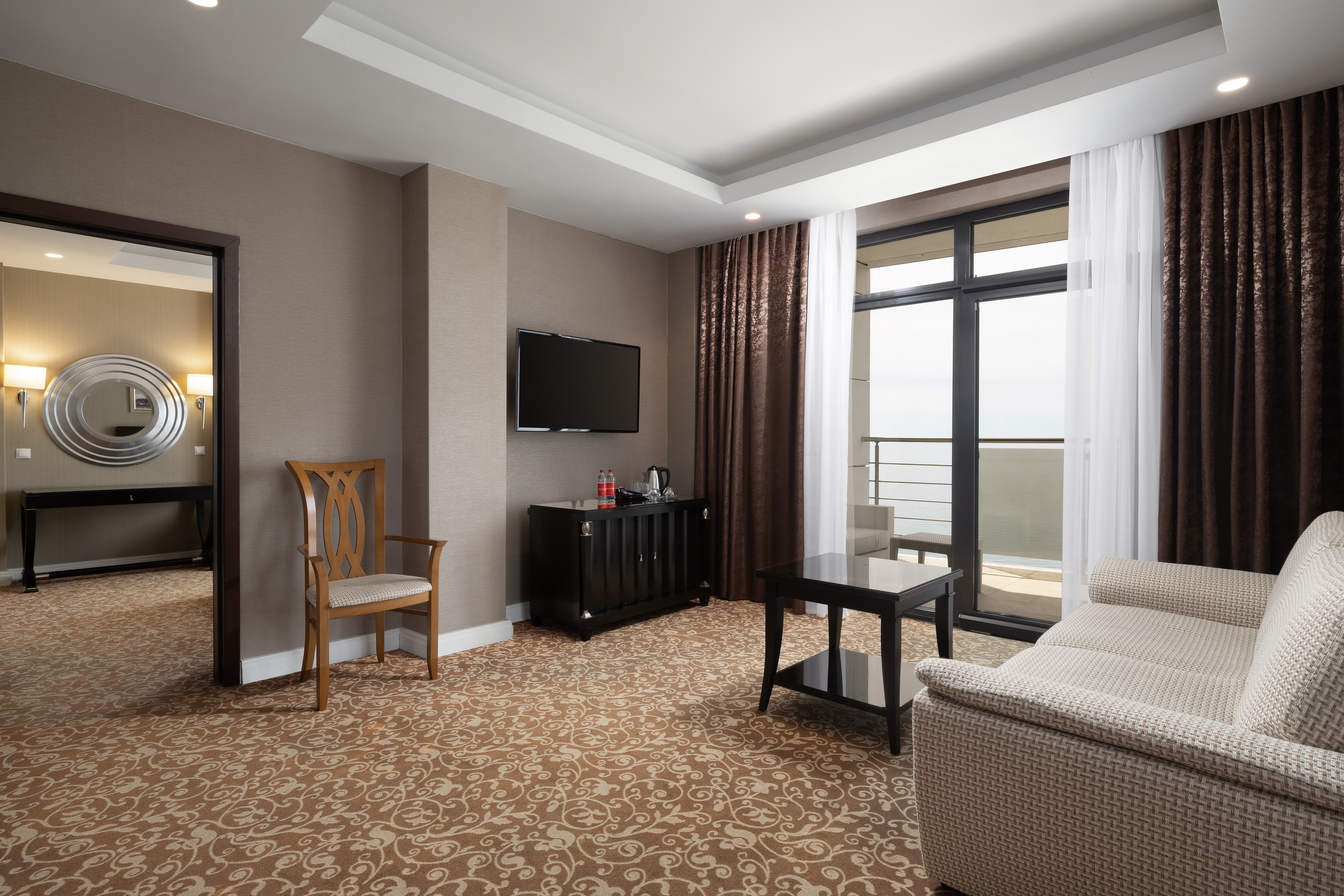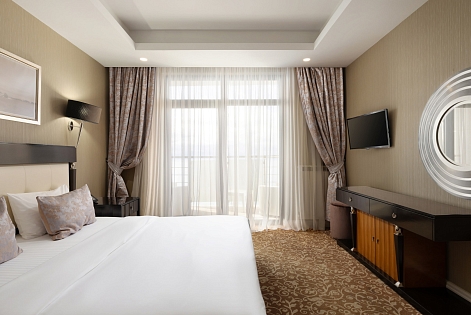 В номере: вешалка, диван, зеркало, кровать двуспальная, прикроватные тумбочки, стол, столик журнальный, столик туалетный, стулья, шкаф-купе, сейф, система общего кондиционирования, телевизор ЖК, телефон, холодильник, чайная станция, чайный набор посуды