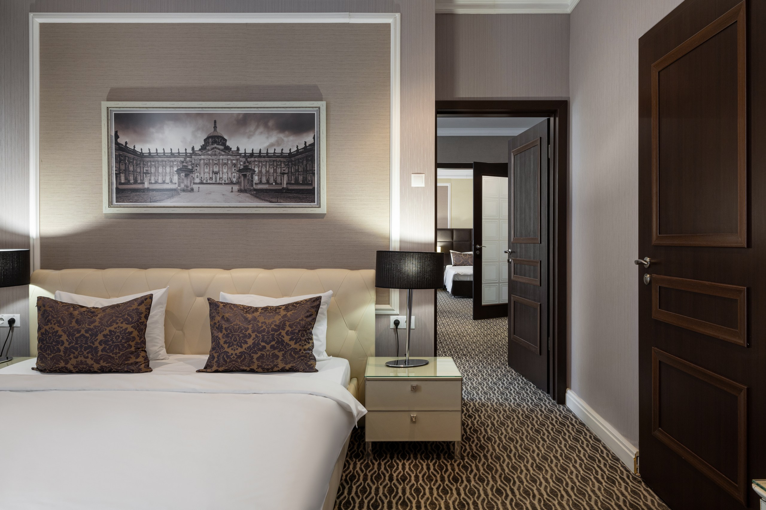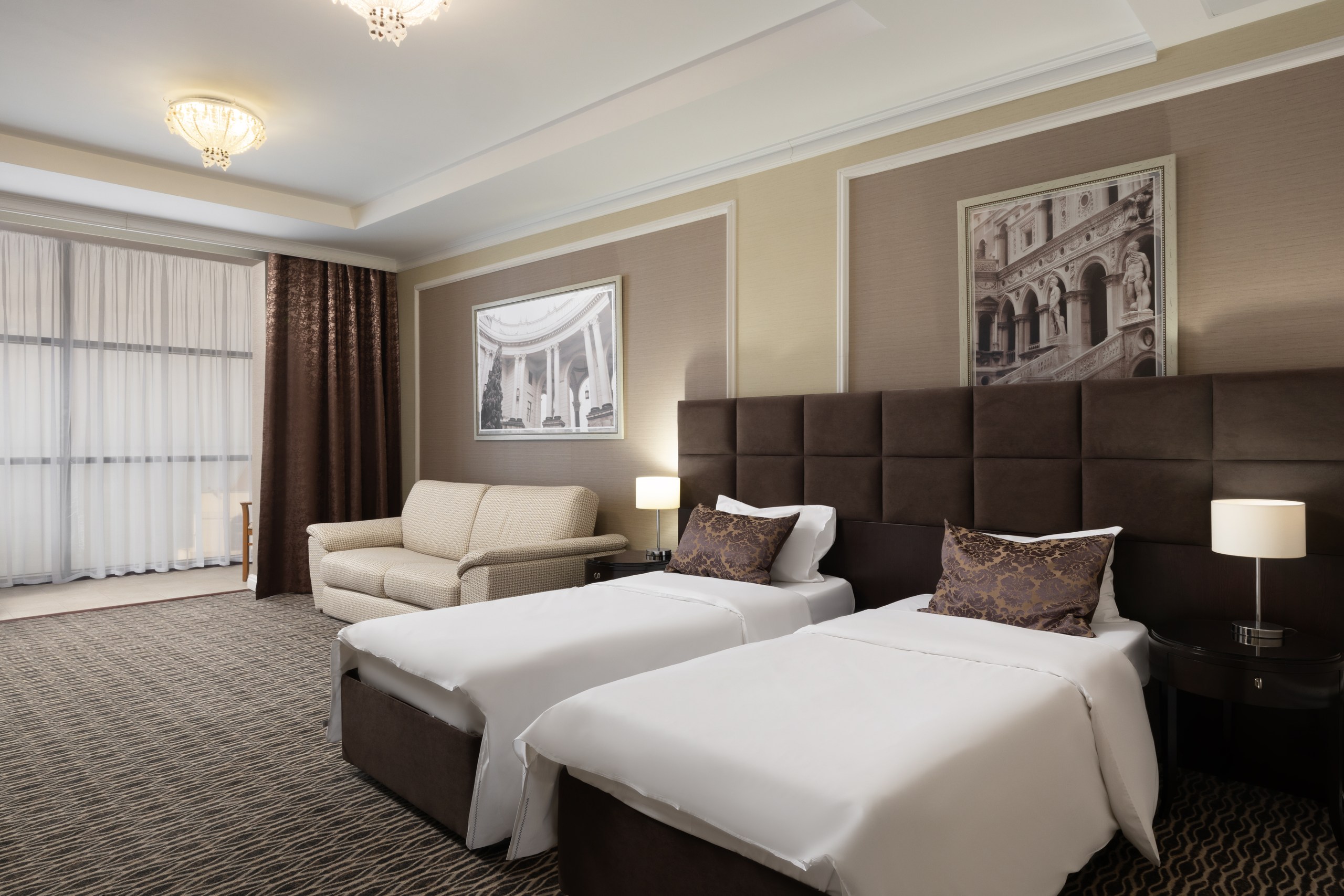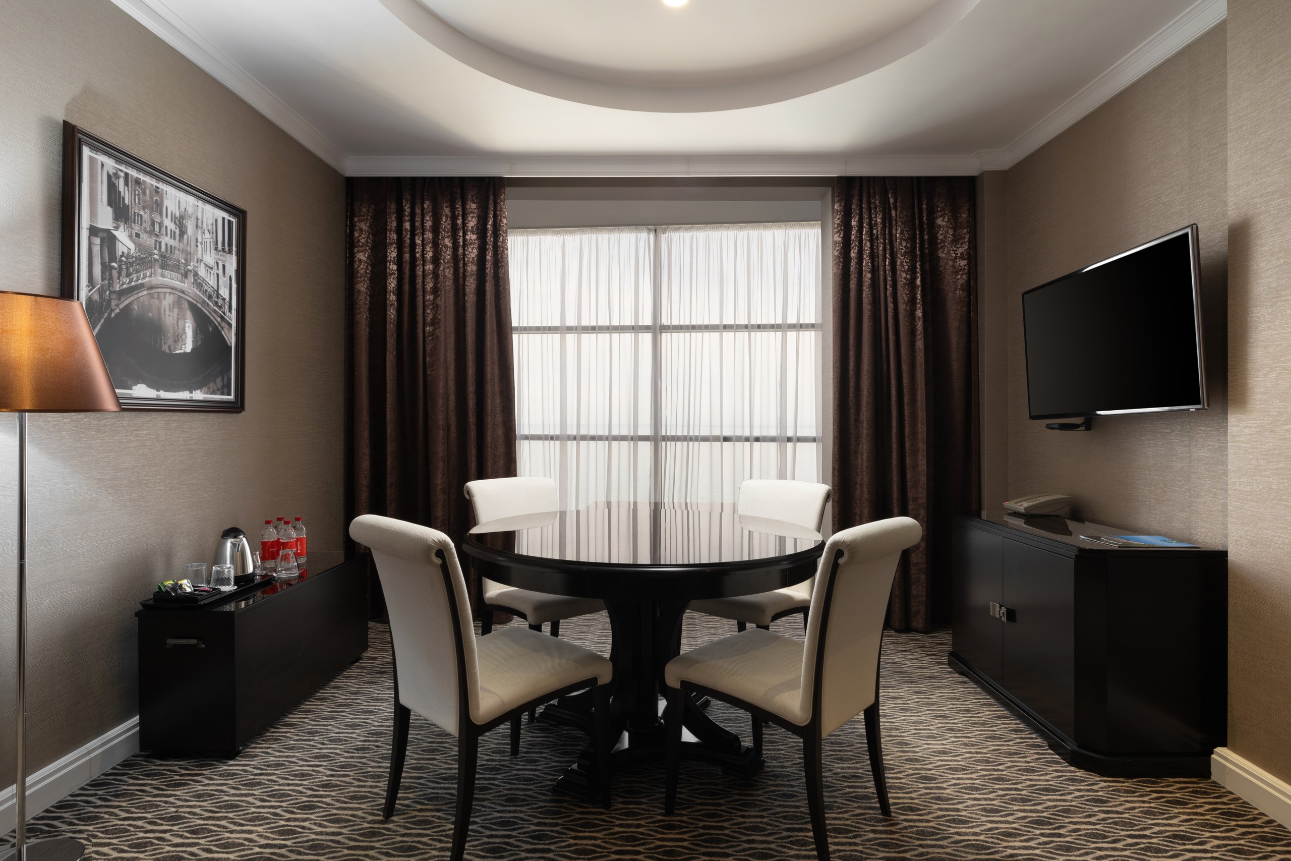 В номере: вешалка, диван, зеркало, кровать двуспальная, прикроватные тумбочки, стол, столик журнальный, столик туалетный, стулья, шкаф-купе, сейф, система общего кондиционирования, телевизор ЖК, телефон, холодильник, чайная станция, чайный набор посуды