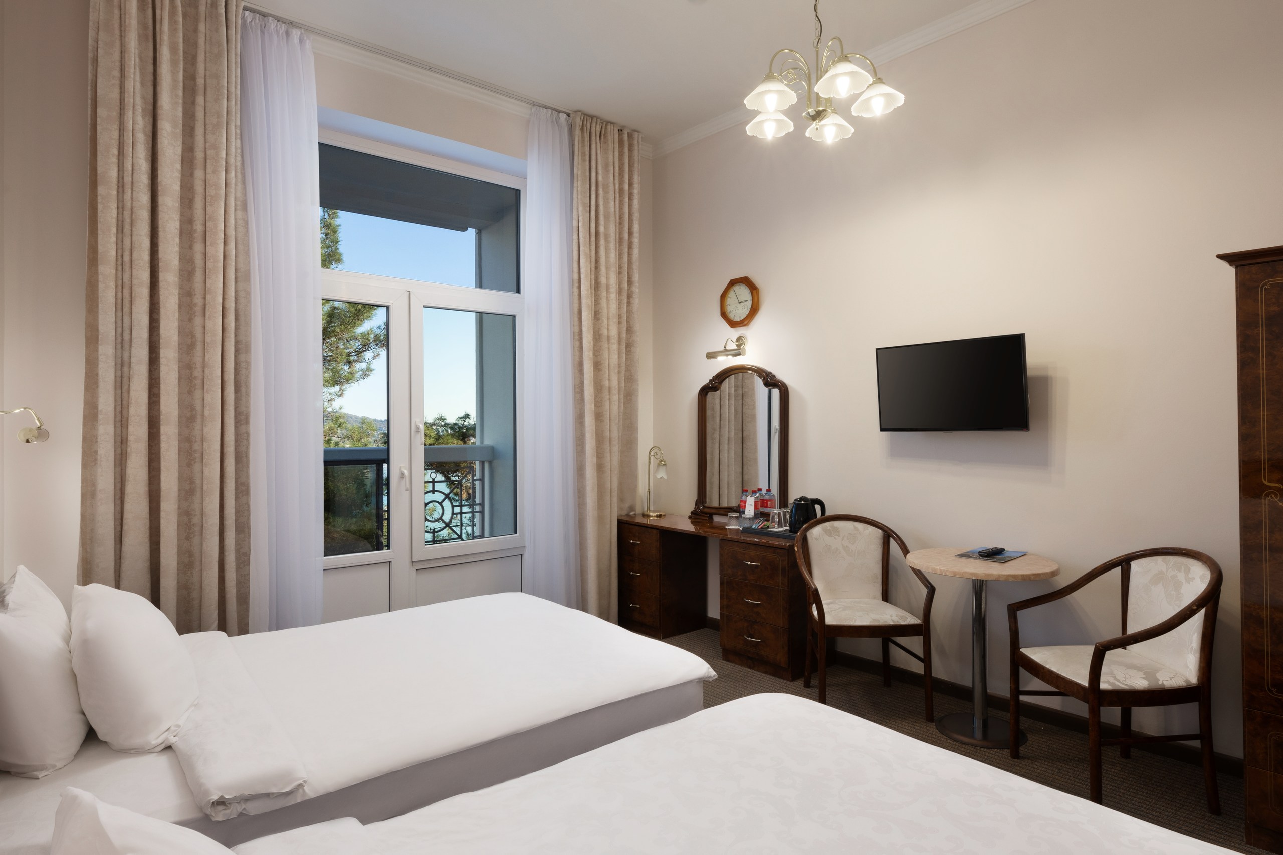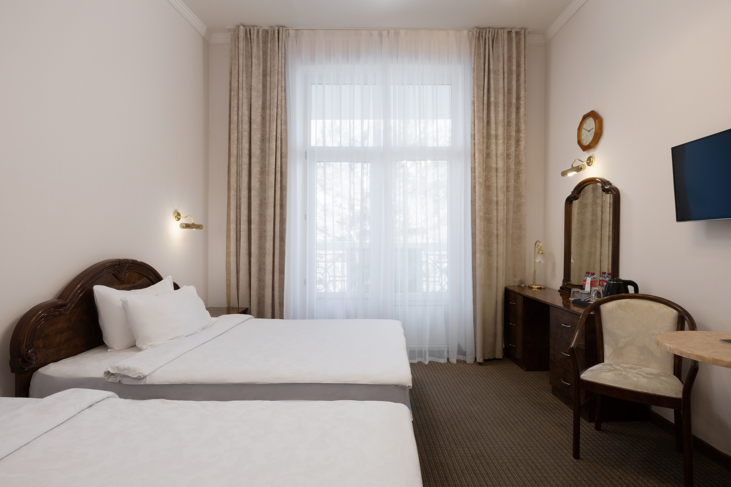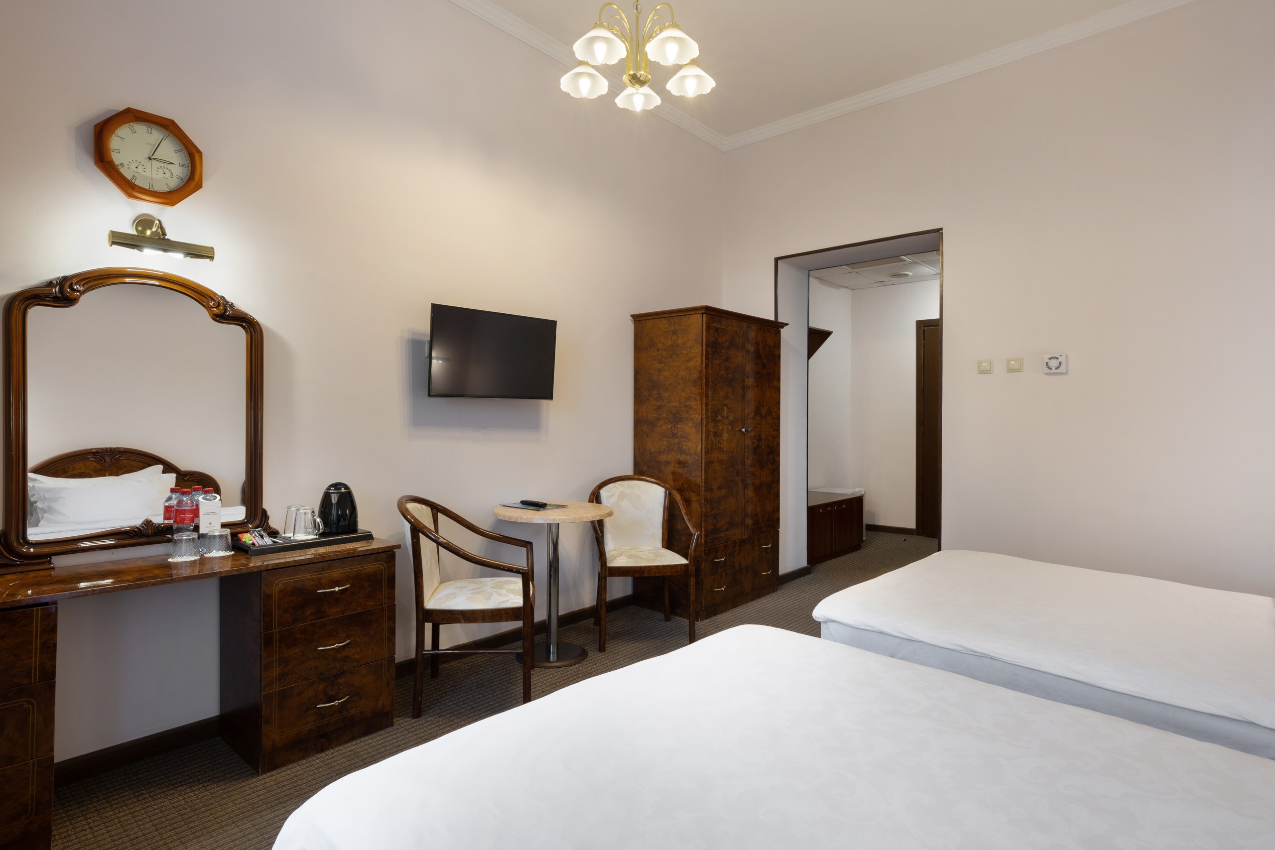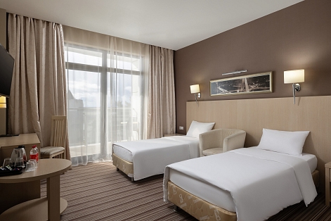 В номере: вешалка, зеркало, кровати односпальные, прикроватные тумбочки, стол, столик туалетный, стулья, шкаф, сейф, система общего кондиционирования, телевизор ЖК, телефон, холодильник, чайная станция, чайный набор посуды