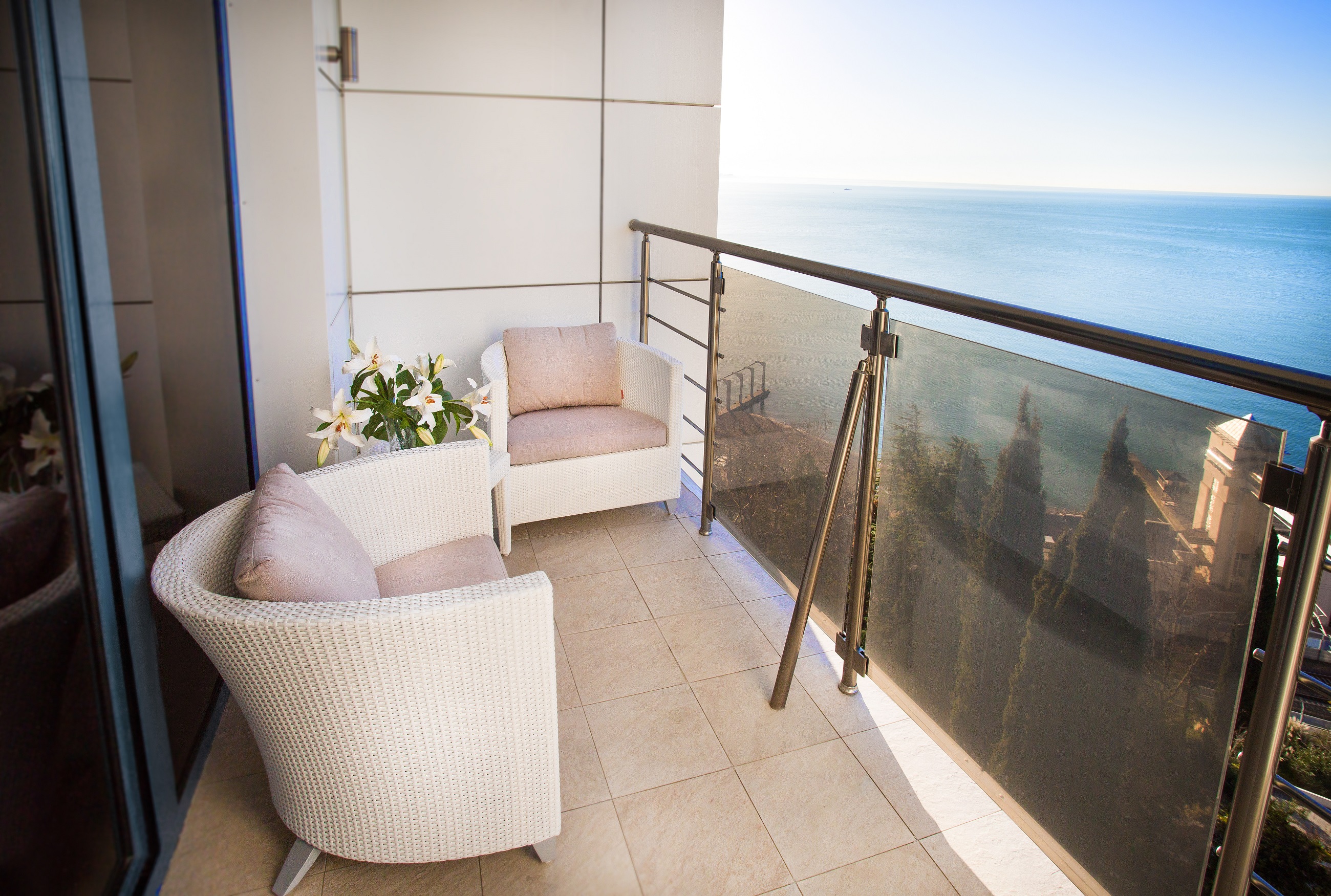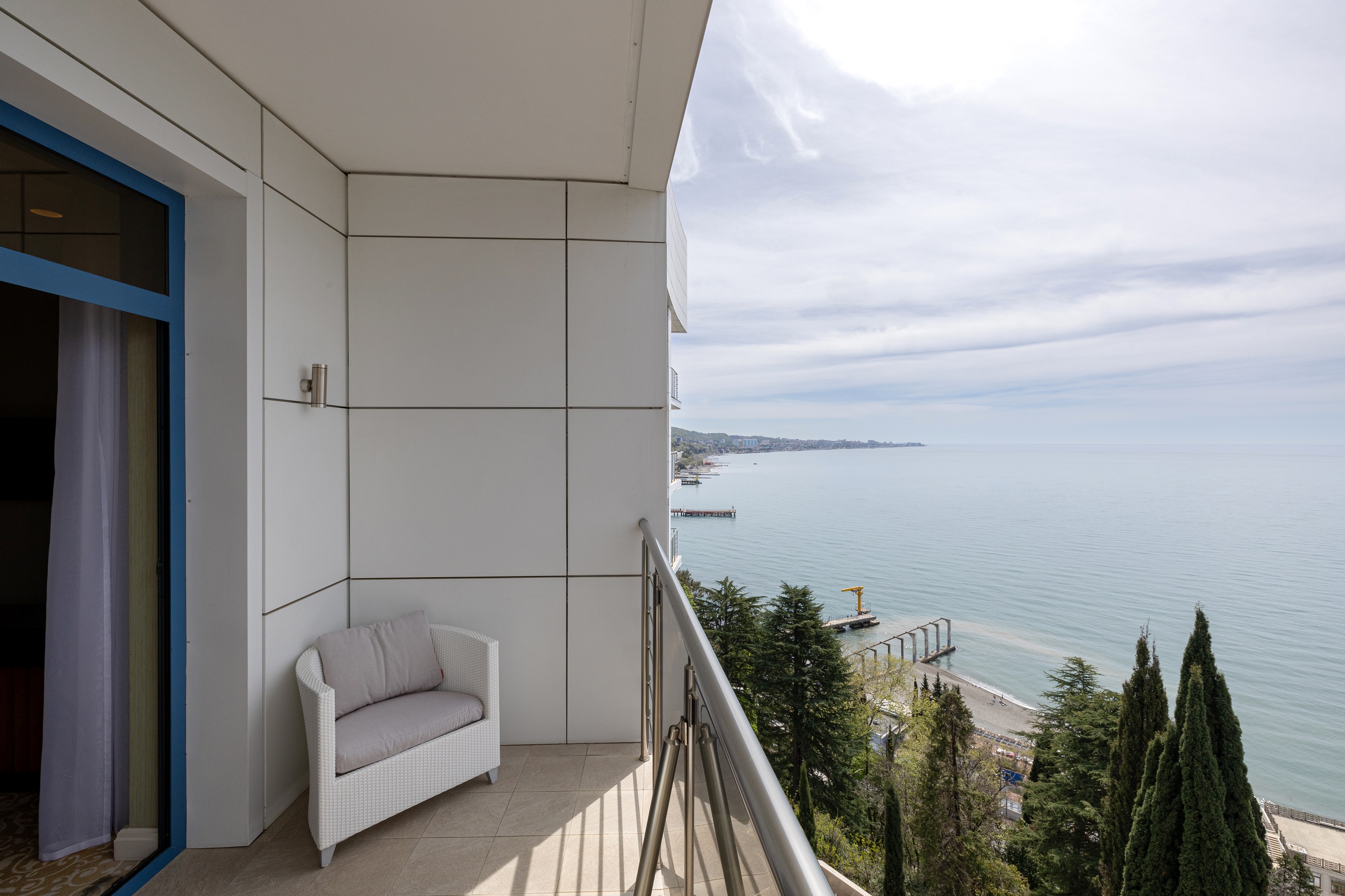В номере: вешалка, диван, зеркало, кресло, кровать двуспальная, прикроватные тумбочки, стол, столик журнальный, стул, шкаф-купе, набор посуды, сейф, система общего кондиционирования, телевизор ЖК, телефон, холодильник