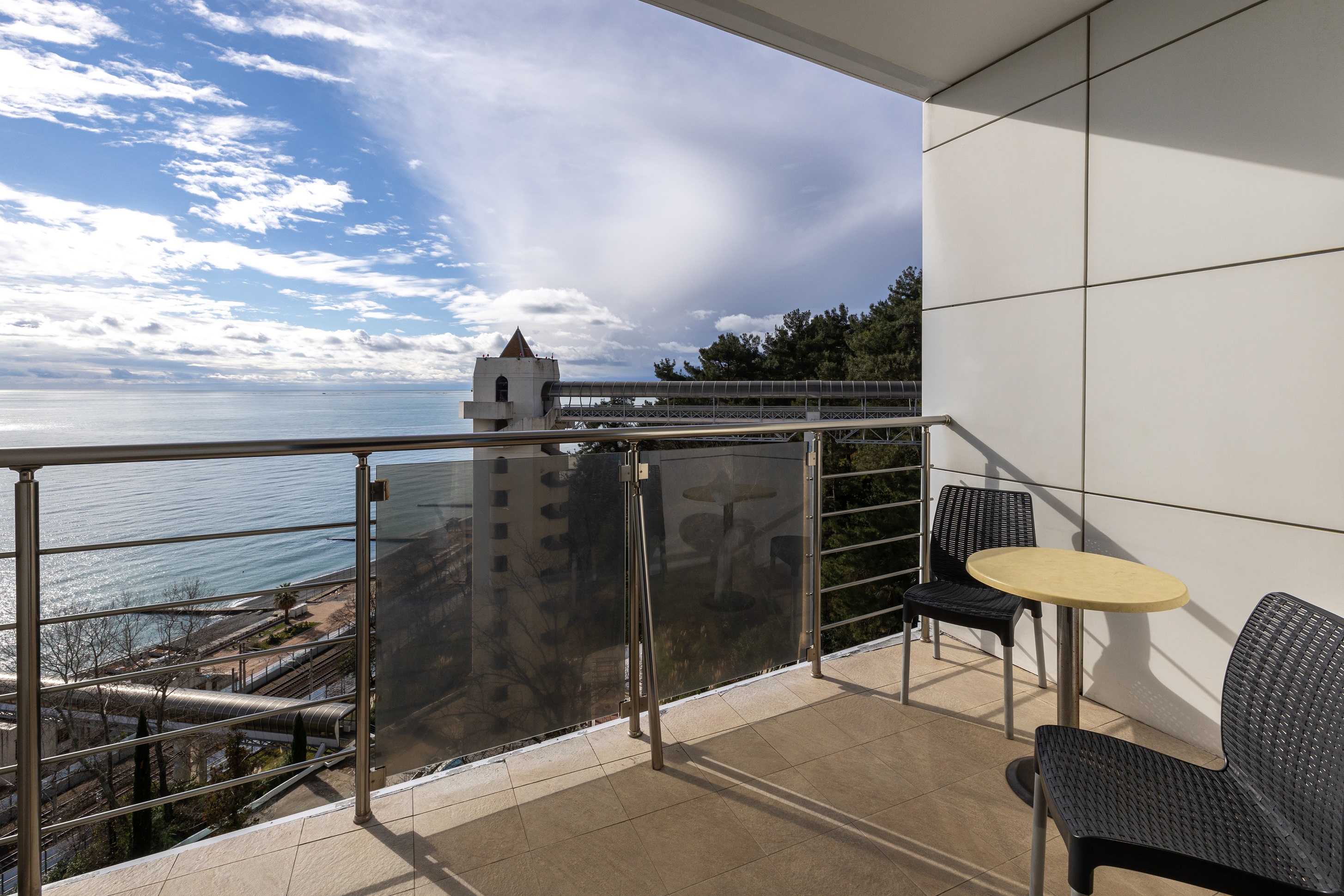 К услугам туристов – поселковая инфраструктура: магазины и рынок, кафе и ресторанчики, а для любителей ночных развлечений – диско-бары.На курорте важно полноценное питание. «Шведский стол» в санаторной столовой – гарантия разнообразного меню по диетическим показаниями. Гостей ждет питательный завтрак, вкусный обед и сбалансированный ужин. В отдельных зданиях на территории здравницы есть кафе и травяной бар. Отдохнуть приятно в комфортных кондиционированных номерах. Приехать можно с детьми: с 2-летнего возраста, с 4-летнего – с путевкой на лечение. Для родительского комфорта есть помощники: детские аниматоры, воспитатель и няня. Дети будут присмотрены и заняты: на детской площадке, в бассейне для маленьких, в игровой комнате или на водных аттракционах с горкой. Море, главная достопримечательность находится в 100 м. Достоинство здравницы – свой оборудованный пляж протяженностью 500 м с крупной и мелкой галькой, спуститься к которому можно на панорамном лифте. Пляж оборудован всем необходимым для полноценного отдыха.