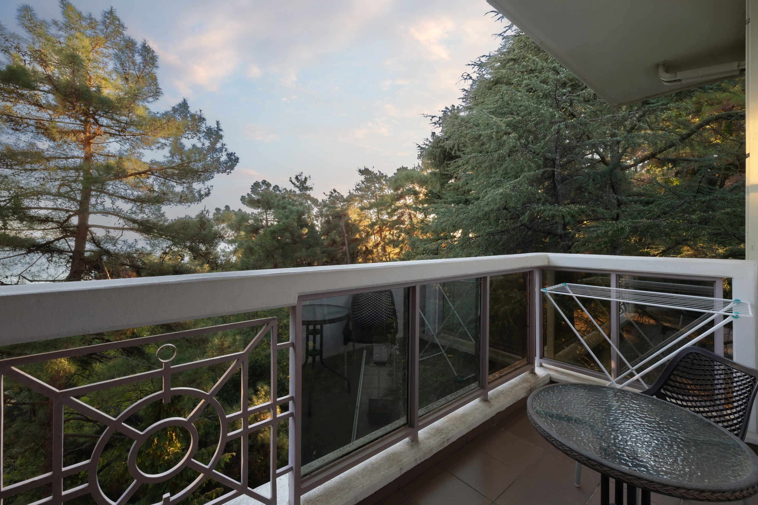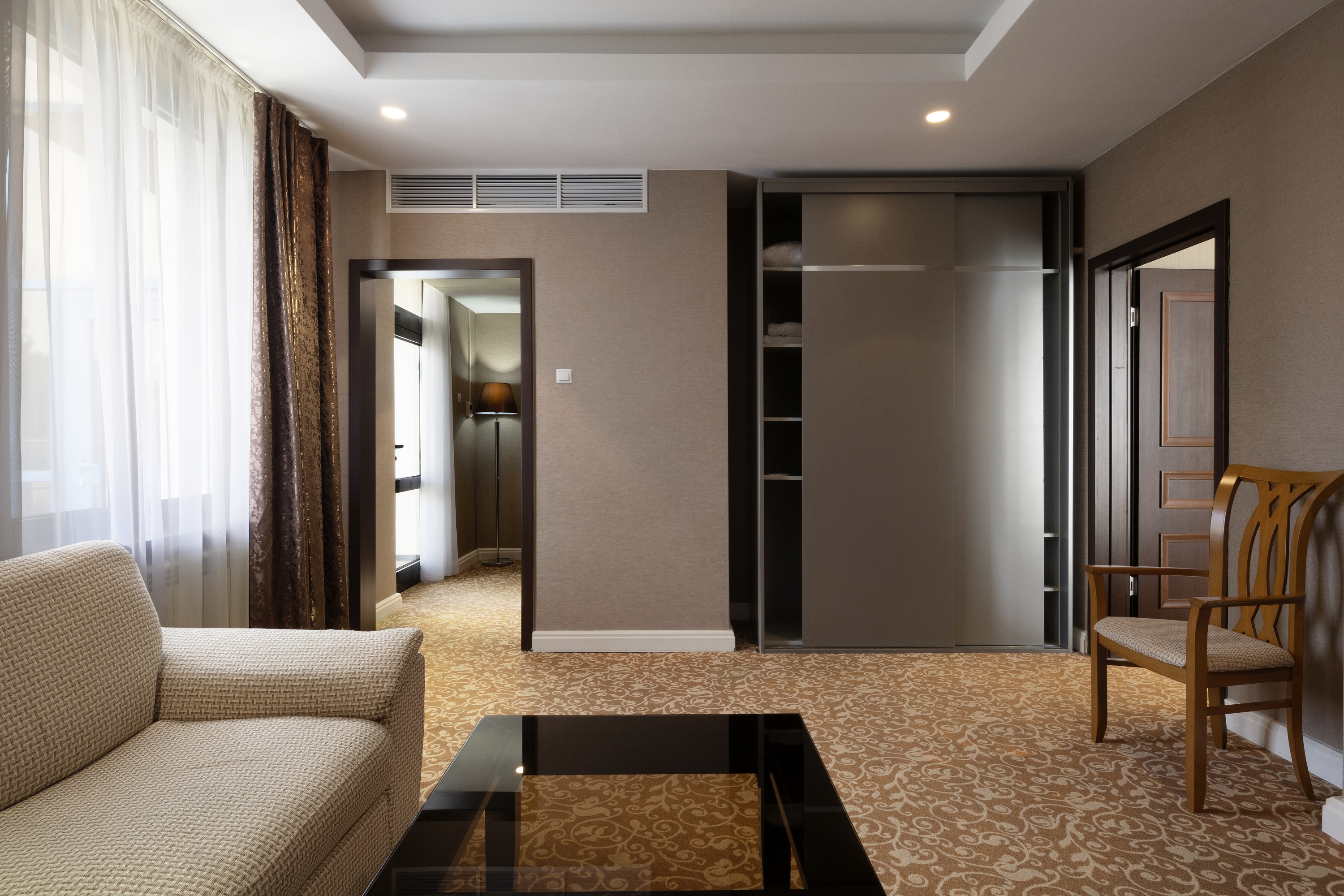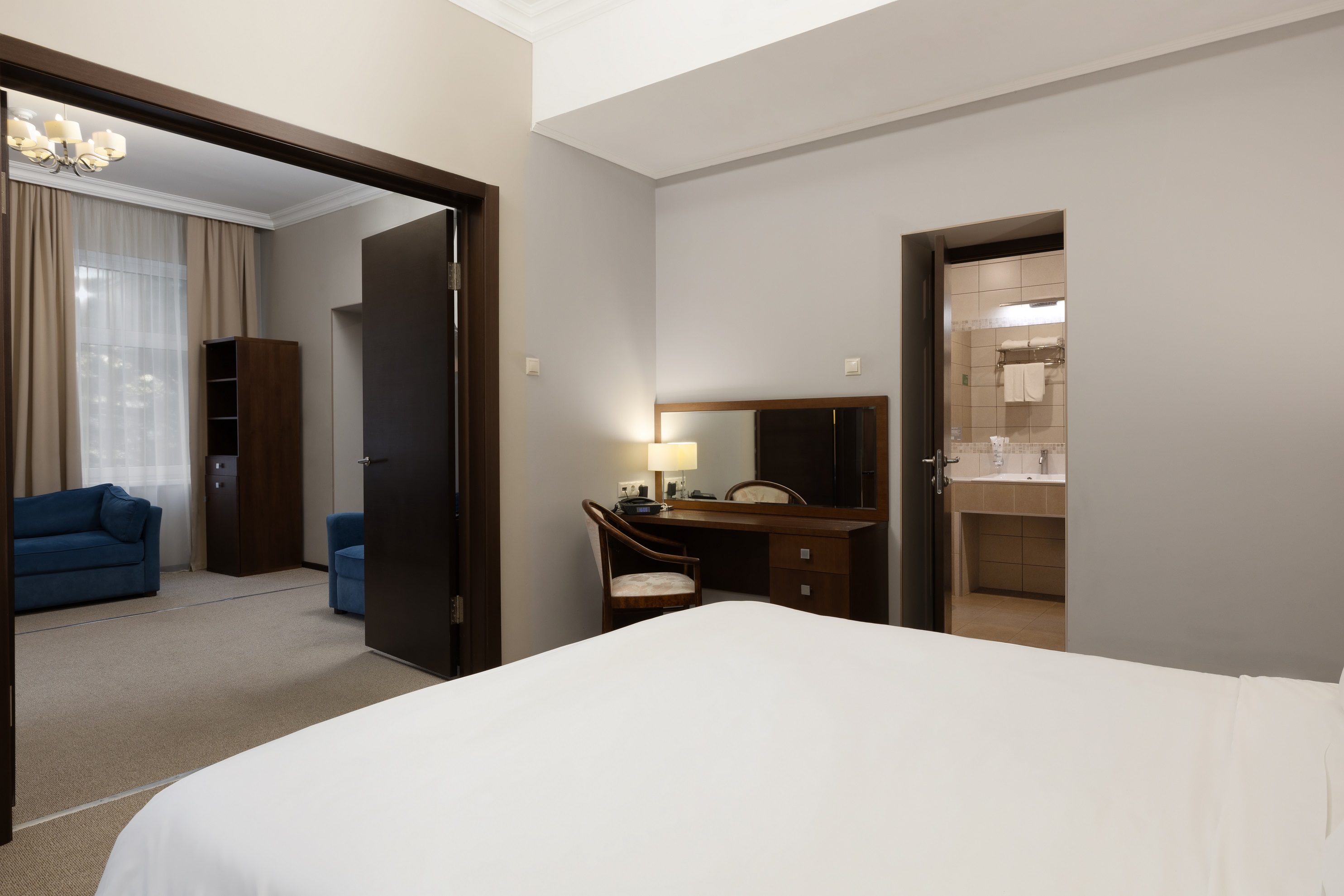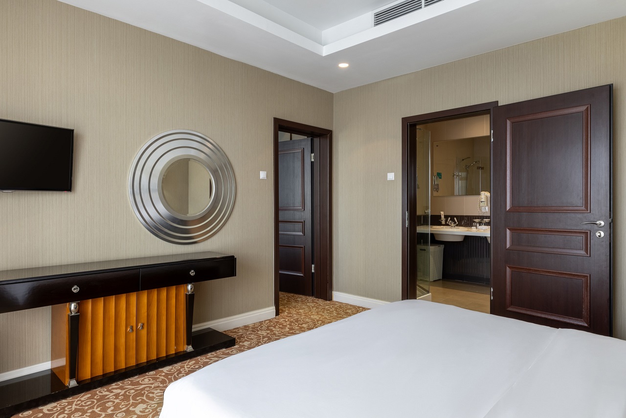 В номере: вешалка, зеркало, кресло, кровать двуспальная, прикроватные тумбочки, столик кофейный, стулья, шкаф-купе, сейф, система общего кондиционирования, телевизор ЖК, телефон, холодильник, чайная станция, чайный набор посуды