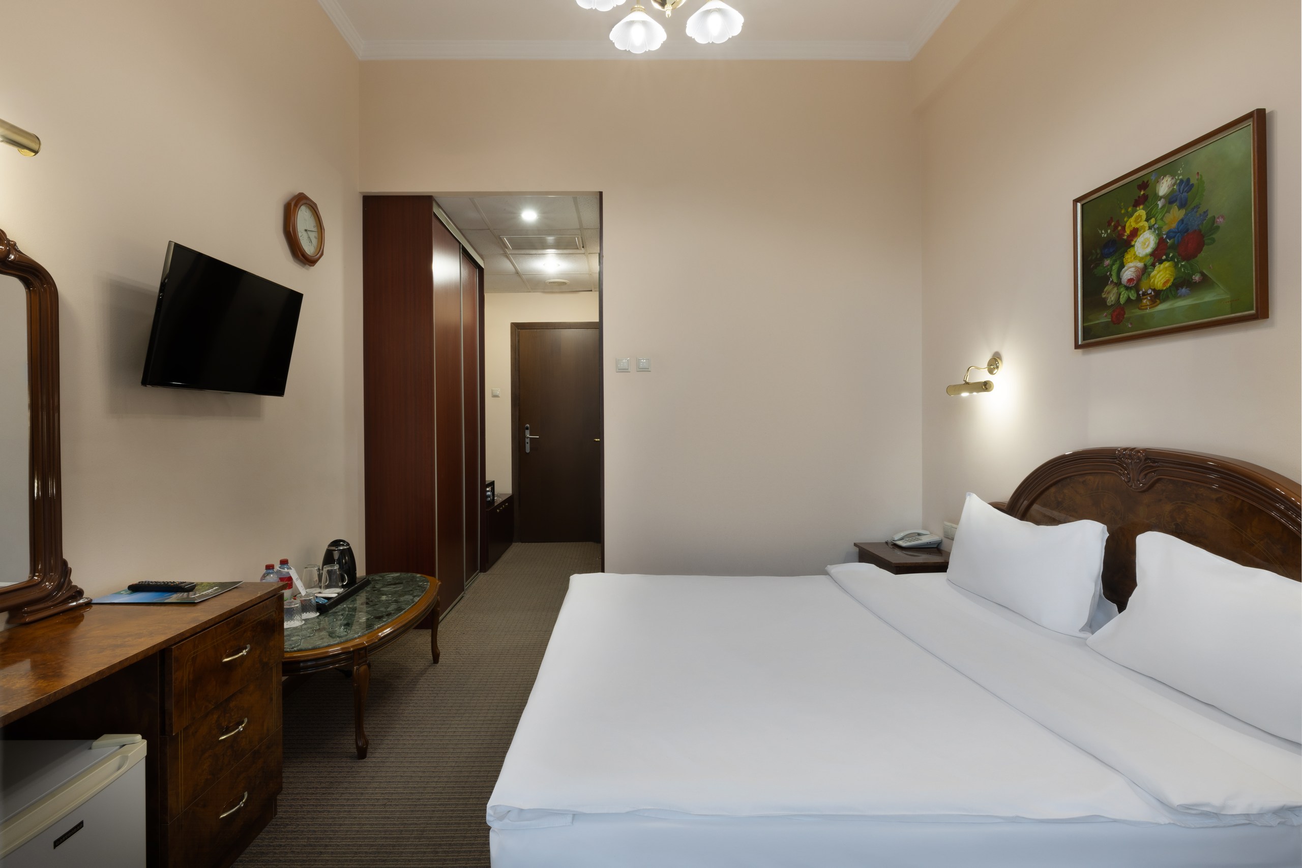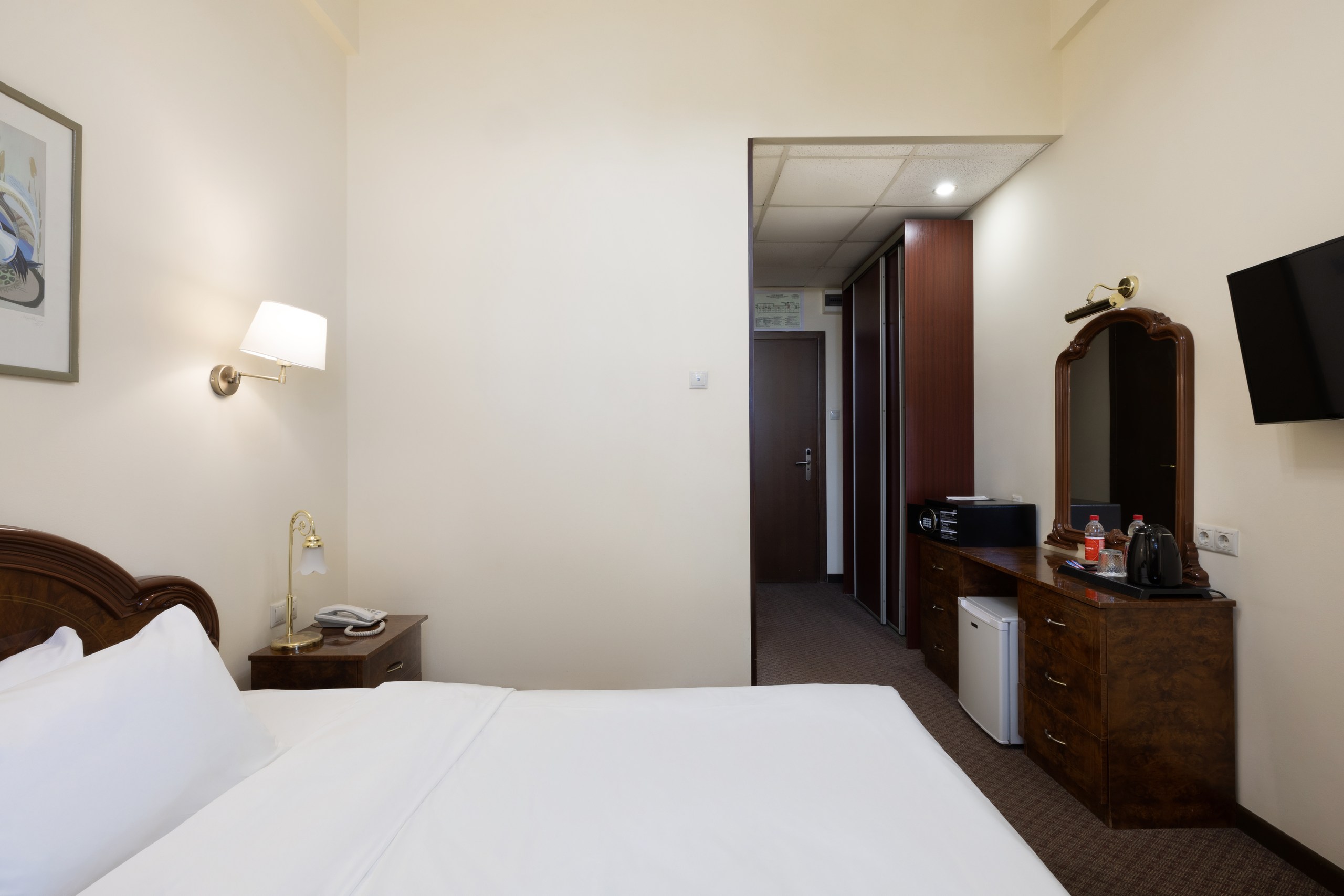 В номере: вешалка, зеркало, кресло, кровать двуспальная, прикроватные тумбочки, столик журнальный, шкаф-купе, сейф, система общего кондиционирования, телевизор ЖК, телефон, холодильник, чайная станция, чайный набор посуды