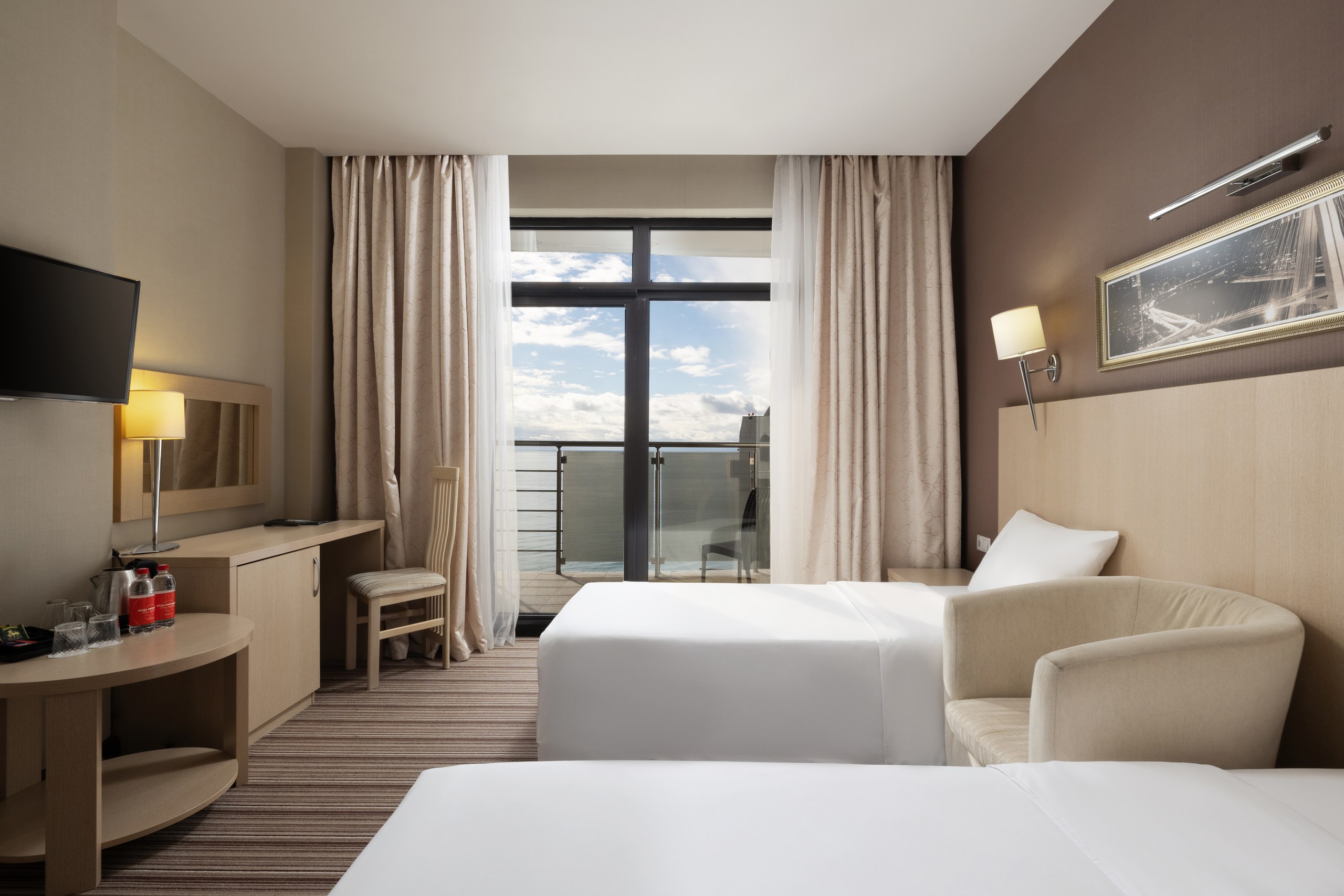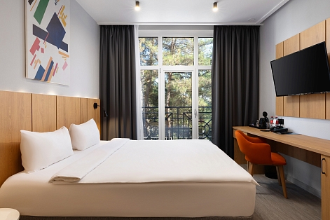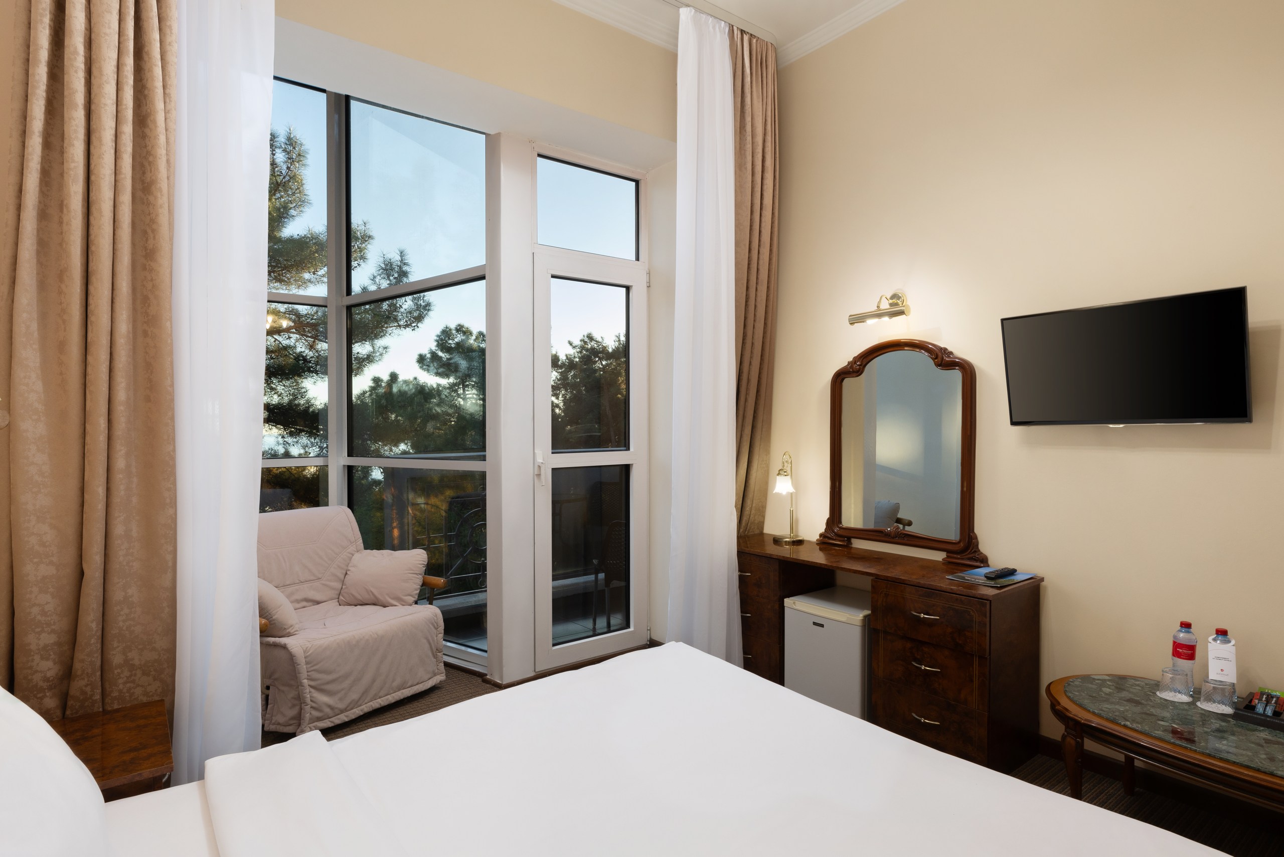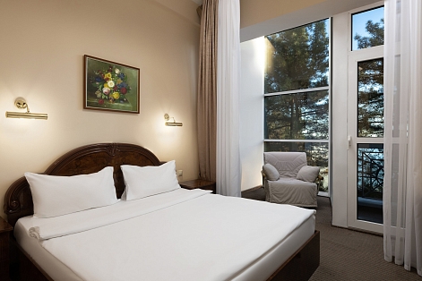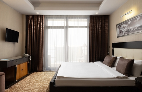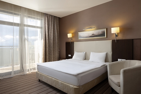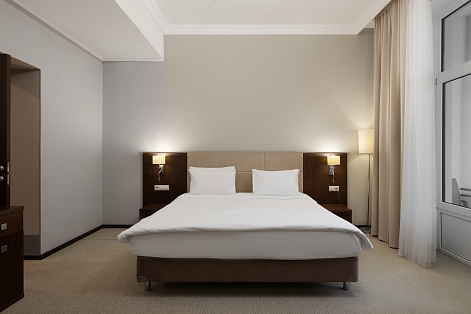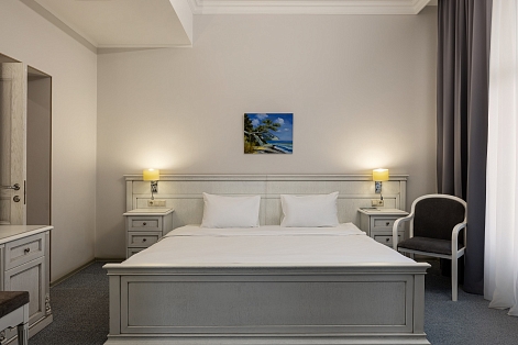 В номере: вешалка, зеркало, кресло, кровать двуспальная, прикроватная тумбочка, стол, столик журнальный, стул, шкаф-купе, сейф, система общего кондиционирования, телевизор ЖК, телефон, холодильник, чайная станция, чайный набор посуды