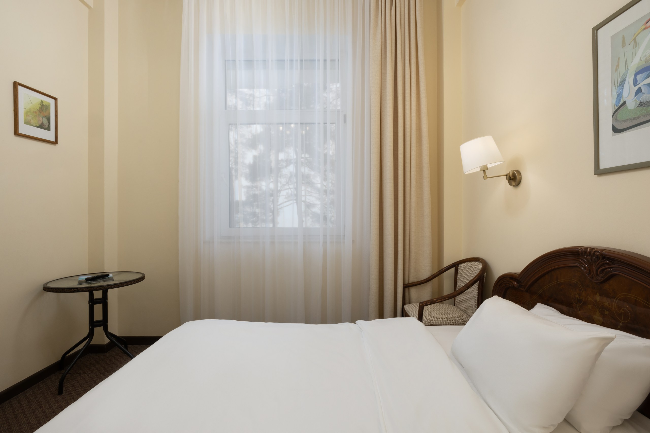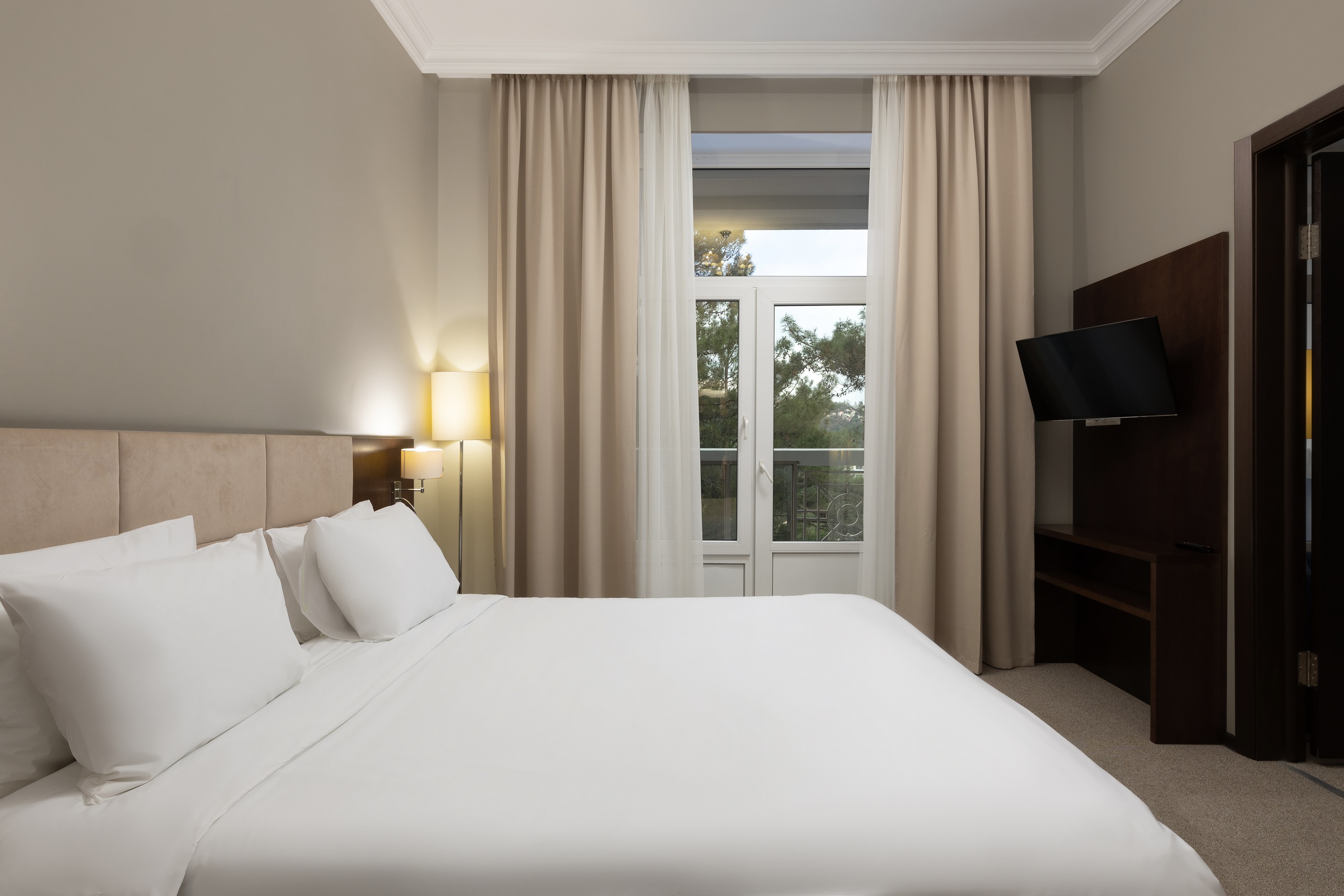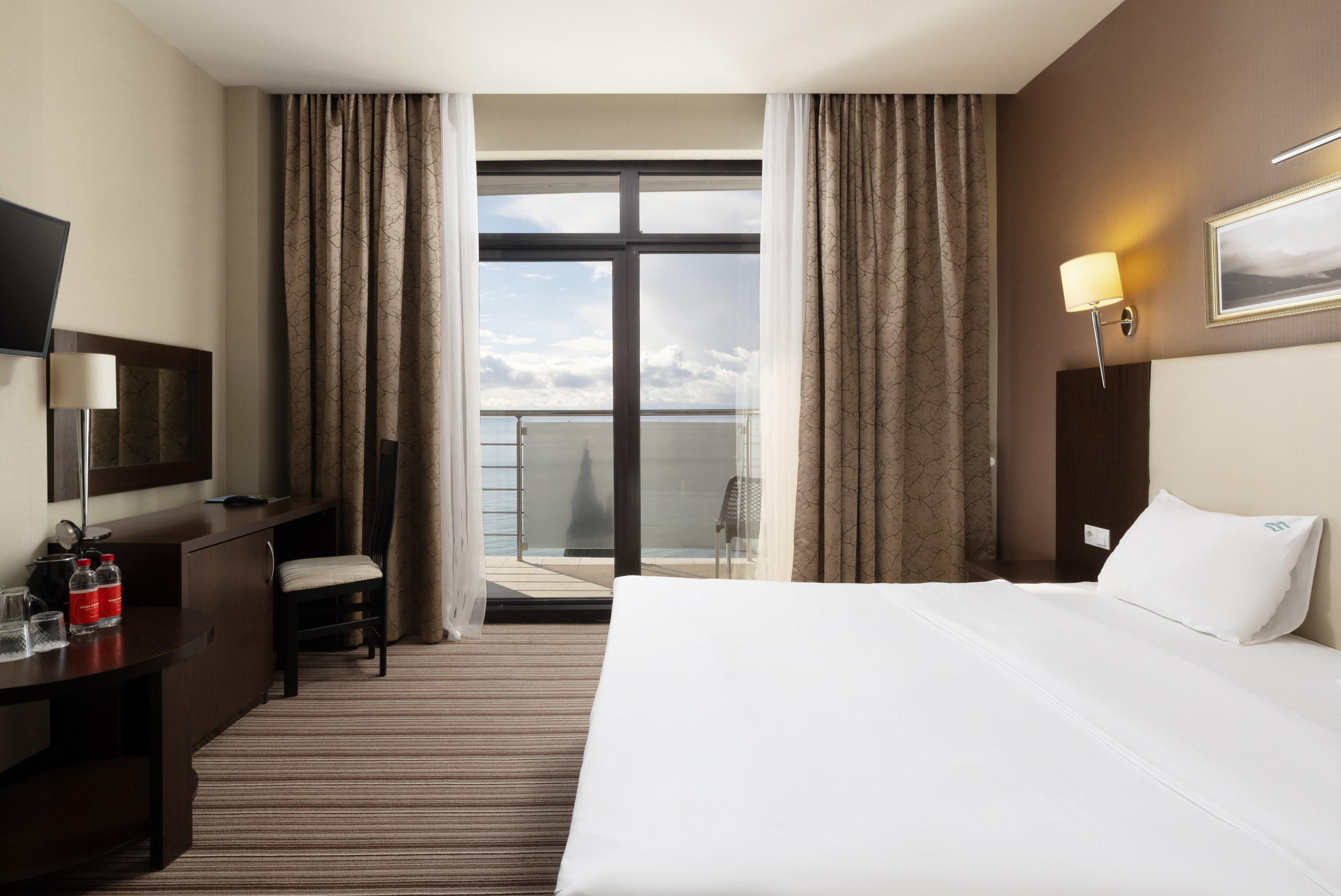 В номере: вешалка, зеркало, кресло, кровать двуспальная, прикроватная тумбочка, стол, столик журнальный, стул, шкаф-купе, сейф, система общего кондиционирования, телевизор ЖК, телефон, холодильник, чайная станция, чайный набор посуды