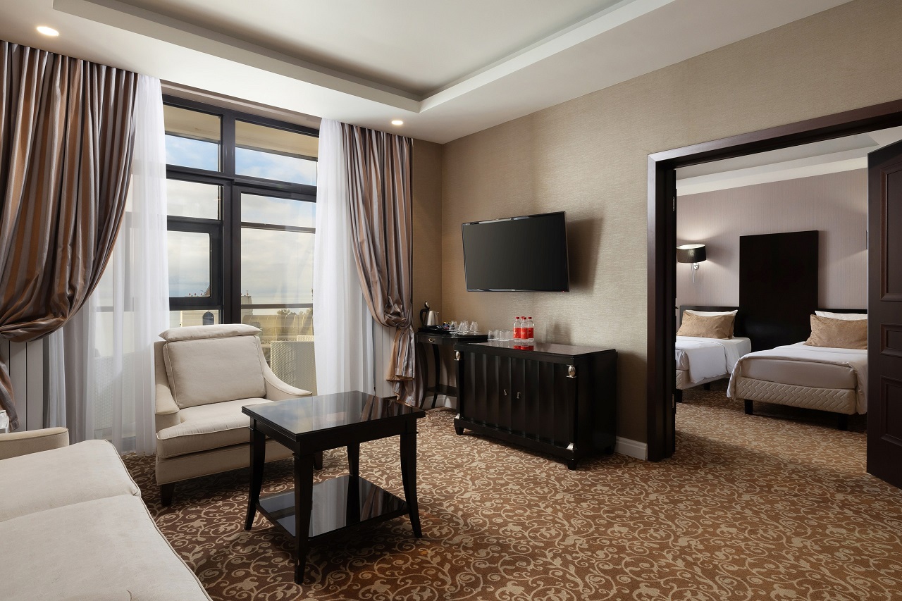 В номере: вешалка, диван, зеркало, кресло, кровати односпальные /одна двуспальная кровать, прикроватные тумбочки, стол, столик журнальный, стулья, шкаф-купе, сейф, система общего кондиционирования, телевизор ЖК, телефон, холодильник, чайная станция, чайный набор посуды