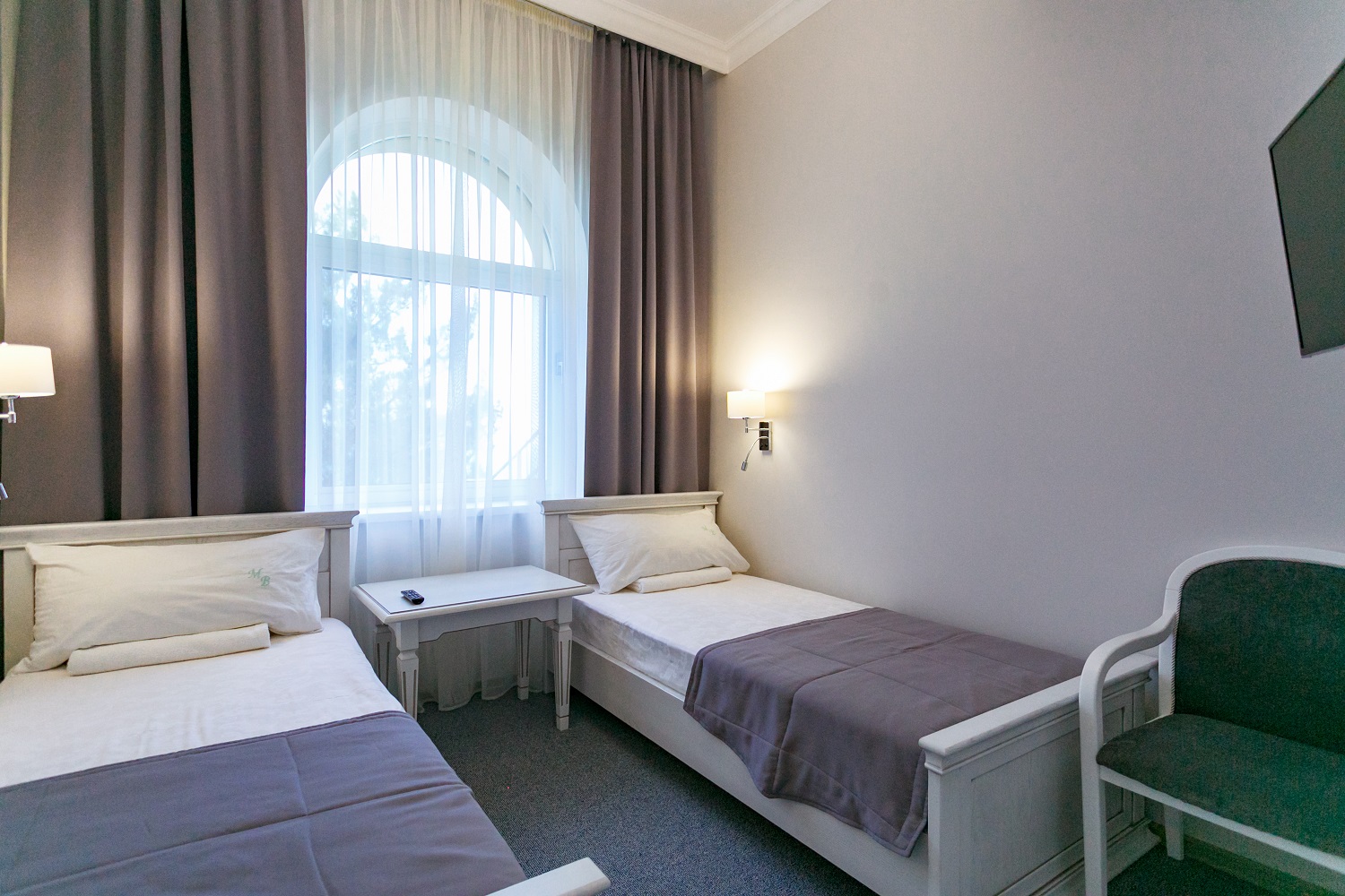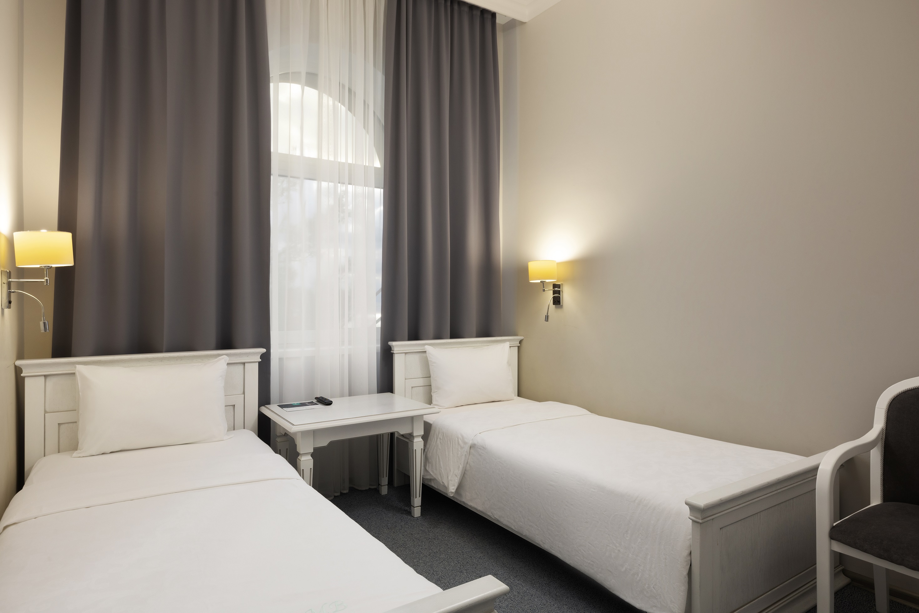 В номере: вешалка, зеркало, кресло, кровати односпальные, прикроватные тумбочки, столик журнальный, шкаф-купе, сейф, система общего кондиционирования, телевизор ЖК, телефон, холодильник, чайная станция, чайный набор посуды