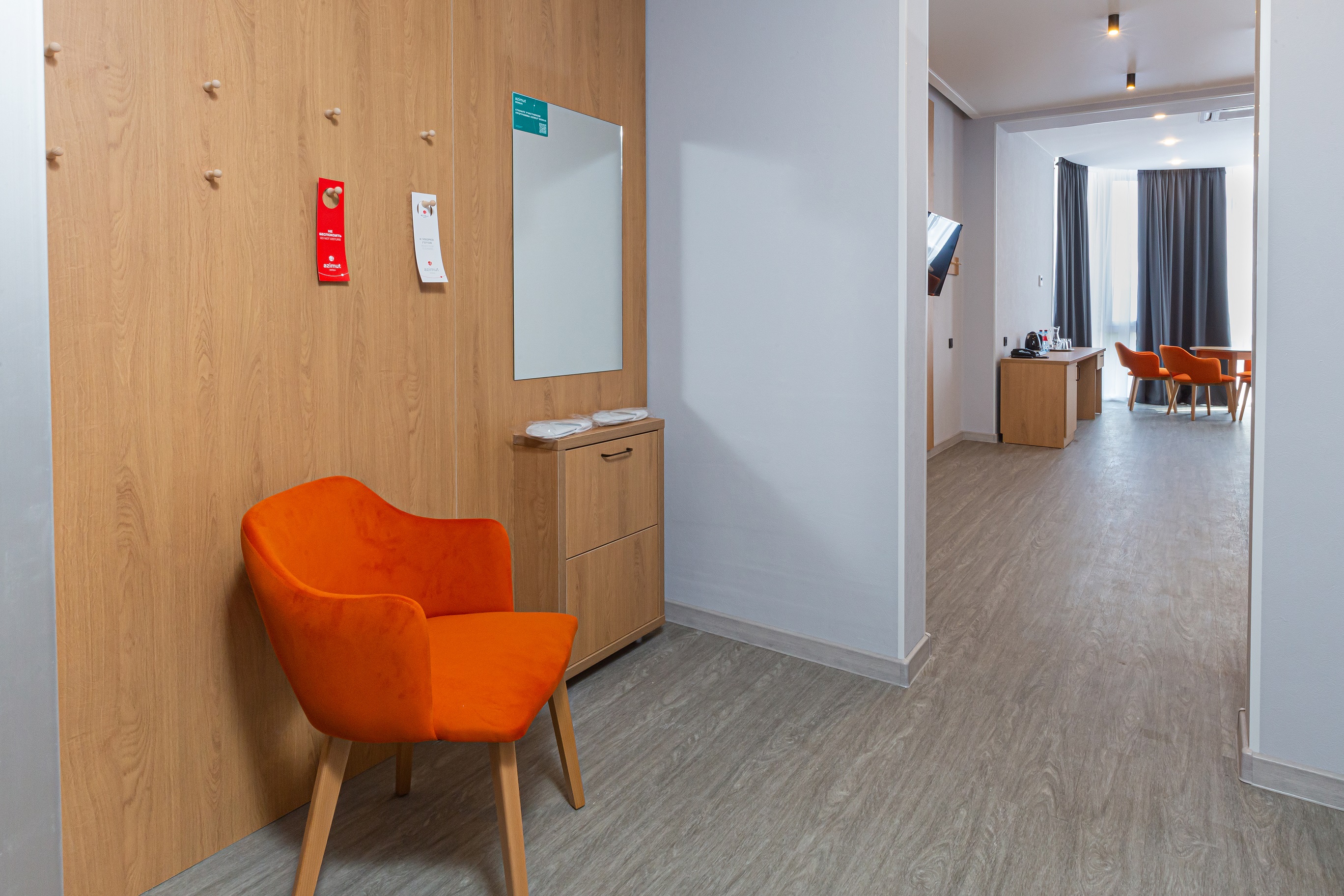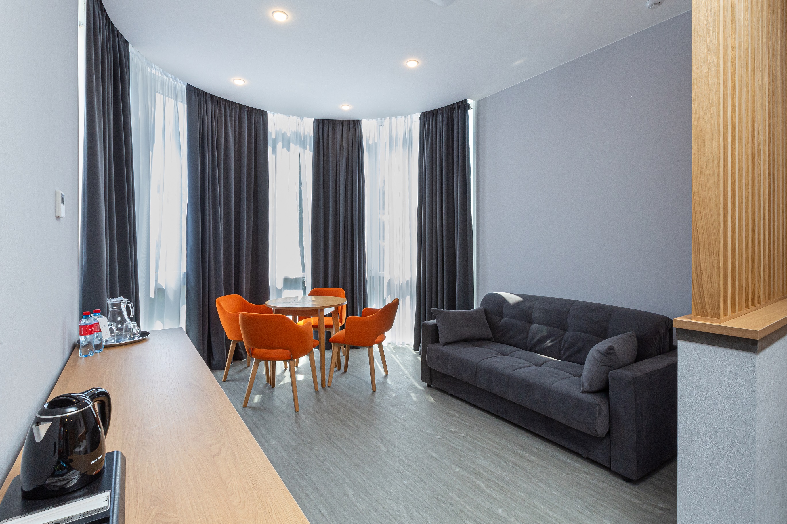 В номере: вешалка, диван раскладной, зеркало, кровати односпальные /одна двуспальная кровать, прикроватные столики, стол, стулья, шкаф, сейф, система общего кондиционирования, телевизор ЖК, телефон, холодильник, чайная станция, чайный набор посуды