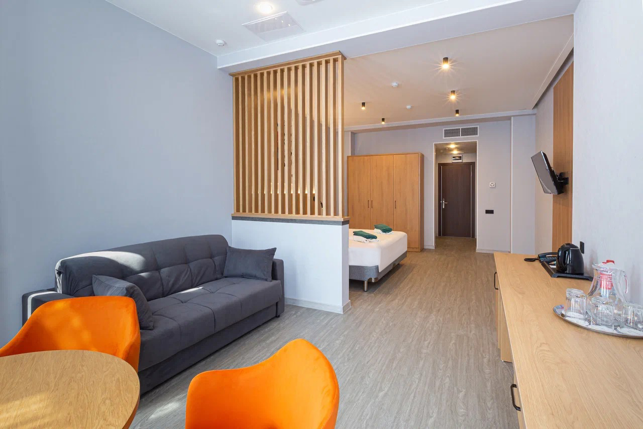 В номере: вешалка, зеркало, кресло, кровати односпальные, кровать двуспальная, кухонная мебель, набор мягкой мебели, прикроватные тумбочки, столик журнальный, стол обеденный, стулья, шкаф-купе, кондиционер, набор посуды, сплит-система, телевизор ЖК, телефон, холодильник, чайная станция